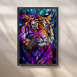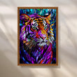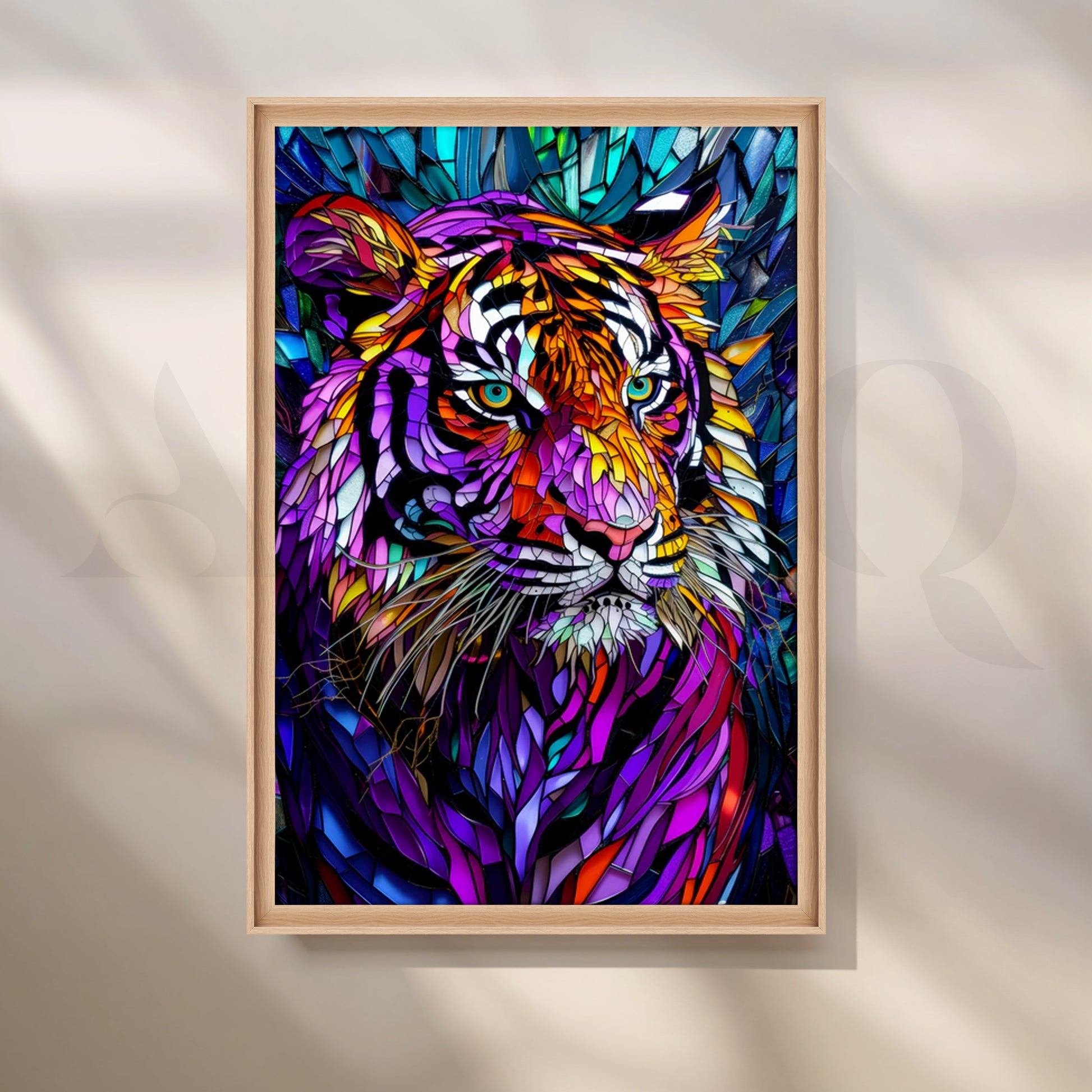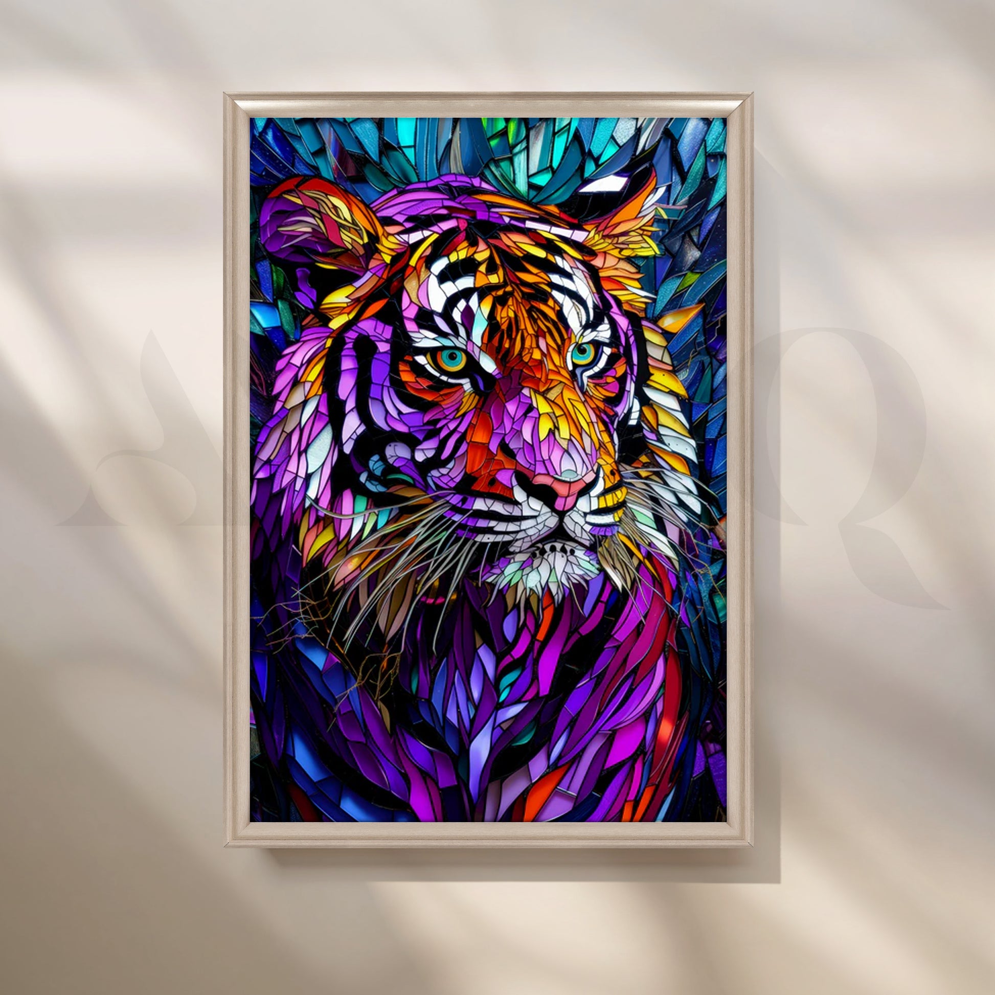 Radiate power and color with this prismatic tiger rendered in a stained-glass, mosaic style—jewel-tone purples, blues, and ember oranges forming a fierce, luminous gaze. This abstract canvas painting doubles as modern wall art and statement décor, perfect for a contemporary office, studio, or media room. The vibrant geometric patterning and high-saturation finish provide upscale gallery vibes, making it an ideal focal point for large wall art needs, modern home décor, or a sophisticated living room accent.