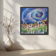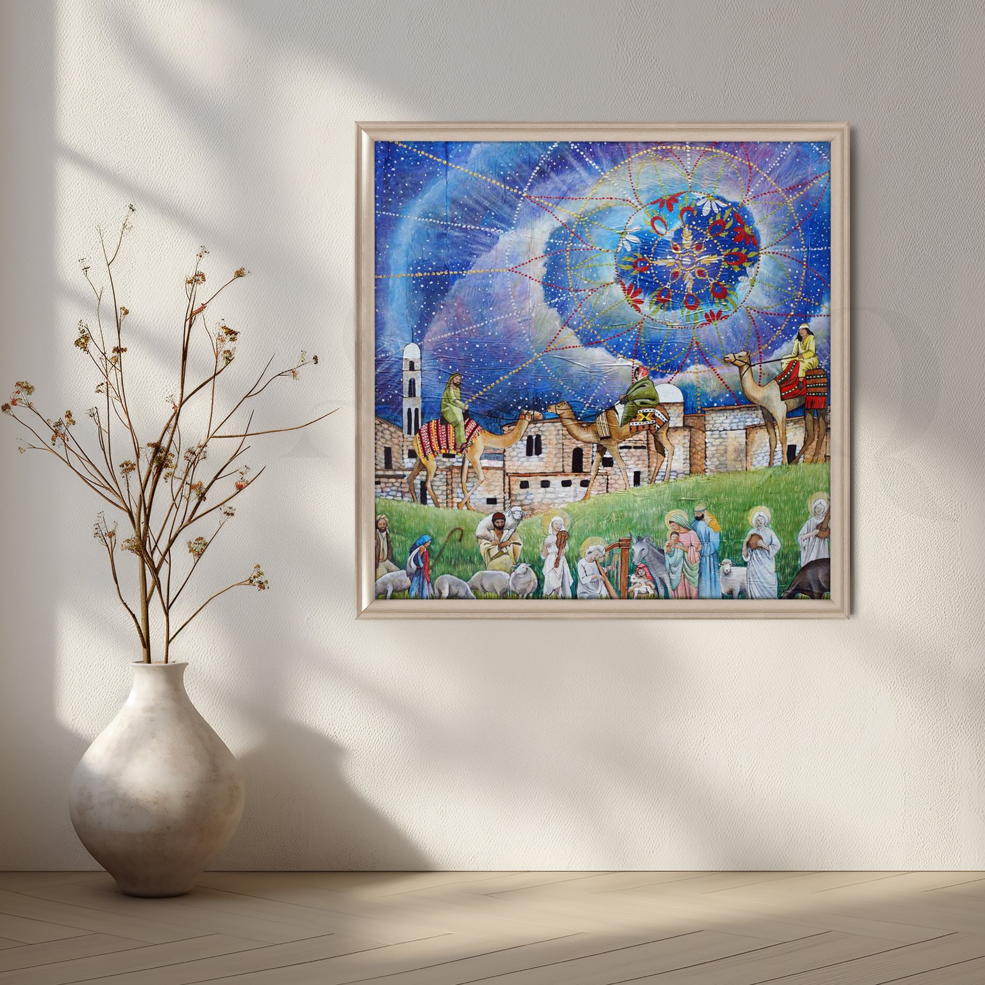 This starry caravan nativity scene canvas artwork shows camels, shepherds and village figures under a radiant celestial sky. Rich blues, detailed architecture and festive lights create storytelling wall décor for living rooms, corridors or holiday styling. A spiritual yet artistic canvas wall art that adds colour, tradition and a sense of wonder to any home.