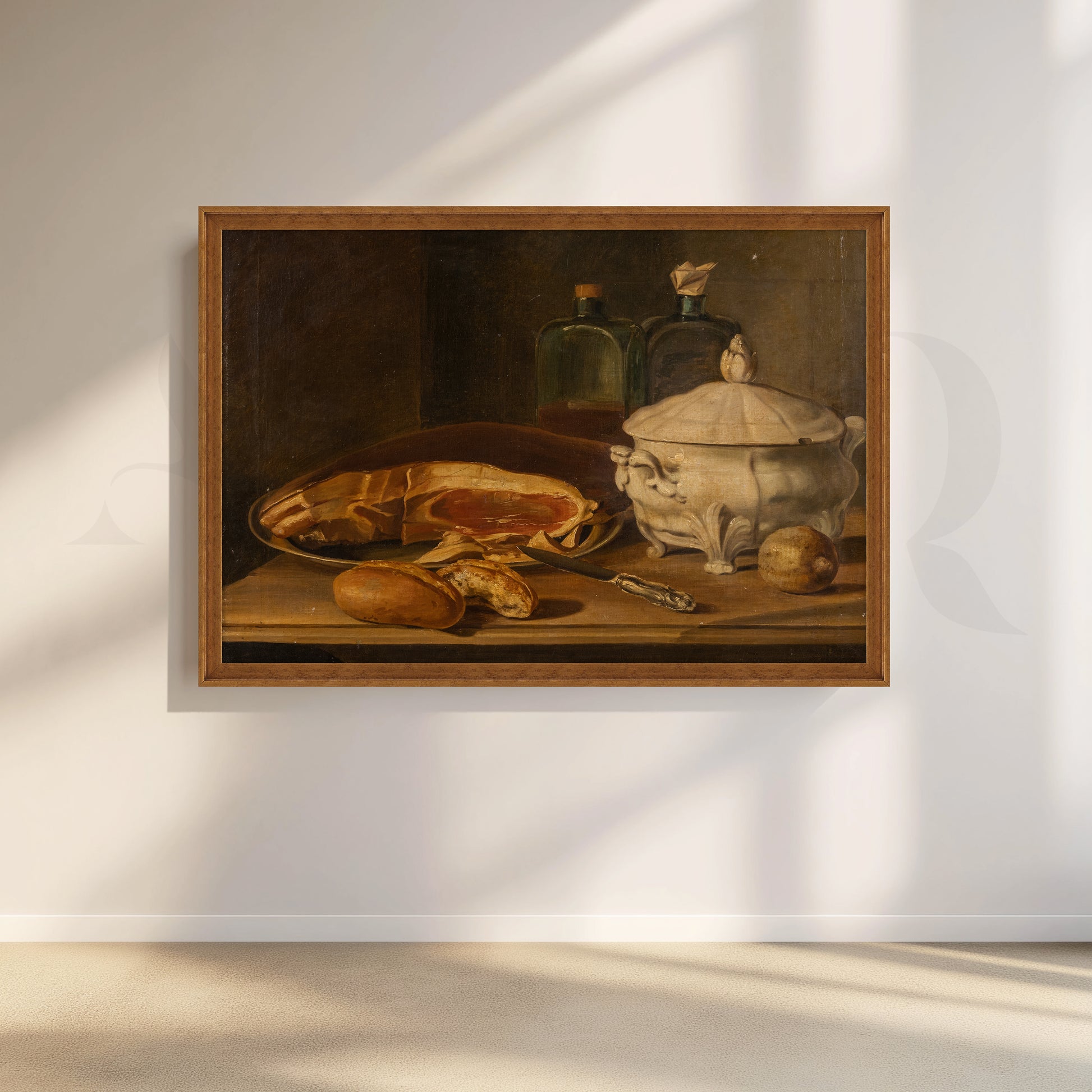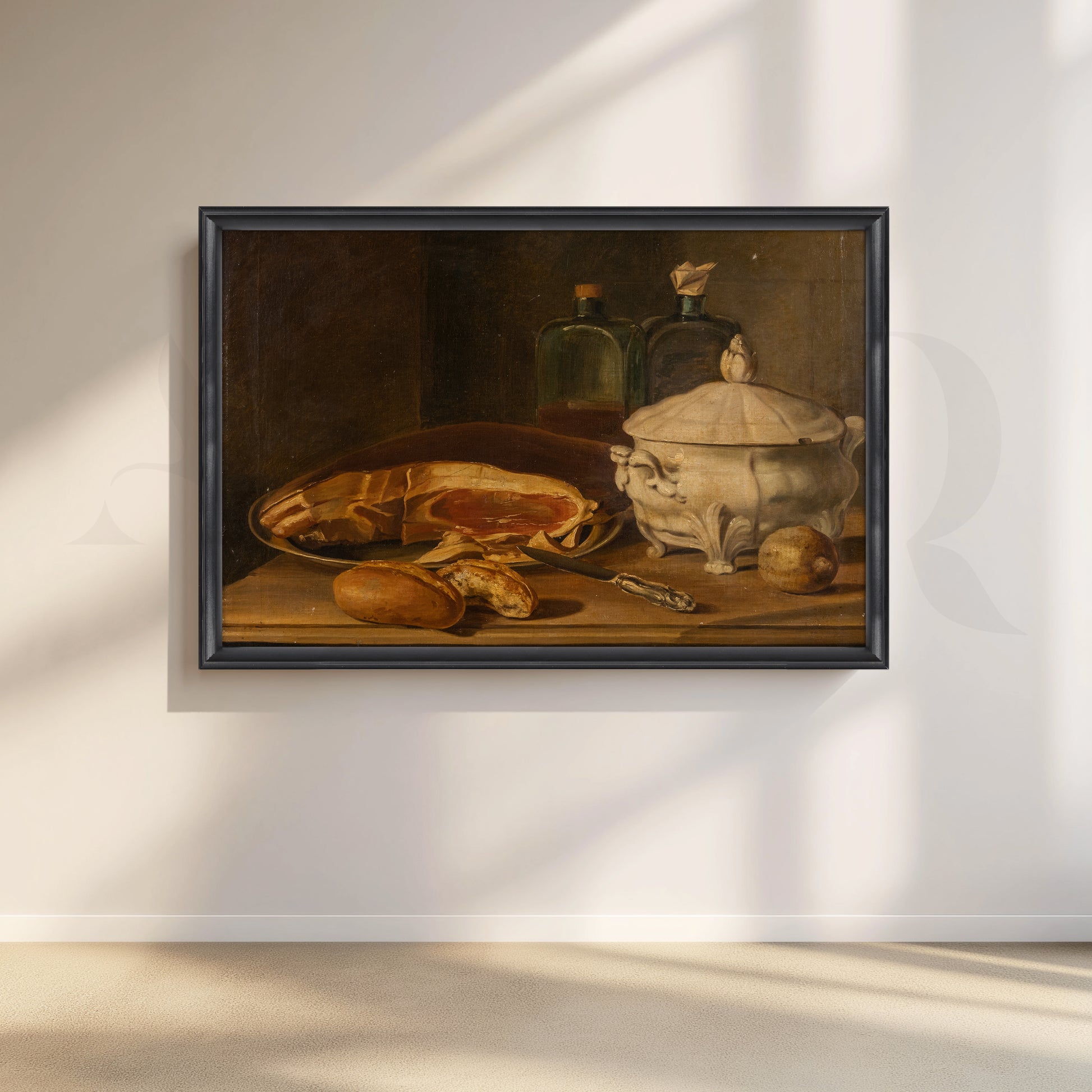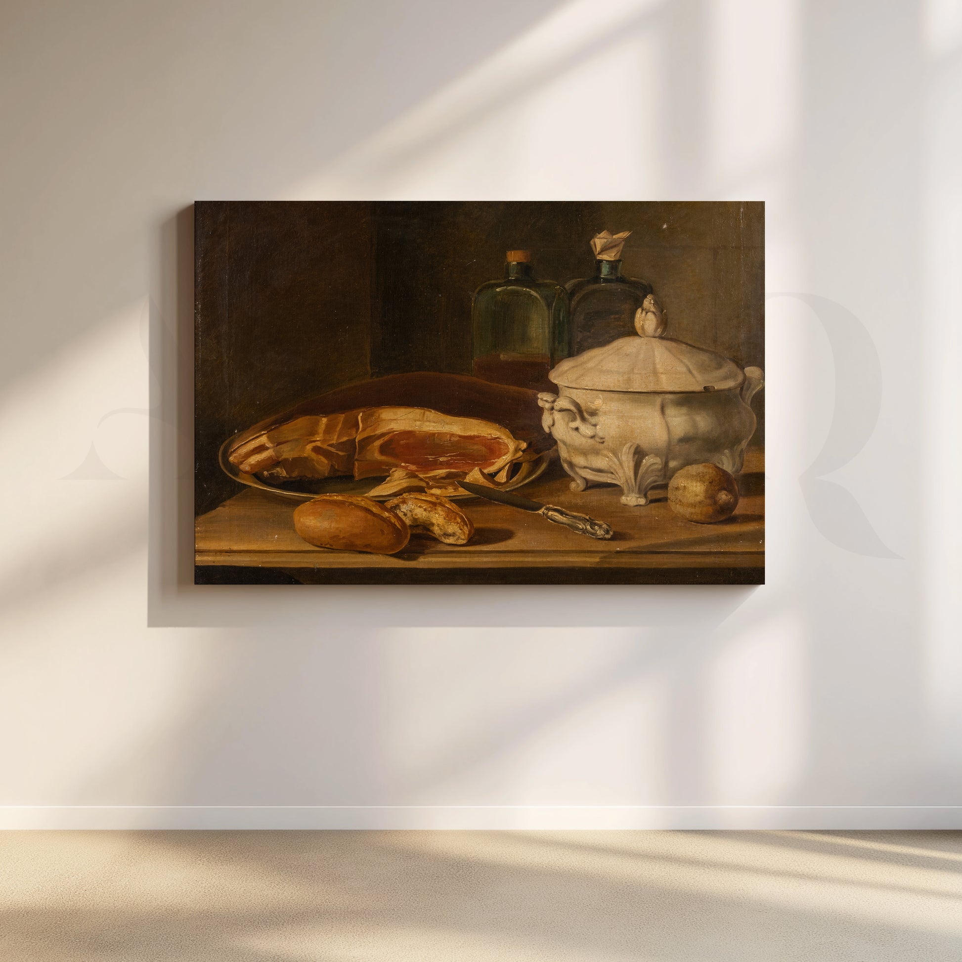 A rustic Anciq still-life artwork featuring cured ham, pottery, and vintage bottles arranged on a wooden table. Perfect for kitchens or dining spaces that embrace classic charm. Keywords: rustic still-life art, vintage kitchen painting, European food artwork, farmhouse wall decor, antique dining canvas.