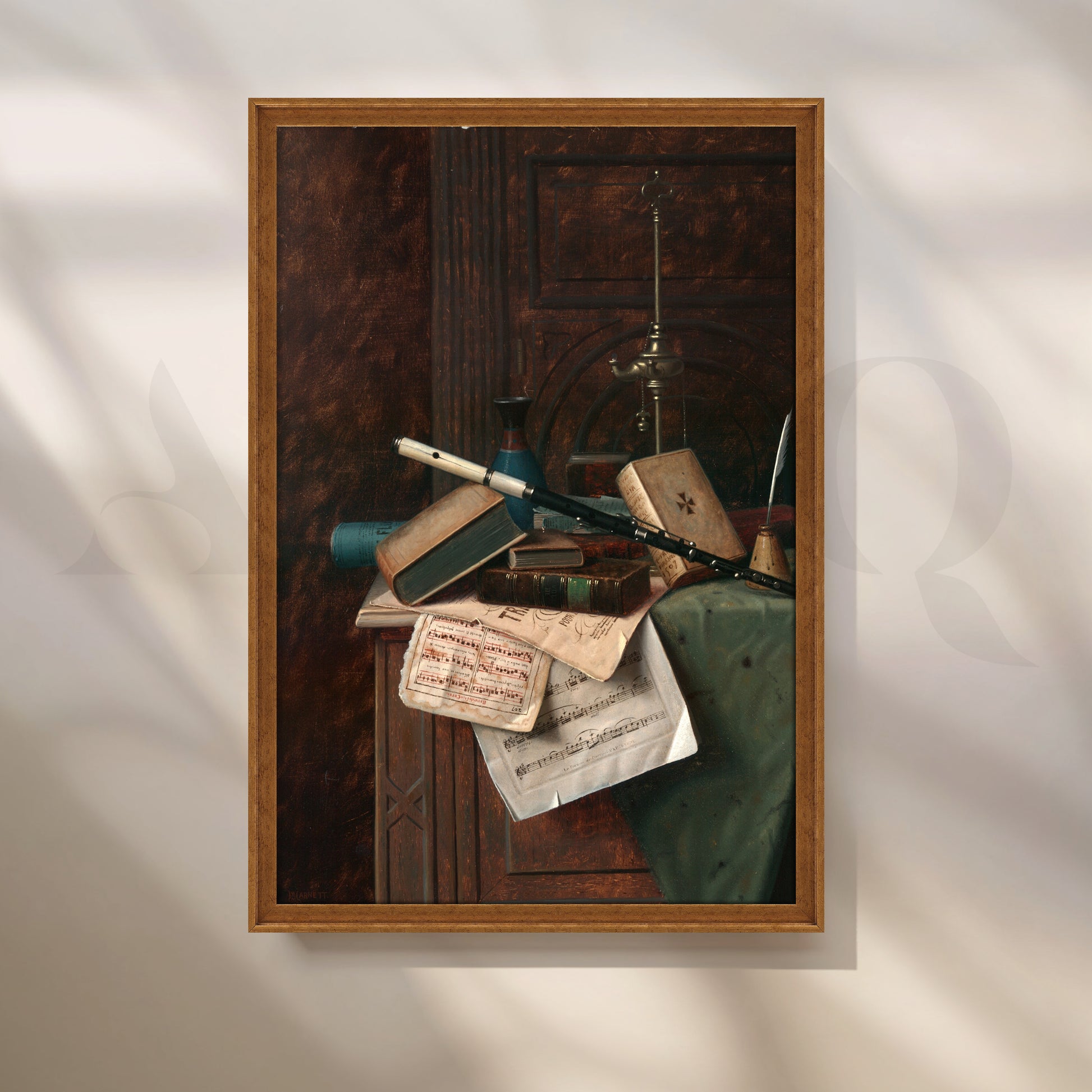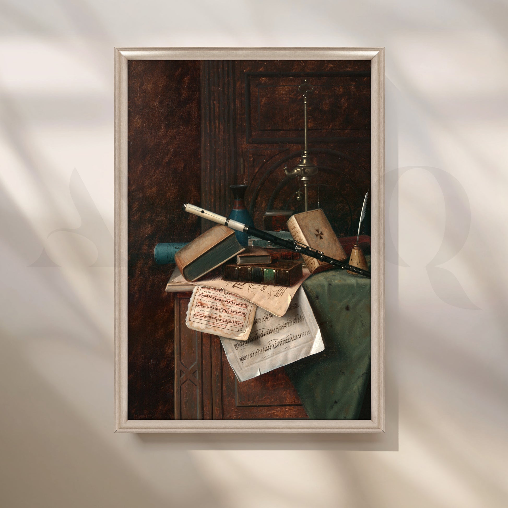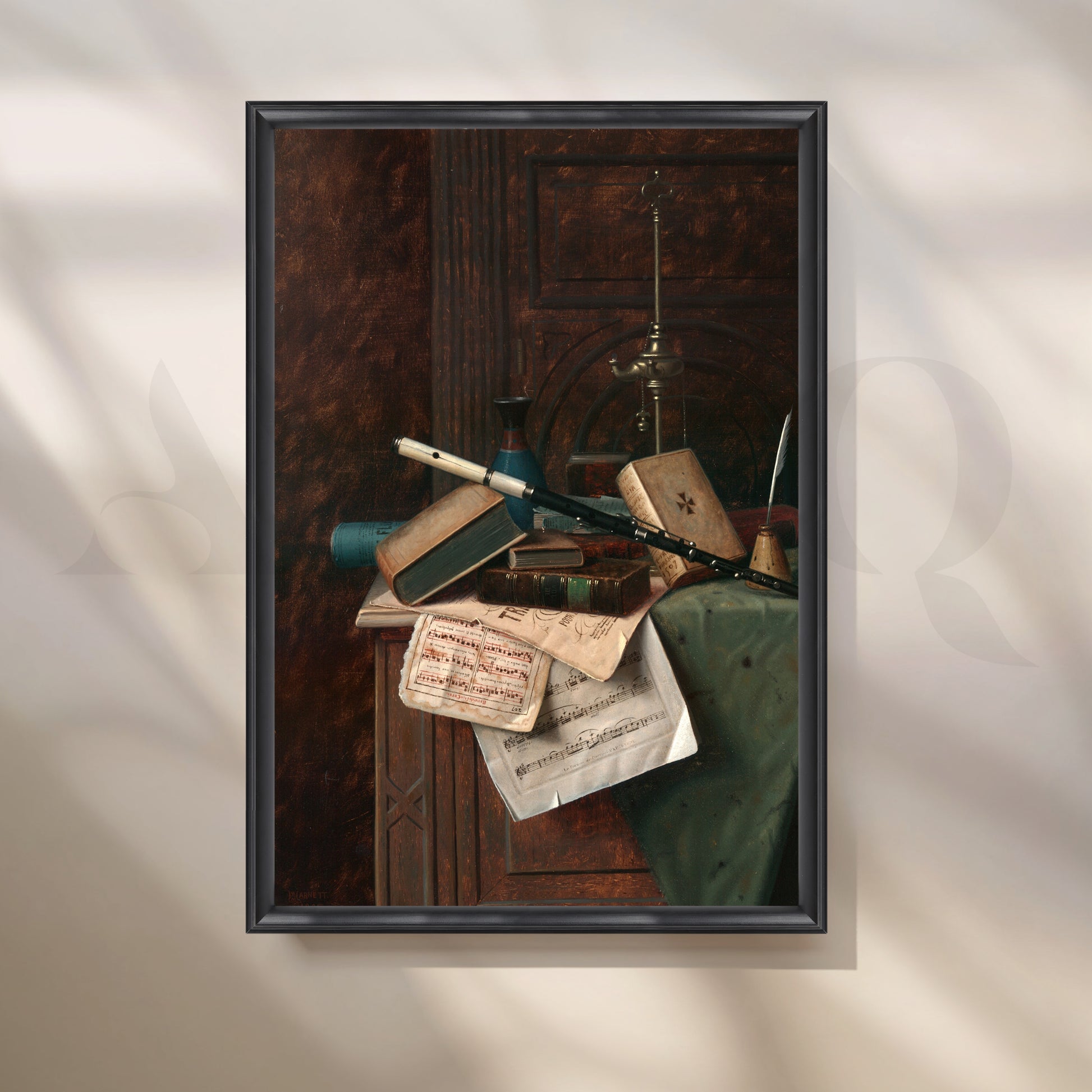 An evocative Anciq still-life featuring books, sheet music, and instruments—symbolizing intellect and creativity. Perfect for study rooms, offices, or reading corners. Keywords: classical still-life art, book and music painting, vintage study decor, cultured wall art, timeless European canvas.