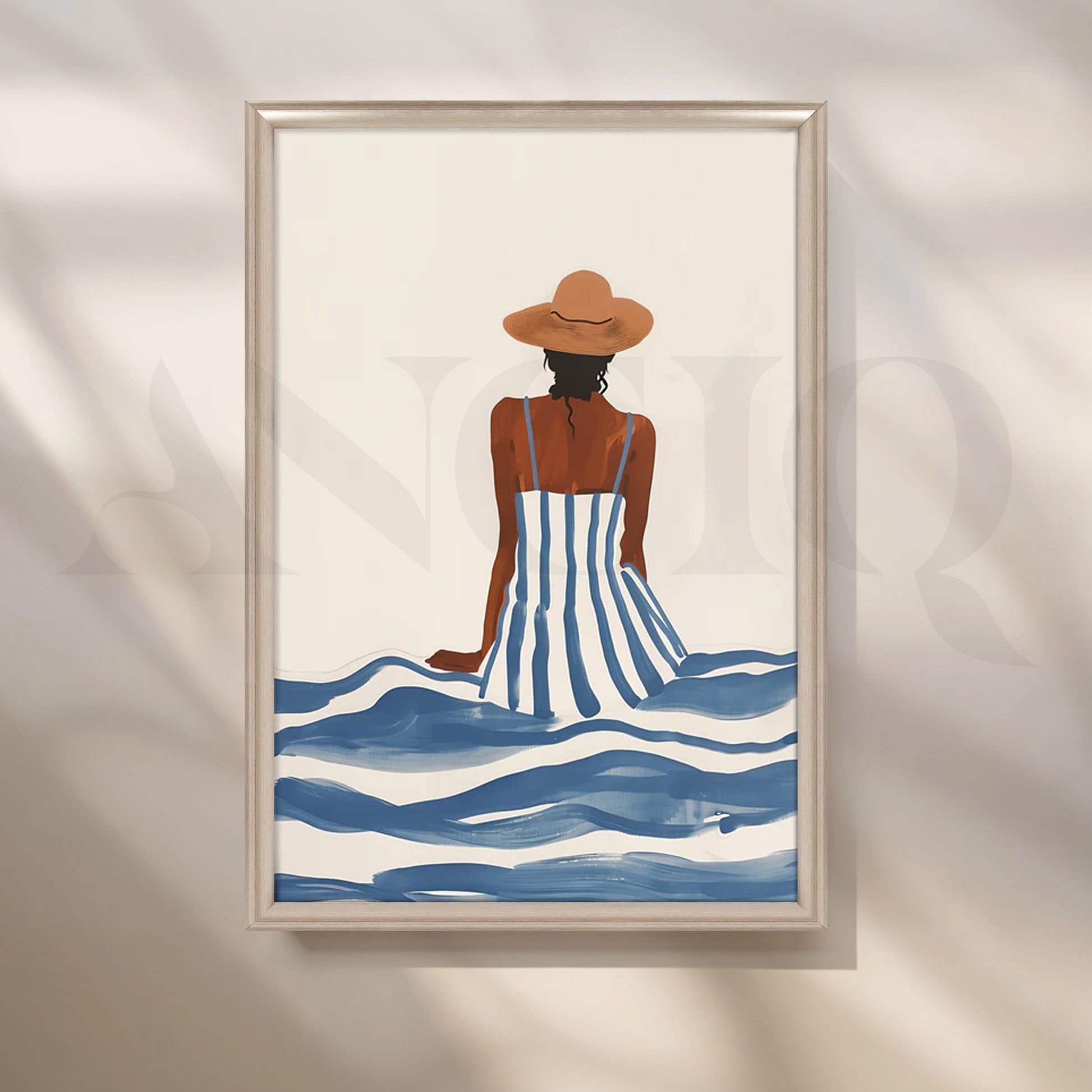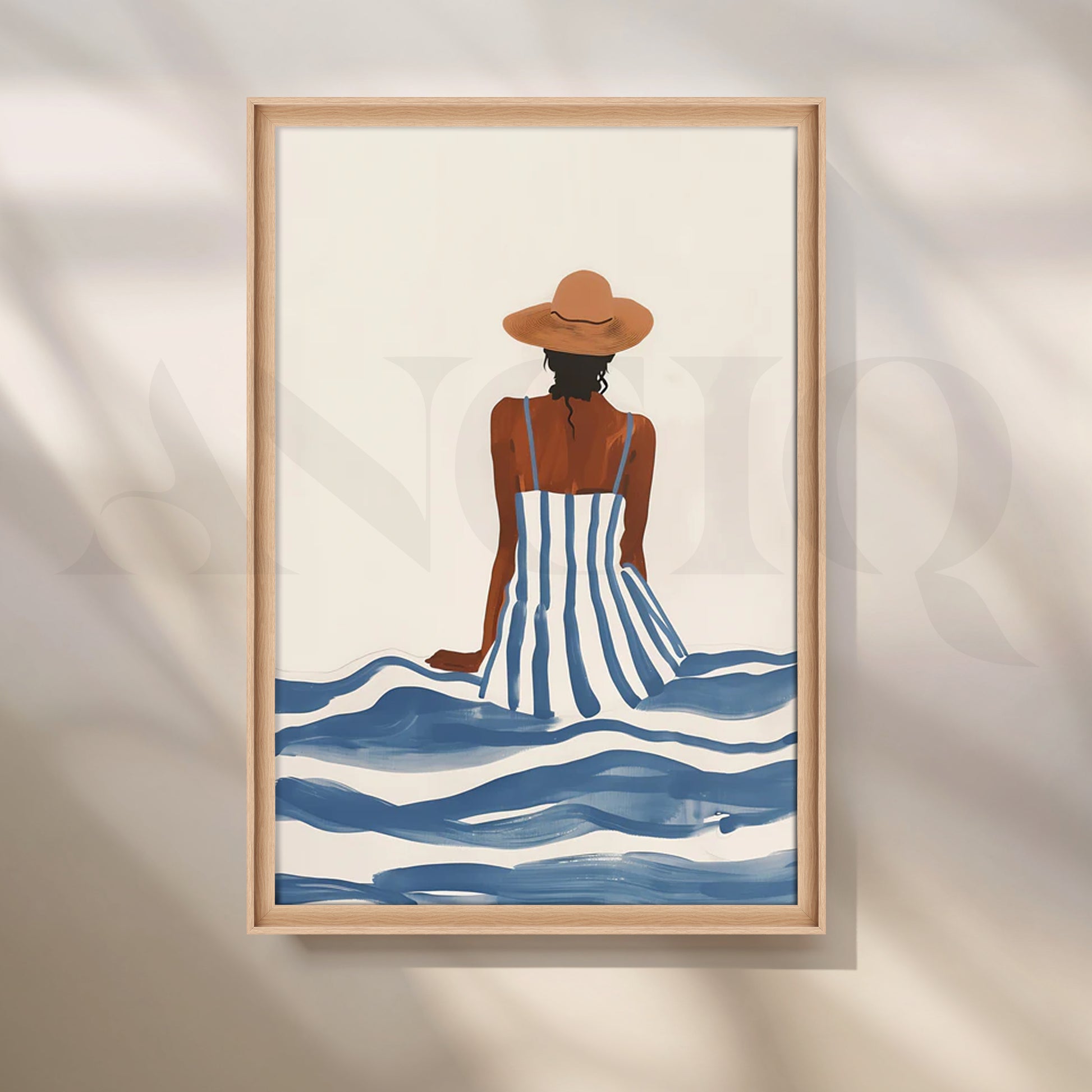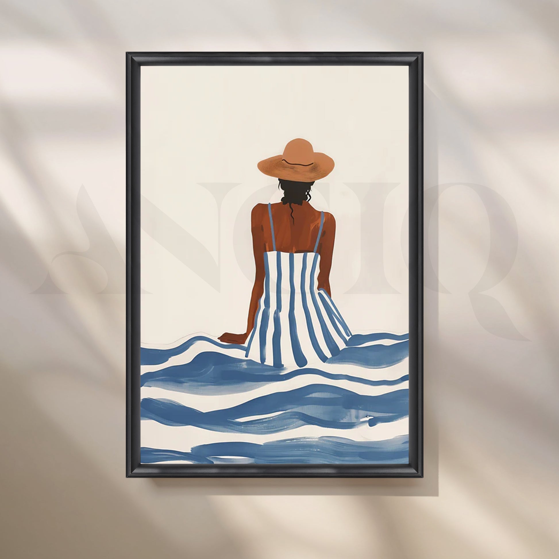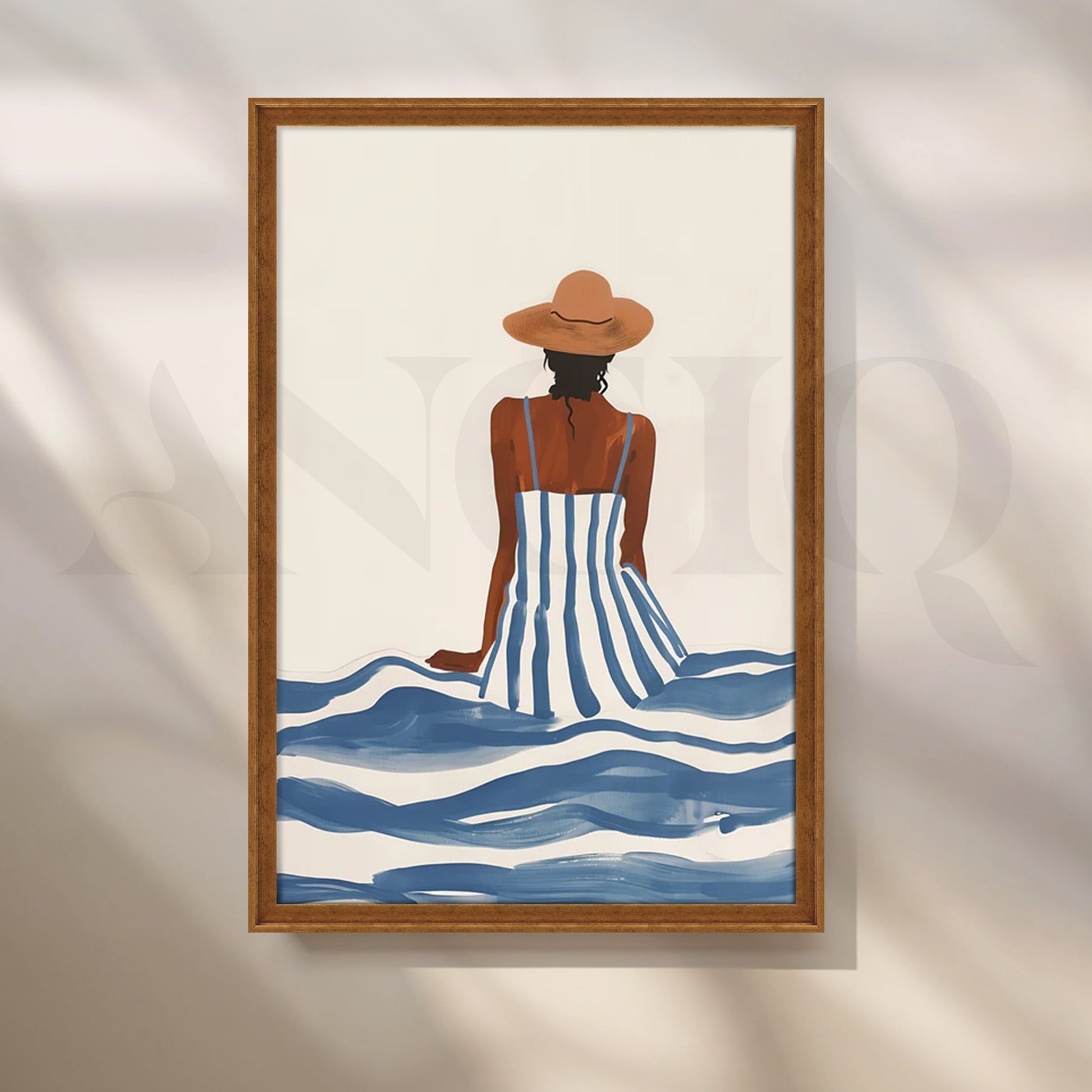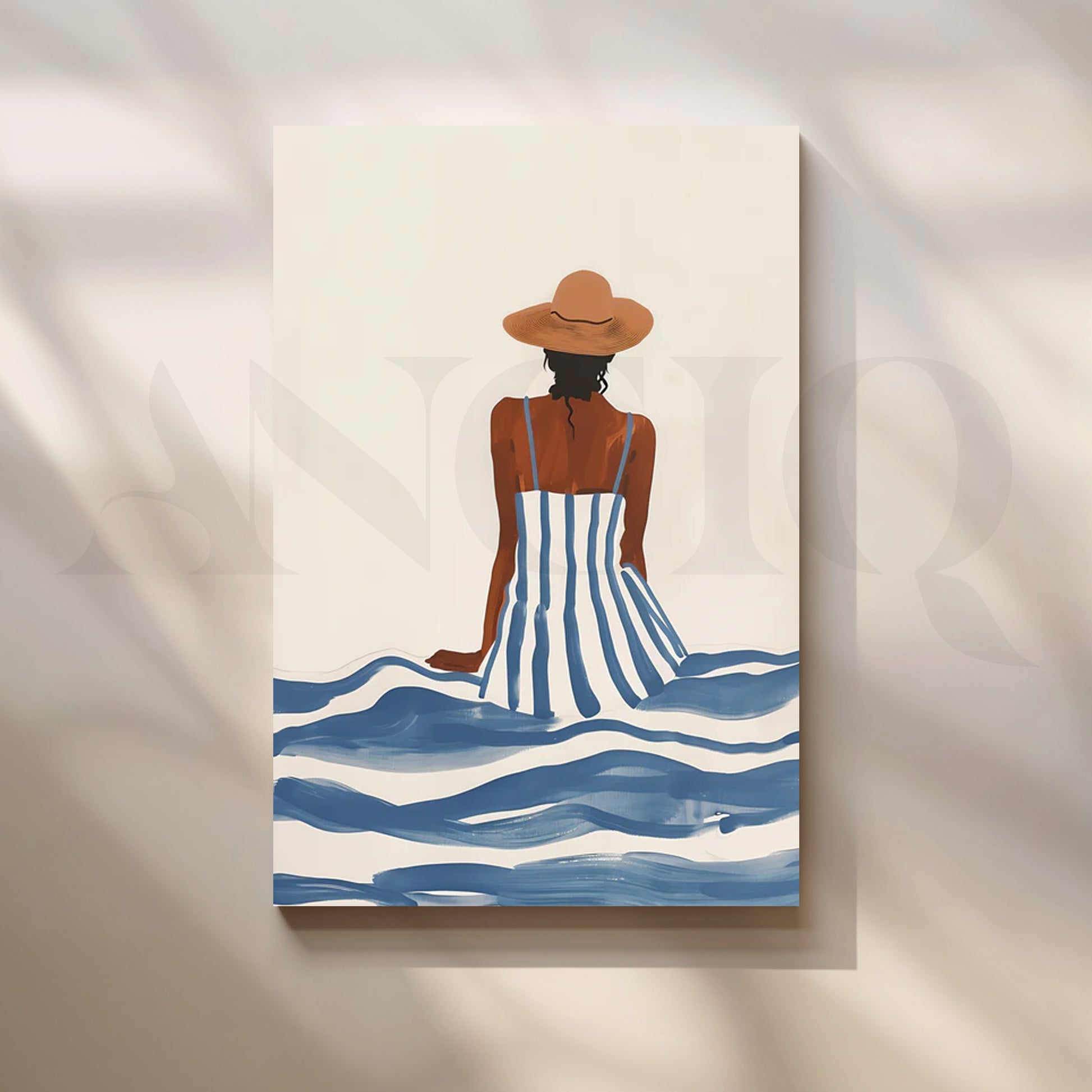 The Striped Serenity Wall Painting captures the peaceful essence of summer with a figure in a striped dress and wide-brimmed hat, gazing into tranquility. This minimalist artwork radiates calm and elegance, perfect for modern and coastal-inspired interiors.
