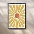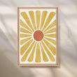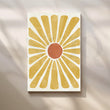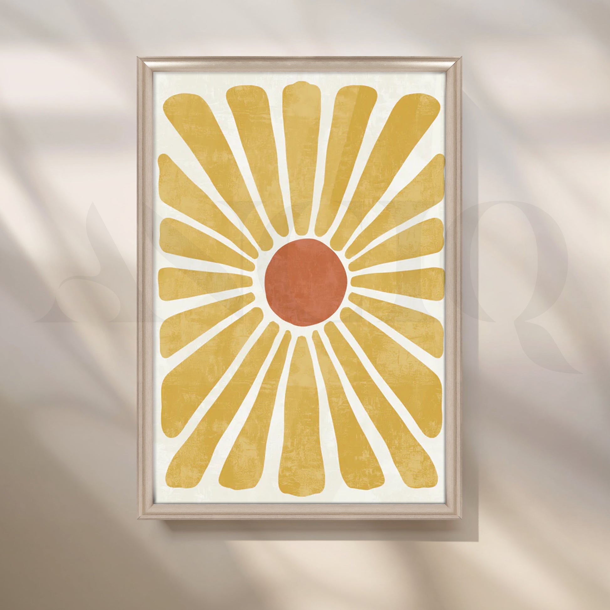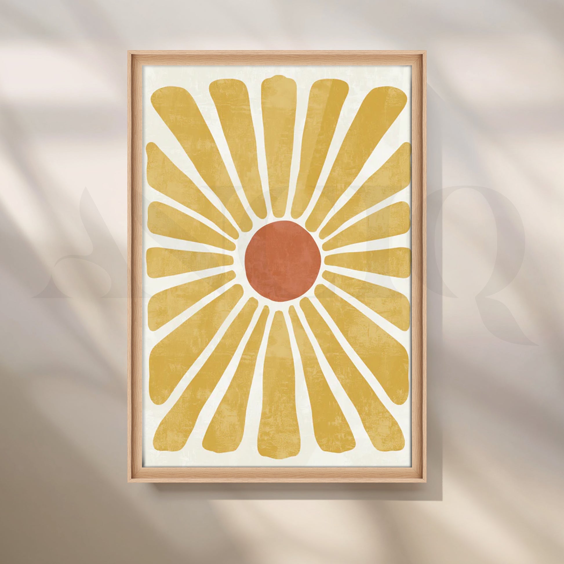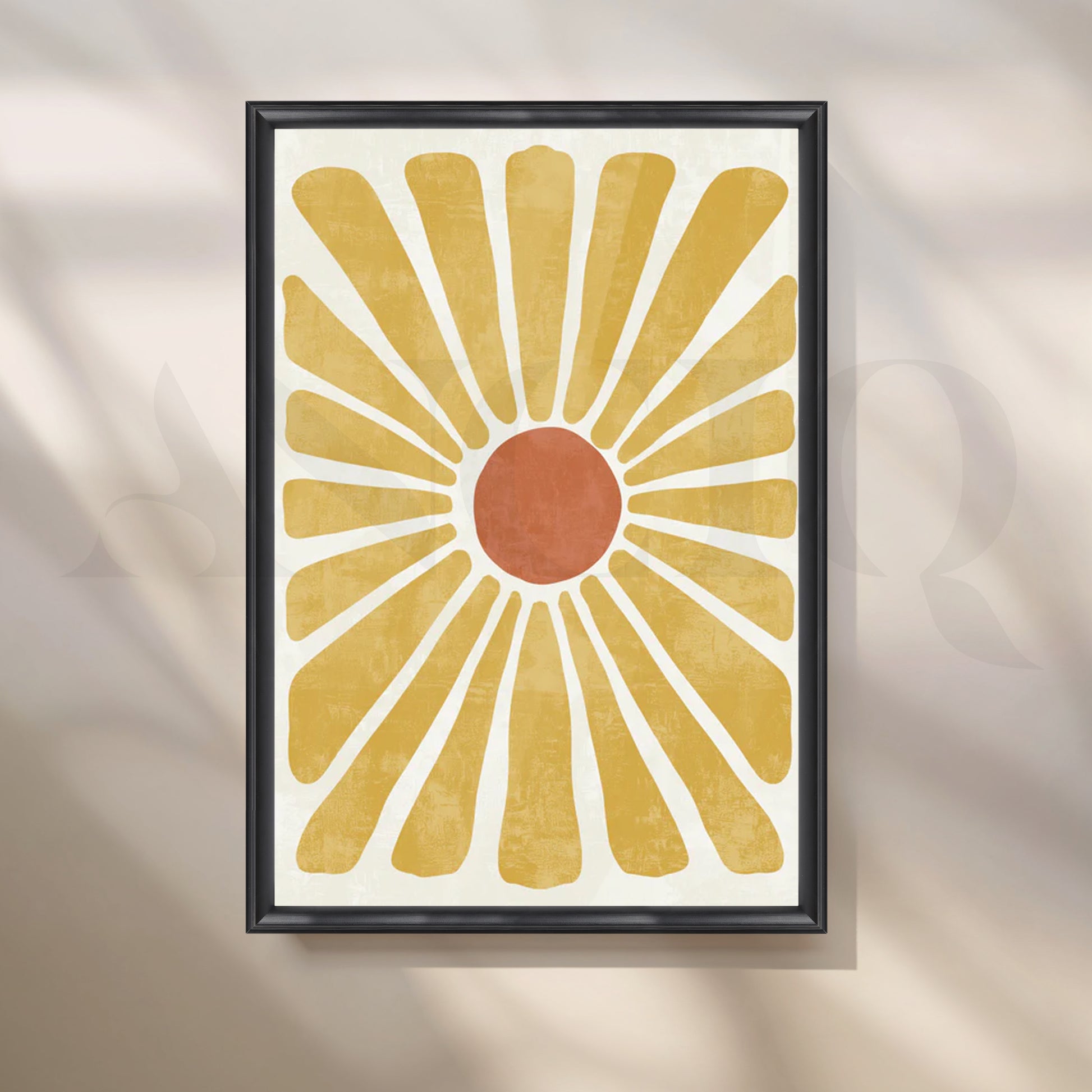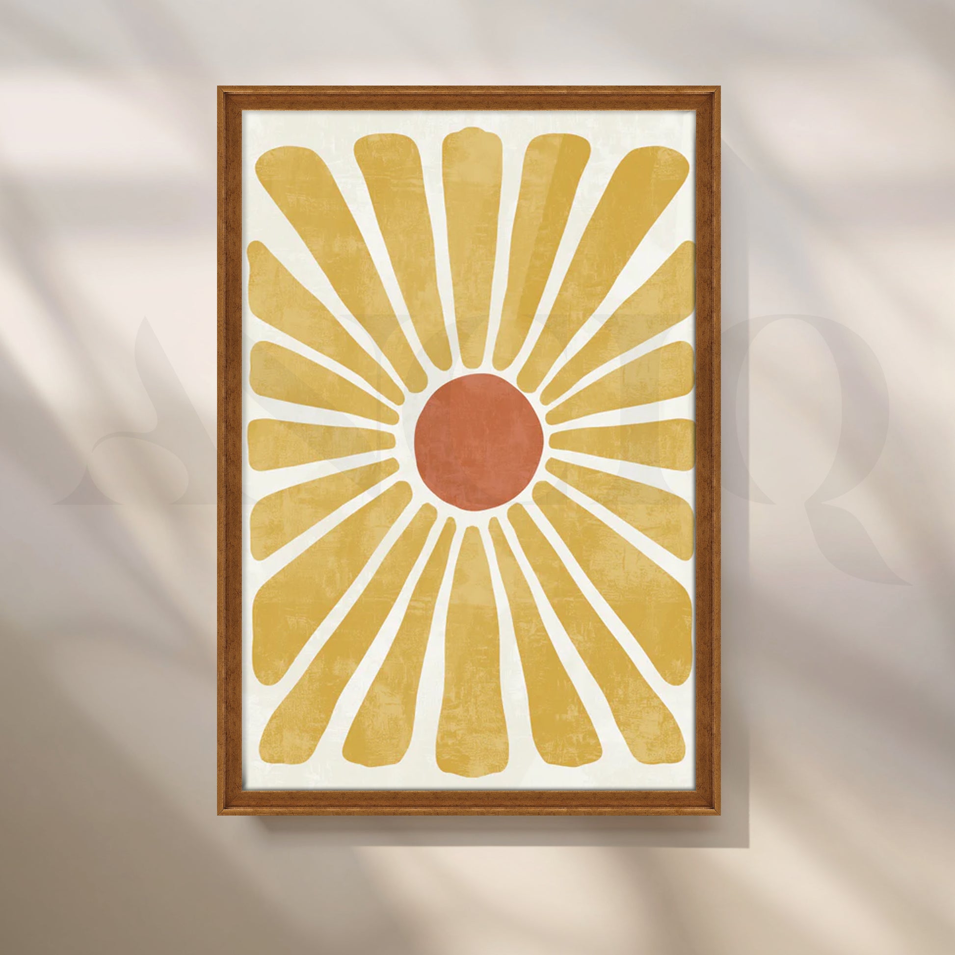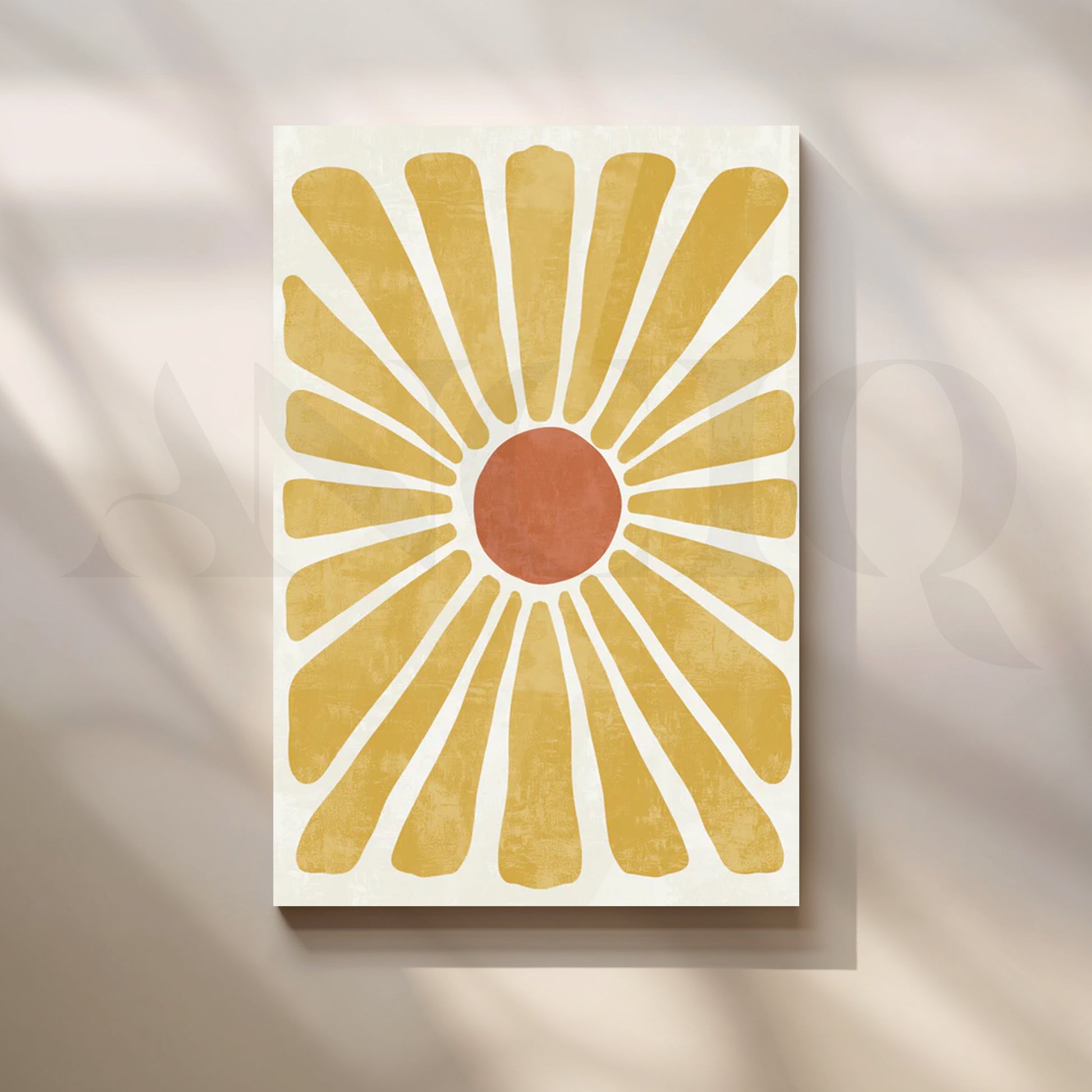 Radiating good vibes, this retro sunburst daisy canvas blends warm mustard petals and a terracotta center on a soft ivory ground—perfect modern wall art for a boho living room, sunny kitchen, or gallery wall. Its minimalist flower illustration and vintage texture deliver cheerful mid-century décor that pairs with neutral furniture, rattan accents, and Scandinavian styling. Ideal as large wall art, hallway statement, or bedroom accent.