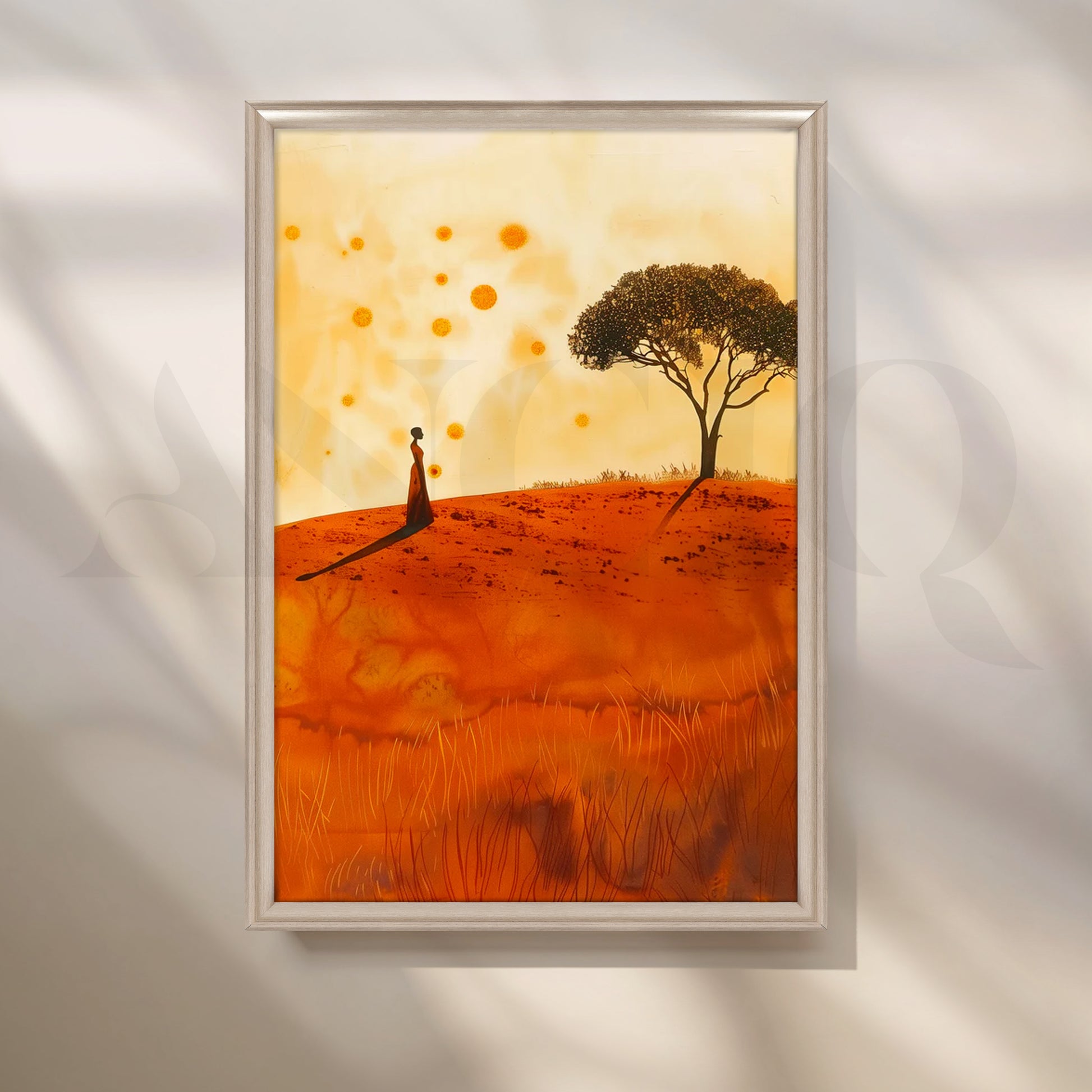Warm earth tones and soft, sun-washed gradients capture a lone figure beneath an acacia tree—an elegant, minimalist landscape that brings calm to any space. This modern canvas painting pairs abstract texture with desert hues of amber, terracotta and cream, delivering serene large wall art ideal for an entryway or hallway refresh. A perfect choice for modern farmhouse and boho décor, it adds depth and warmth without visual clutter, inviting guests in with tranquil, contemporary art.