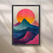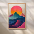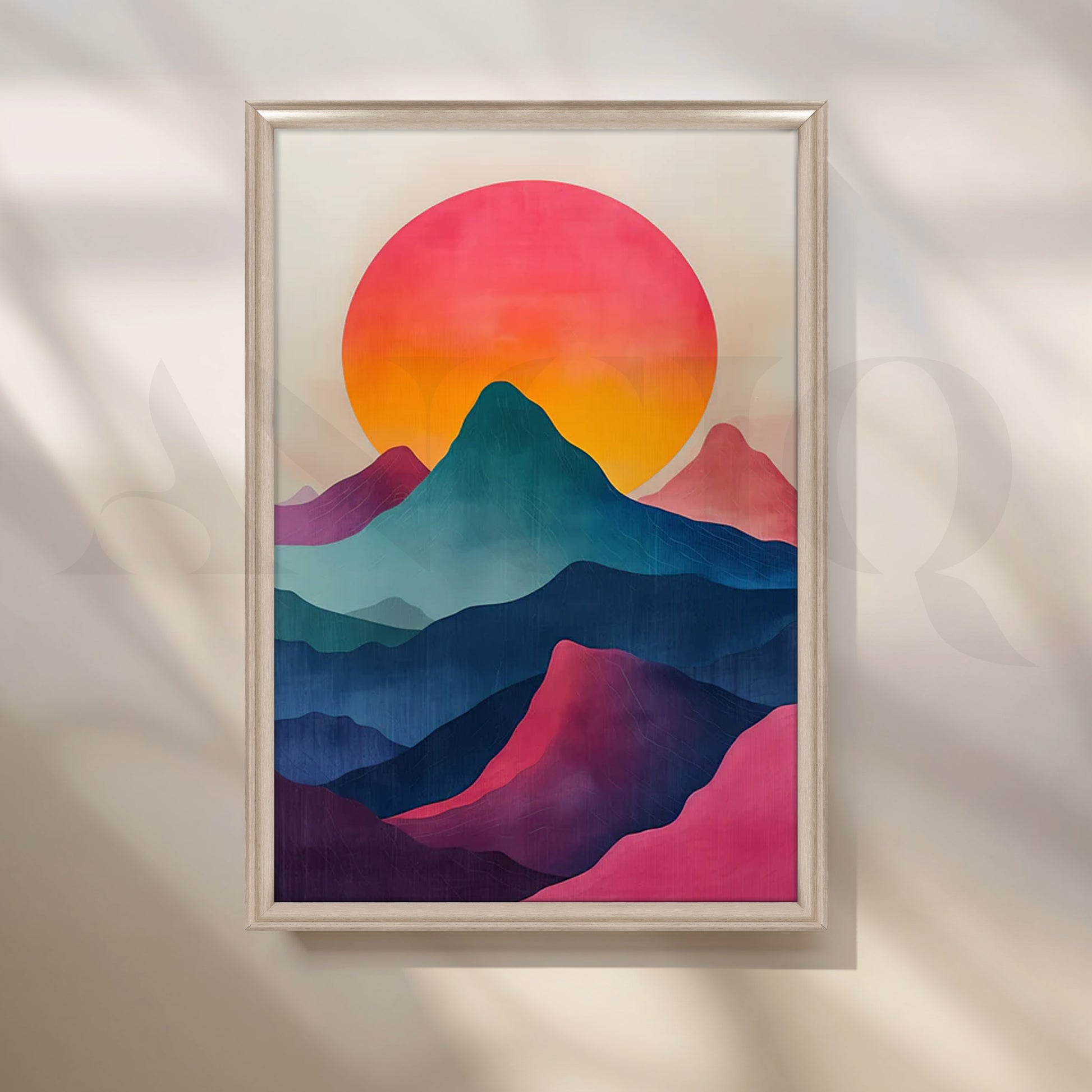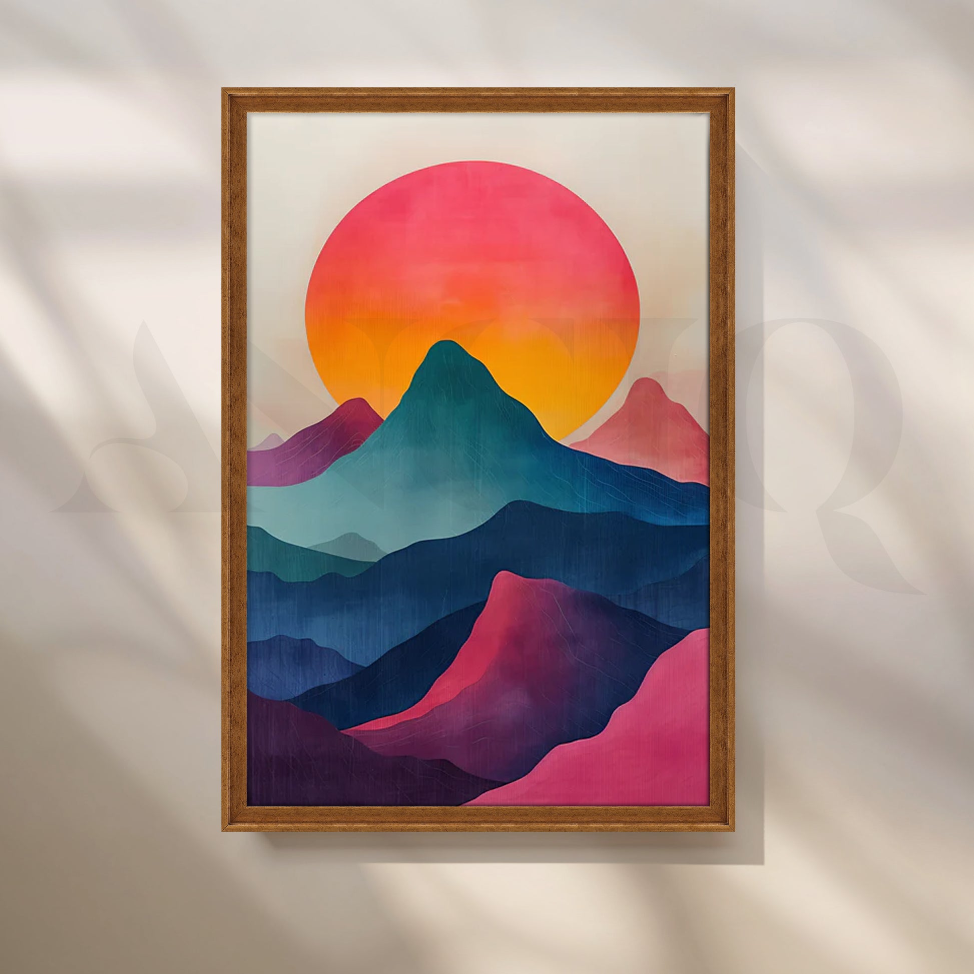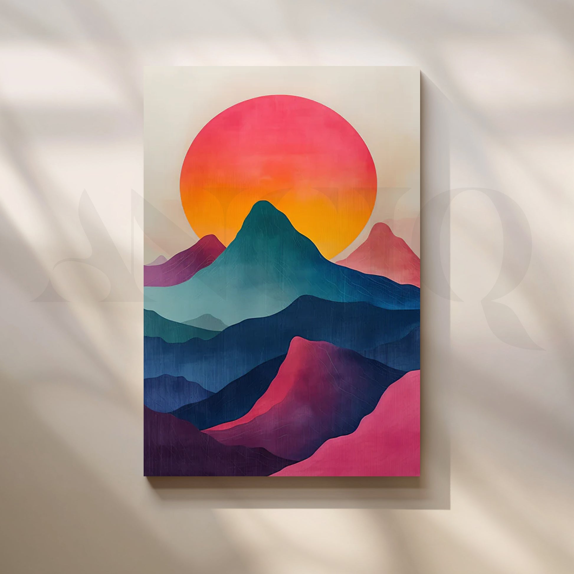 The Sunrise Over Layers Wall Painting depicts a serene mountain landscape bathed in the radiant glow of a vibrant sunrise. Soft gradients of pink, orange, and blue cascade across the scene, creating a tranquil yet visually striking artwork that transforms your living space into a haven of beauty and calm.