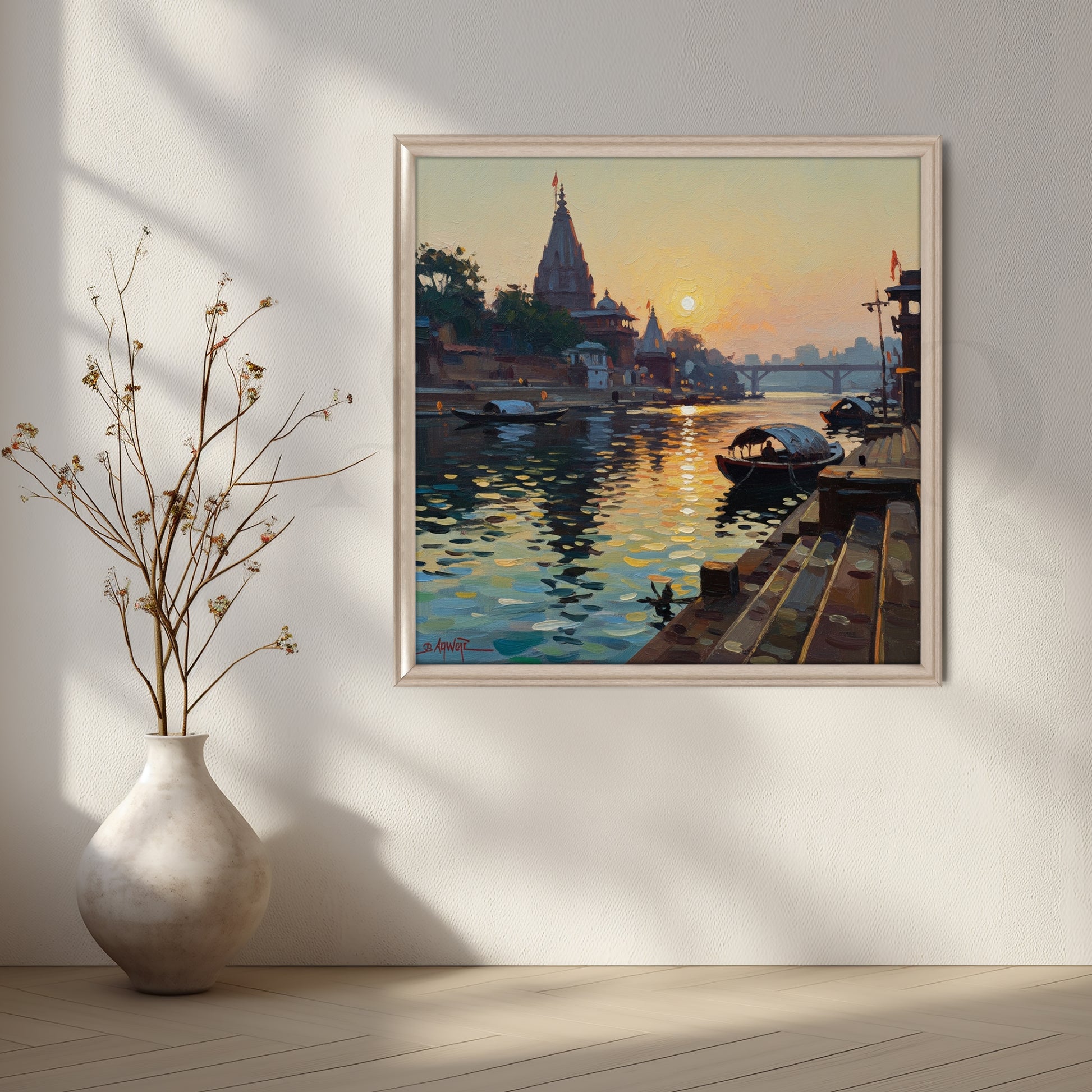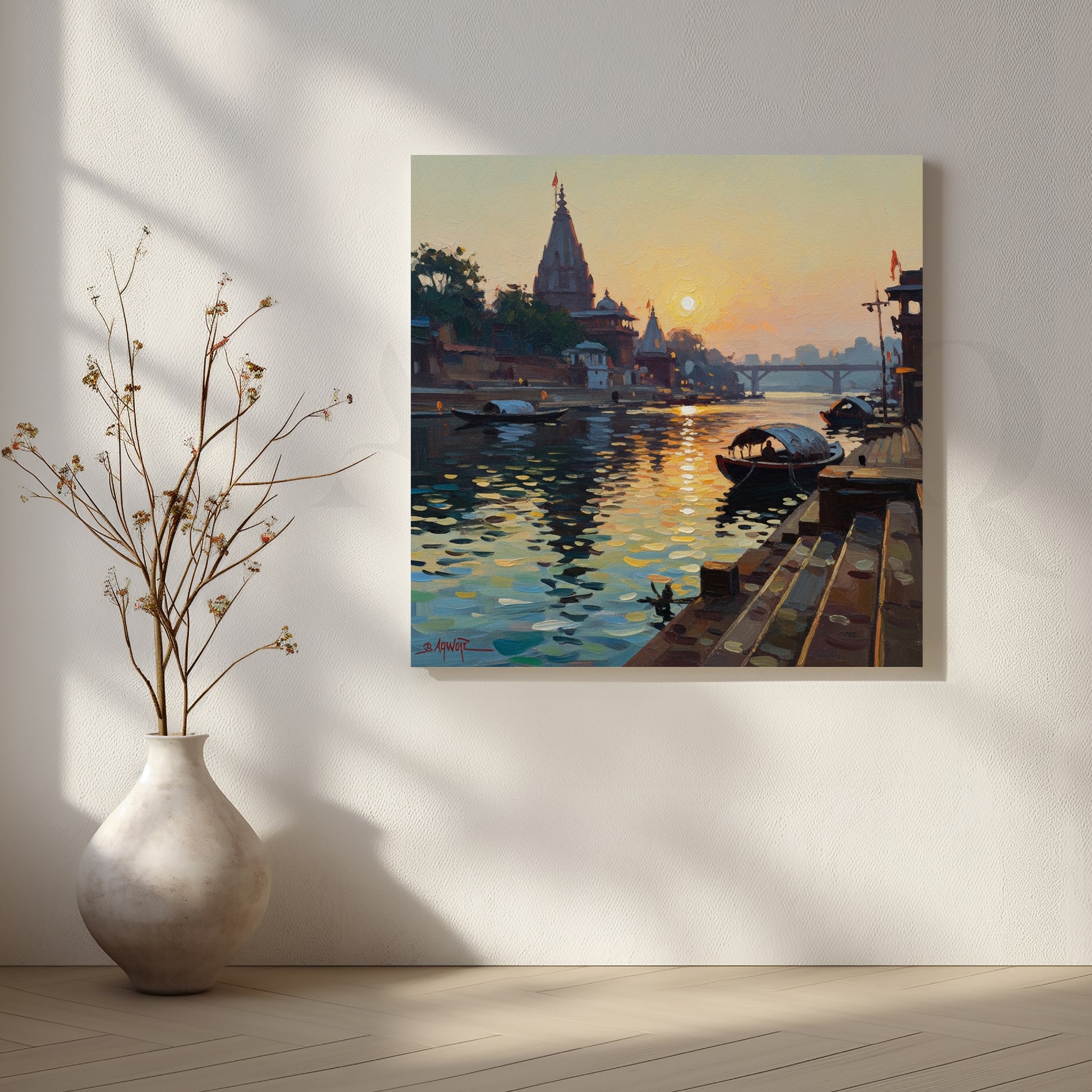 Embrace the calm of dawn with Sunrise Over Sacred River Canvas Artwork. This peaceful piece captures the golden sunrise reflecting on a tranquil river lined with ancient temples and boats. A perfect wall décor for creating a soothing and spiritual atmosphere in your home or office.