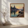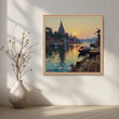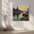 Sunrise Over Sacred River Canvas Artwork – Serene Riverside Temple Scene Wall Art