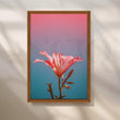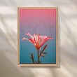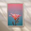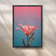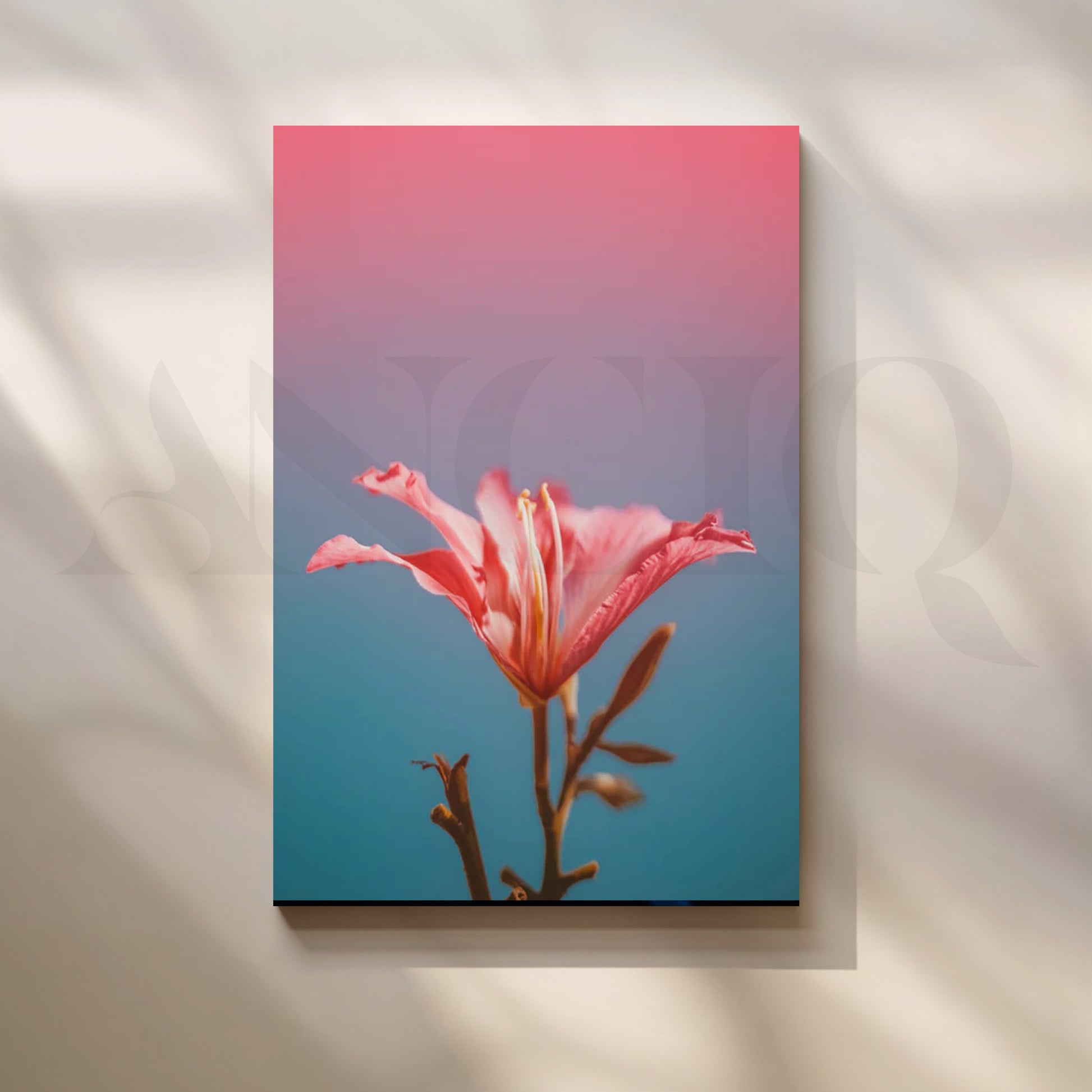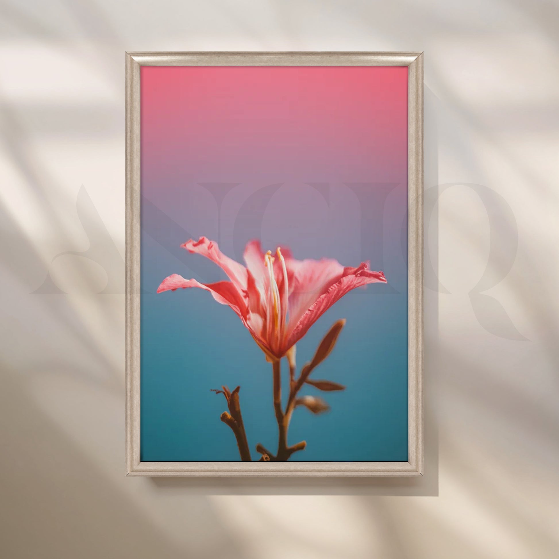 Sunset Bloom Wall Poster captures a stunning pink flower against a dreamy gradient of warm coral and cool blue hues. The soft lighting and delicate petals create a serene yet striking composition, making this floral wall poster a perfect statement piece for a tranquil and artistic atmosphere.