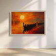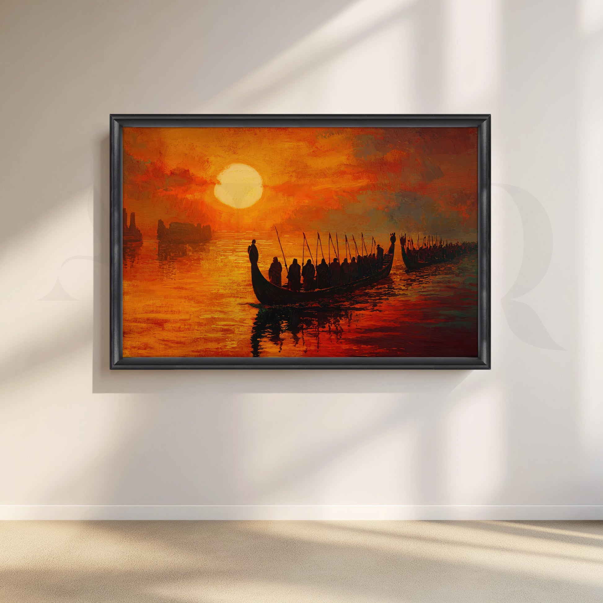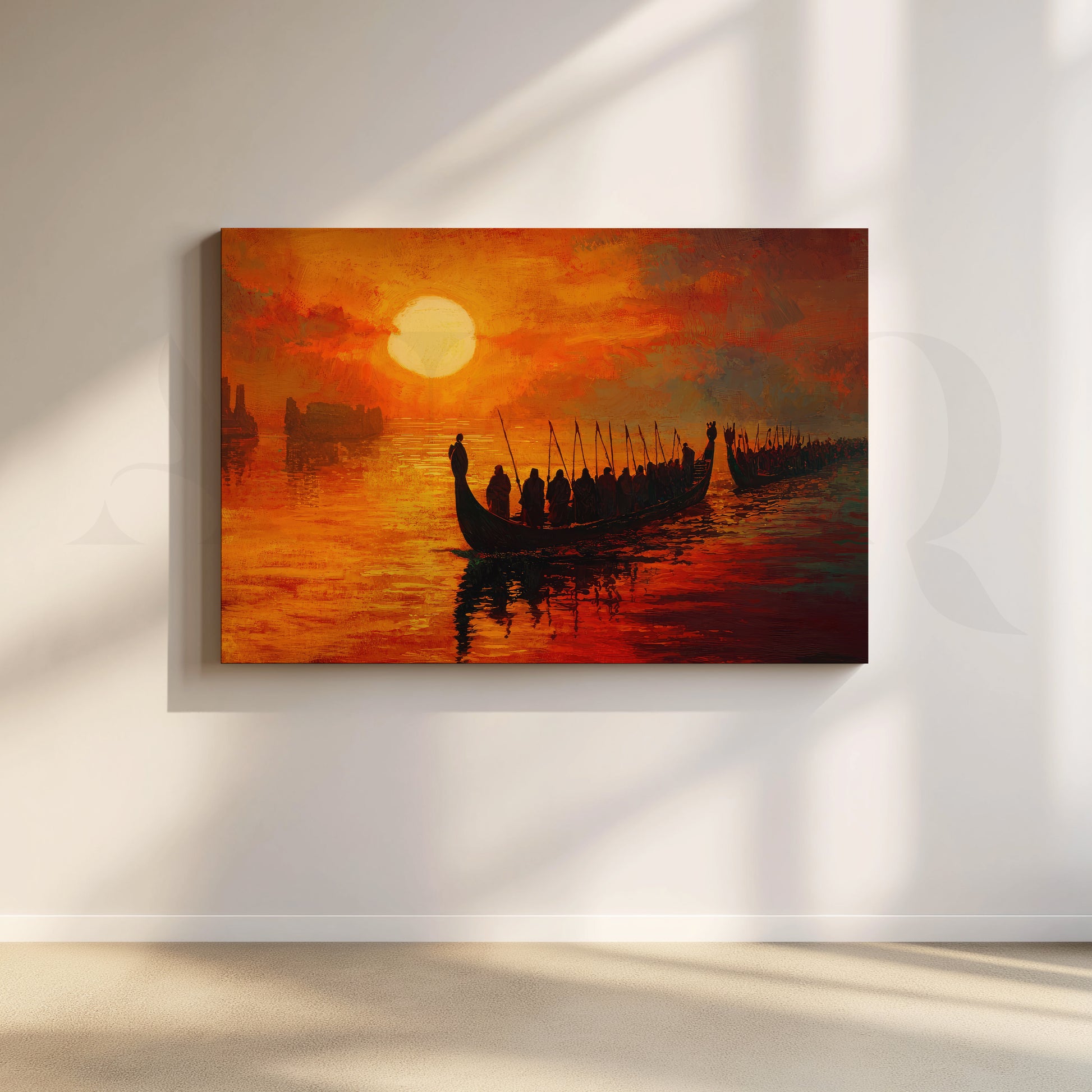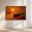 Anciq ‘Sunset Drifters’ Canvas Artwork for Study Room evokes the quiet strength of oarsmen sailing into a fiery sunset. With burnt orange, deep maroon, and golden amber hues, this painting creates an atmosphere of calm reflection. Ideal for study rooms, office spaces, or masculine interiors, it adds drama and movement to any wall. A perfect pick for those searching for vintage boat artwork, sunset wall décor, or dramatic sailing-themed canvas paintings.