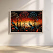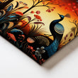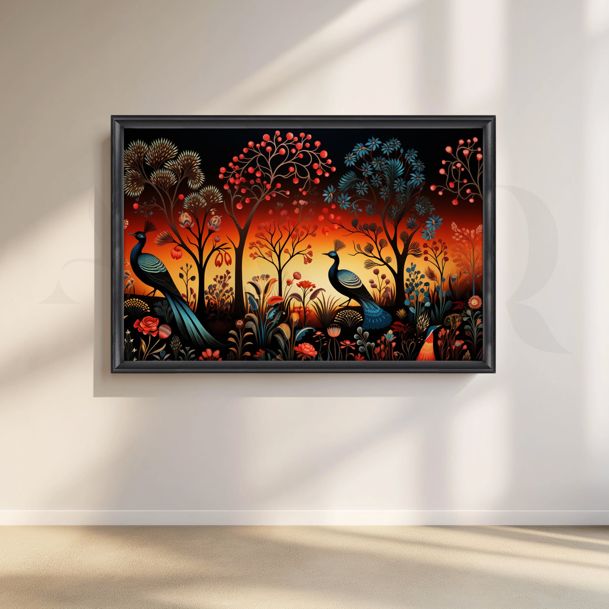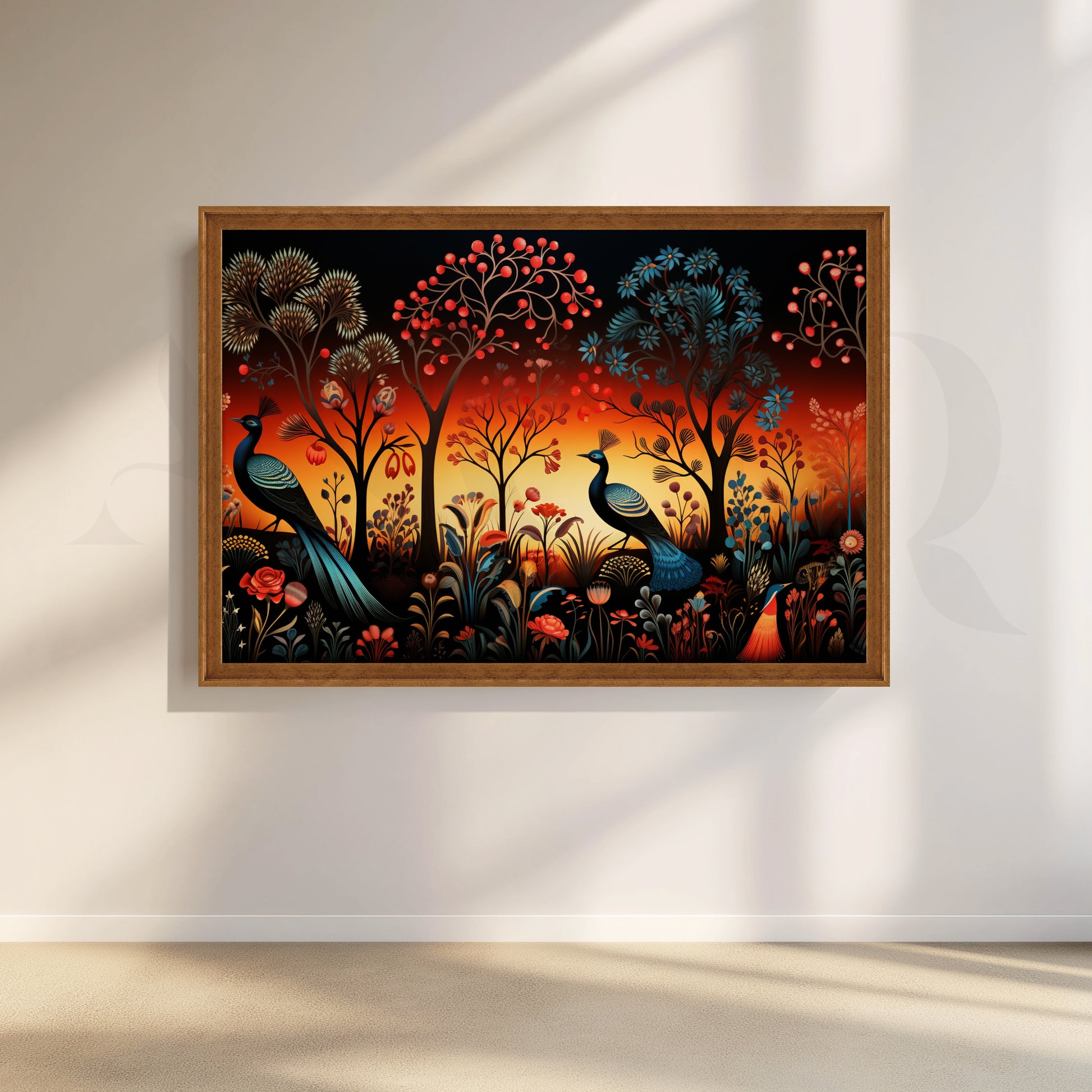 This striking canvas captures peacocks amidst a glowing sunset forest, rich with flowers and tall trees in deep jewel tones. A perfect statement piece for bedrooms, living rooms and entryways. Targets keywords such as peacock wall art, nature landscape canvas, sunset paintings and ethnic home décor.