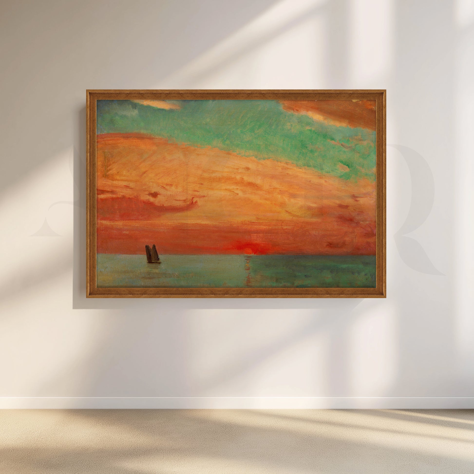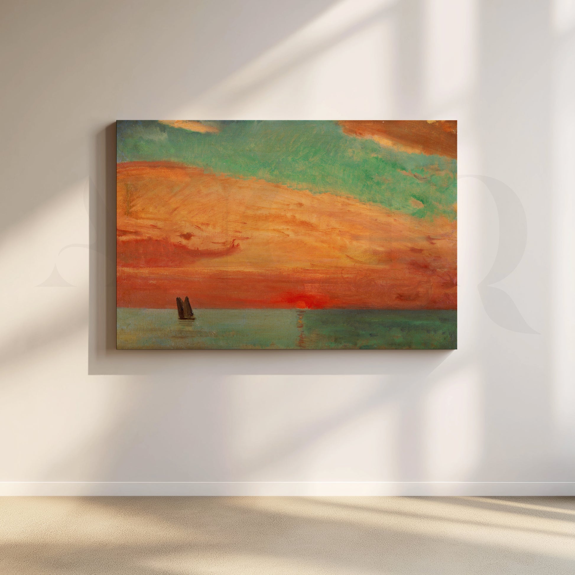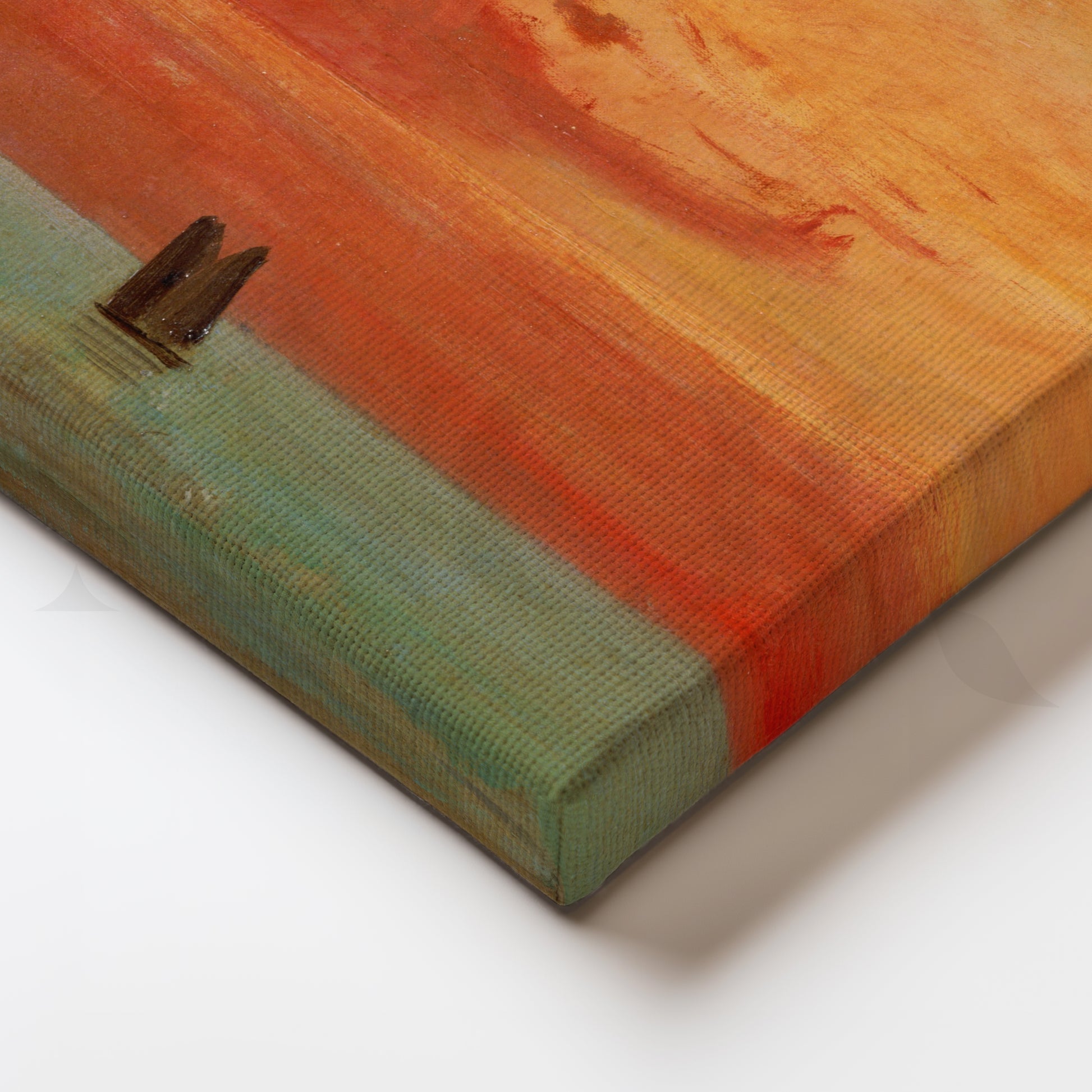 A serene seascape washes the room in sea-glass green, coral orange and sun-kissed red as a lone sailboat drifts across the horizon. With an impressionist, painterly finish, this ocean sunset canvas adds warmth and tranquility to coastal décor, beach-house halls or a calm bedroom retreat. Style this modern wall art above a mantel or console for effortless, large living room art; perfect for coastal wall art lovers and contemporary nautical interiors.