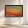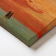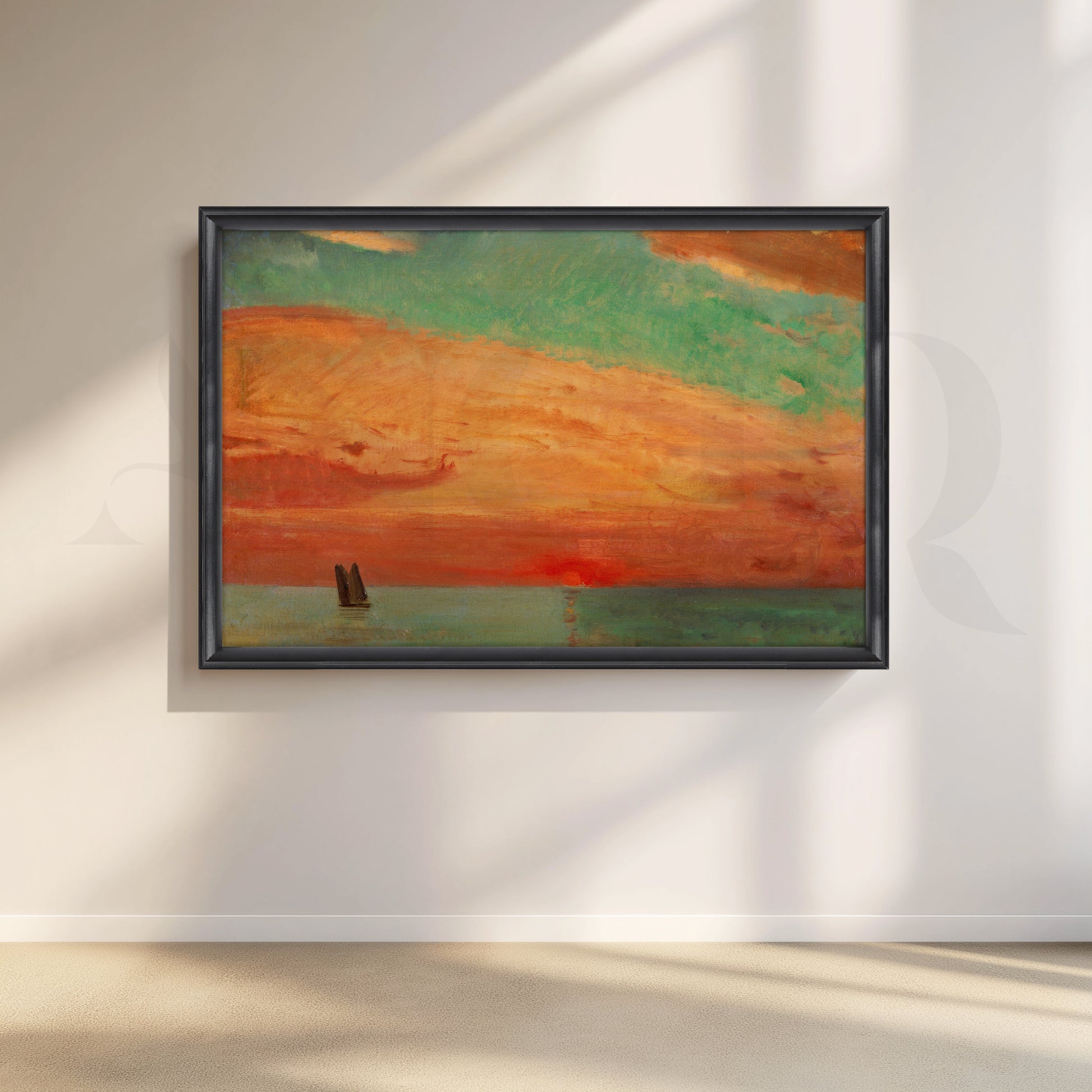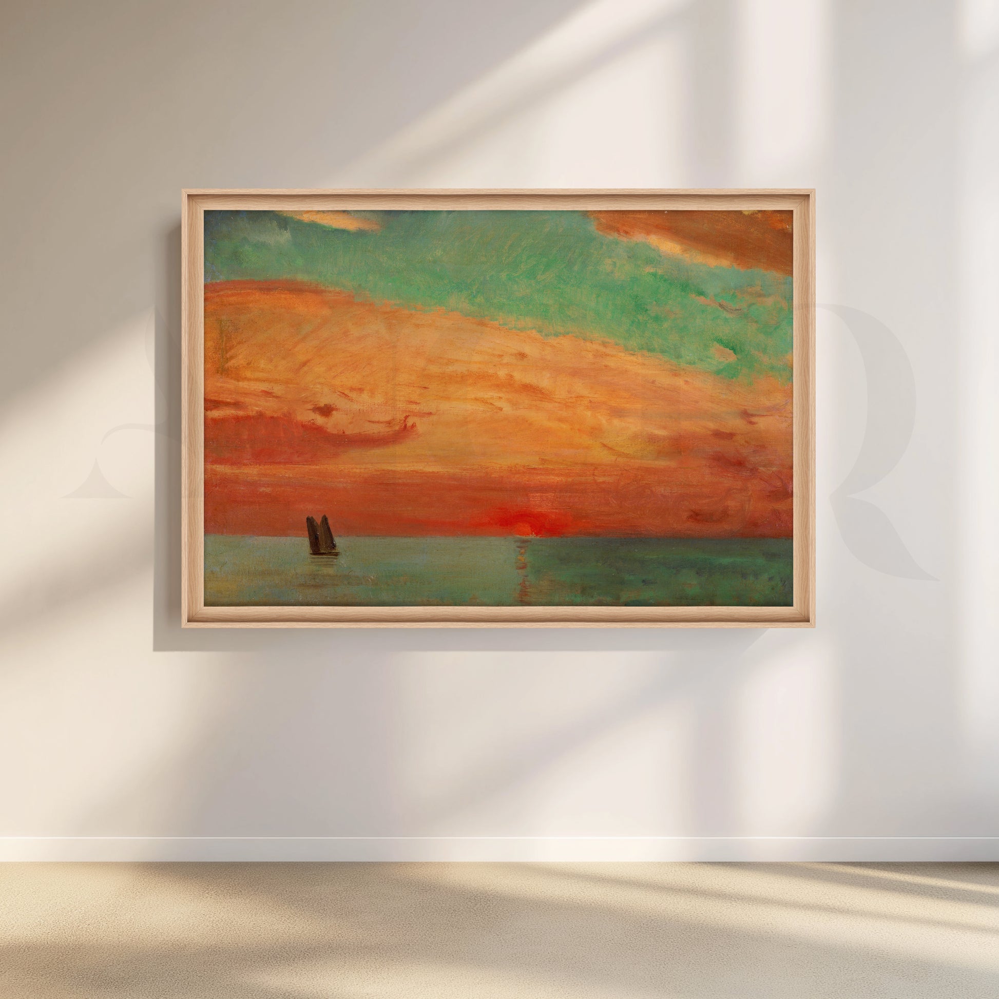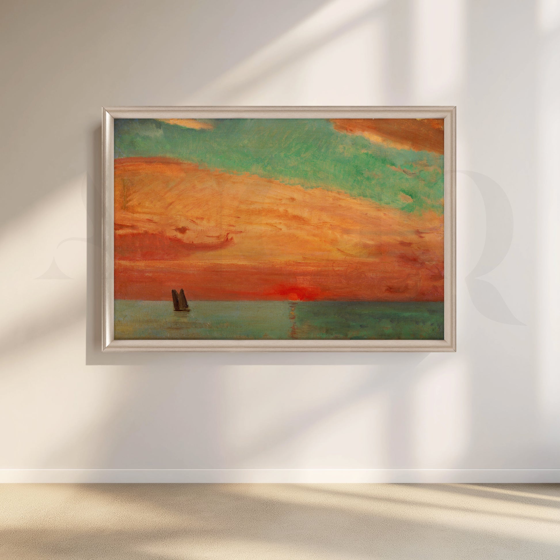 A serene seascape washes the room in sea-glass green, coral orange and sun-kissed red as a lone sailboat drifts across the horizon. With an impressionist, painterly finish, this ocean sunset canvas adds warmth and tranquility to coastal décor, beach-house halls or a calm bedroom retreat. Style this modern wall art above a mantel or console for effortless, large living room art; perfect for coastal wall art lovers and contemporary nautical interiors.