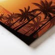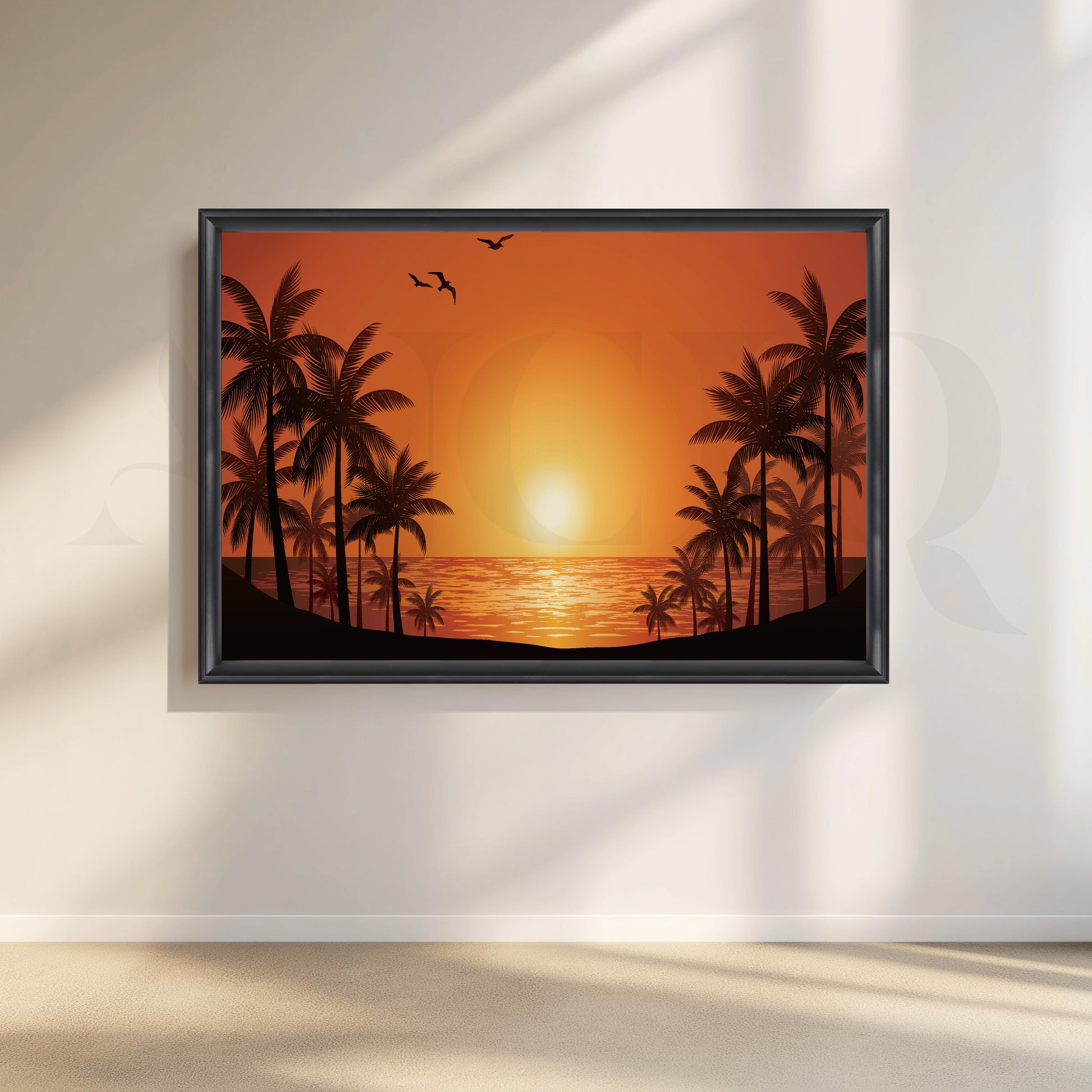 This beautiful canvas painting captures the tranquility of tropical sunsets. Palm trees sway gently in the breeze as fiery orange and red colors spread across the sky. Soft pink and purple clouds add some interest to the scene, while the deep blue water reflects the vibrant colors above. This feature will definitely bring a touch of paradise to any home.