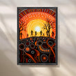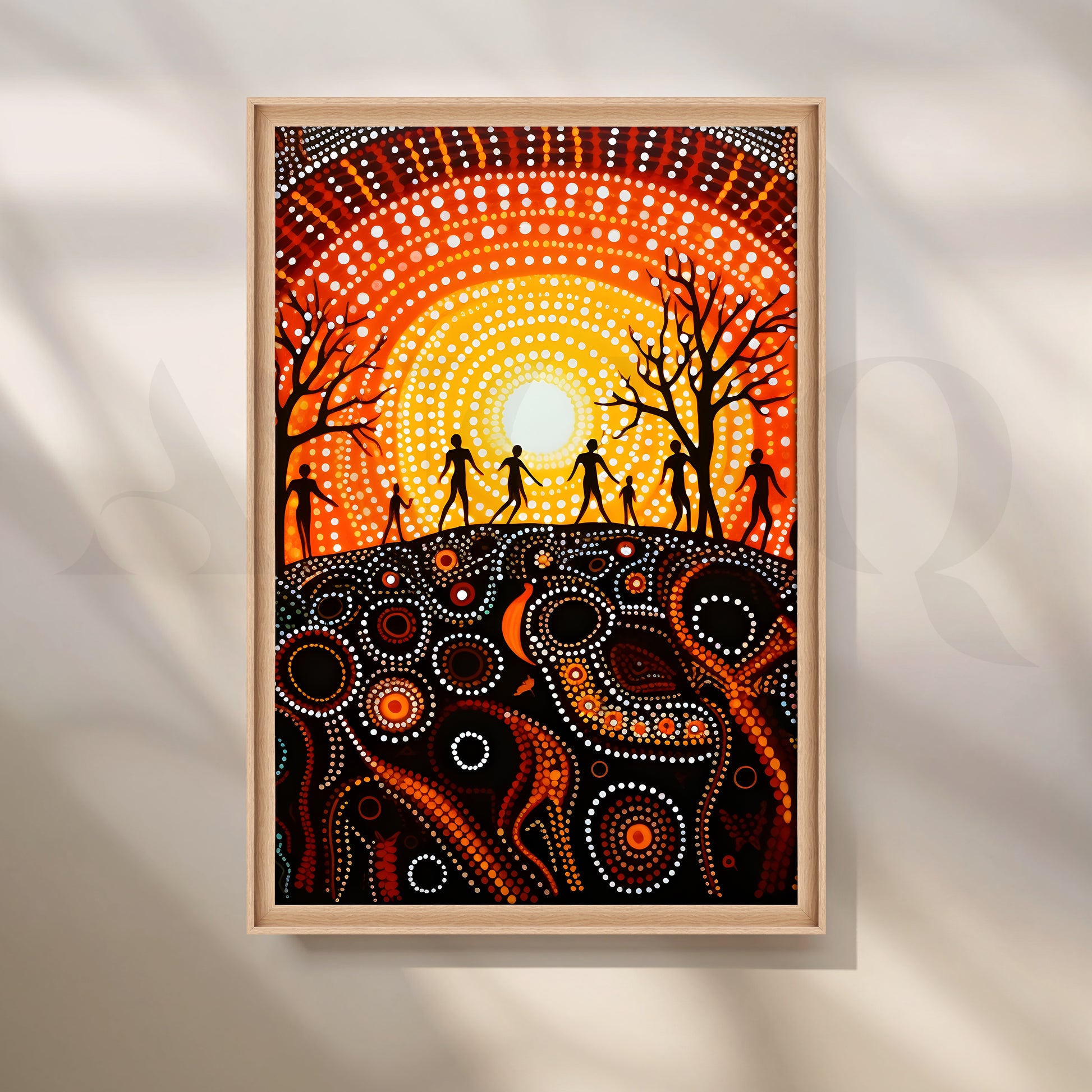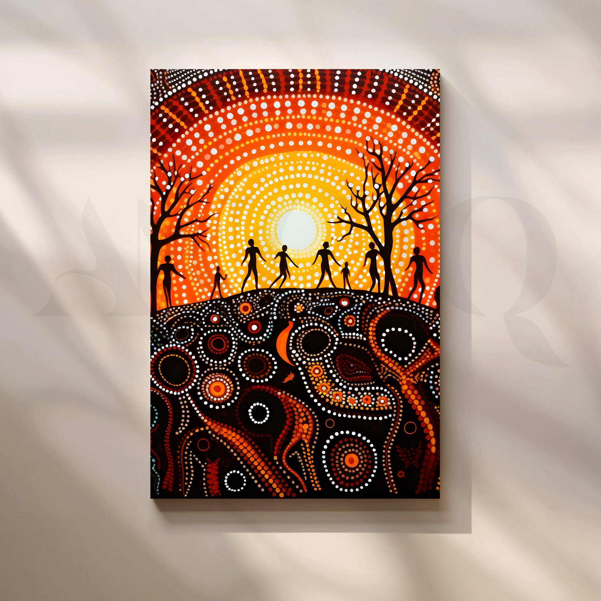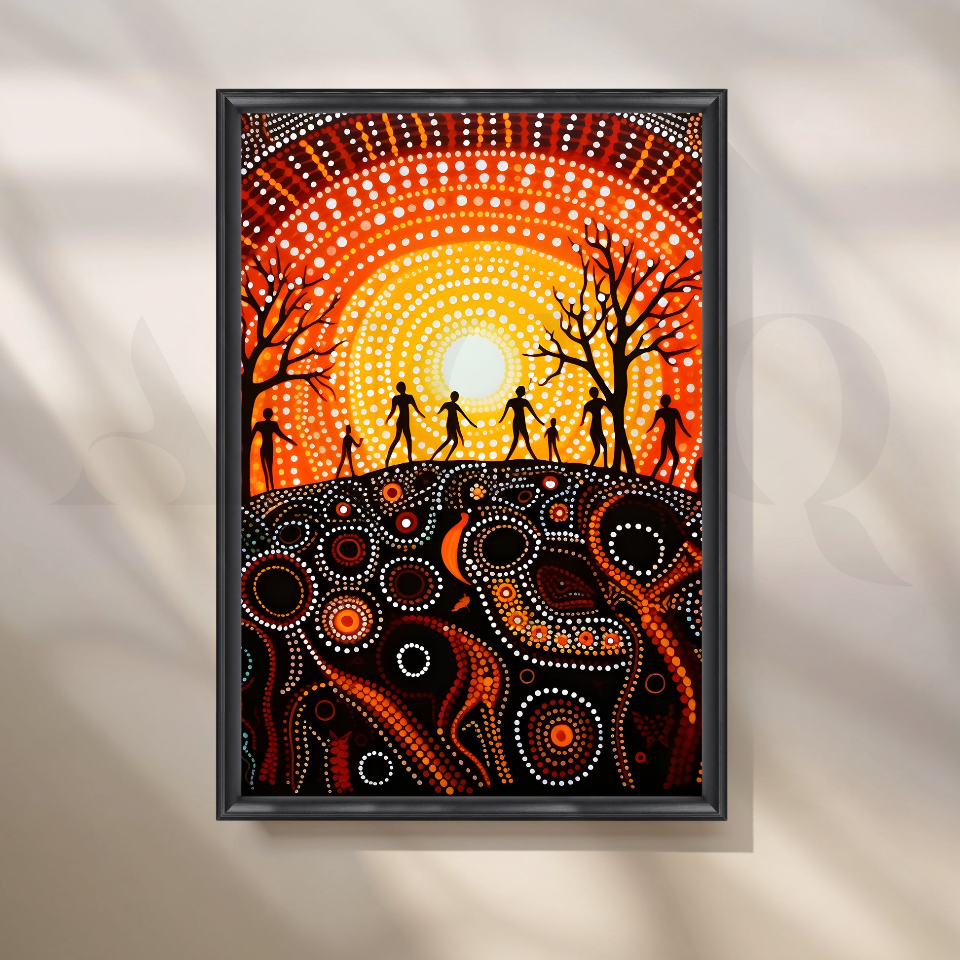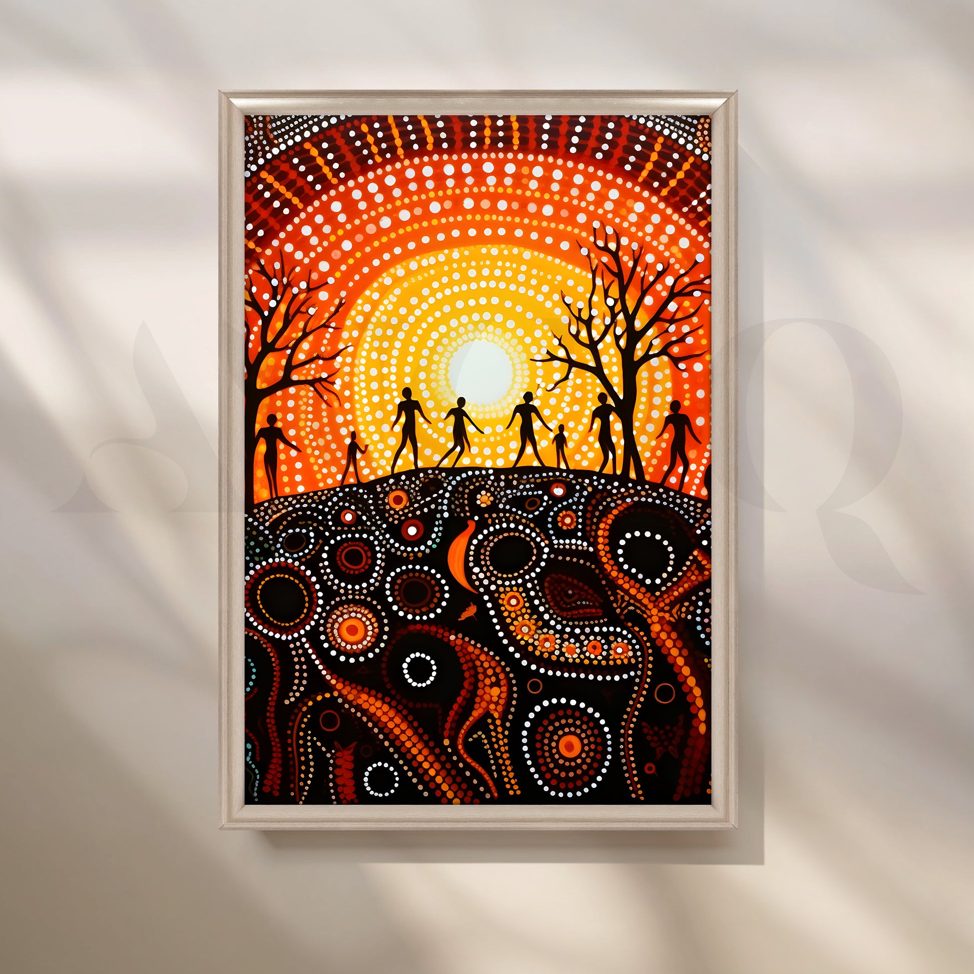 Radiating warmth and life, this Anciq artwork features silhouettes of figures holding hands beneath a glowing sun in shades of orange, red, and black. Ideal for living rooms or cozy corners. Keywords: aboriginal dot art, sunset tribal painting, warm tone wall art, boho modern decor, symbolic sun artwork.