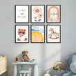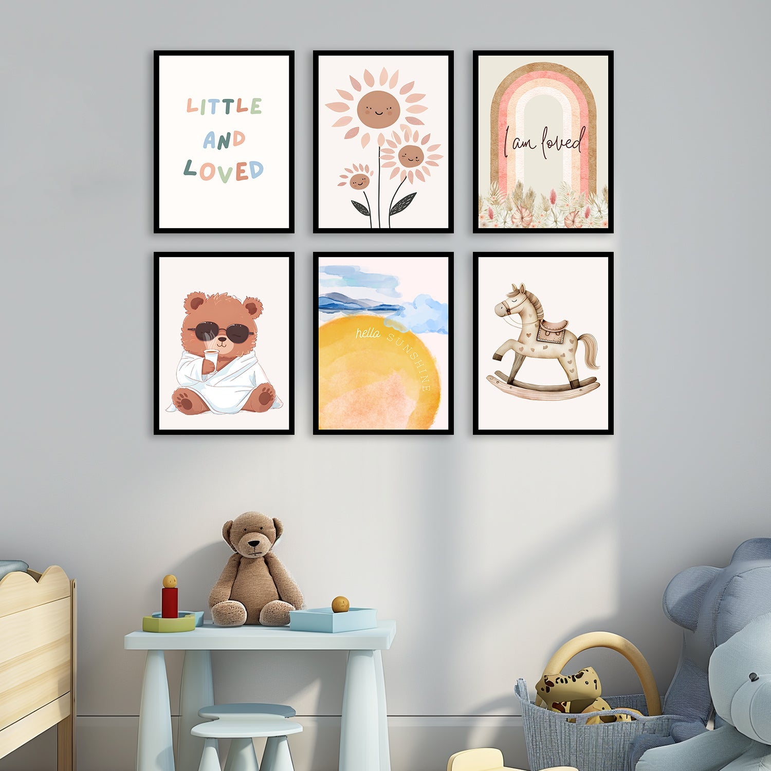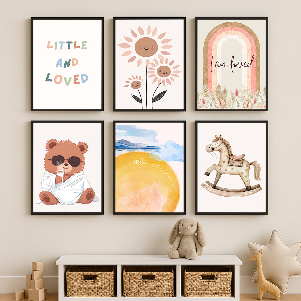 The "Sweet Nursery Wall Poster Set" combines uplifting quotes, adorable illustrations, and cheerful designs, including a cuddly bear and a classic rocking horse. These wall posters add a touch of warmth and positivity, creating a nurturing and stylish space for your child's room.