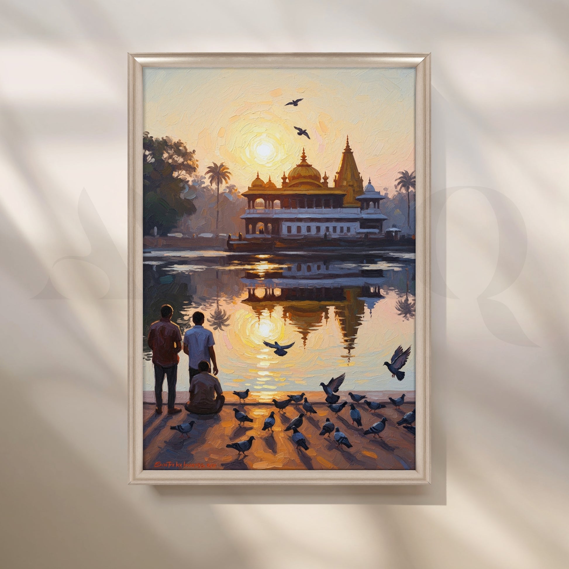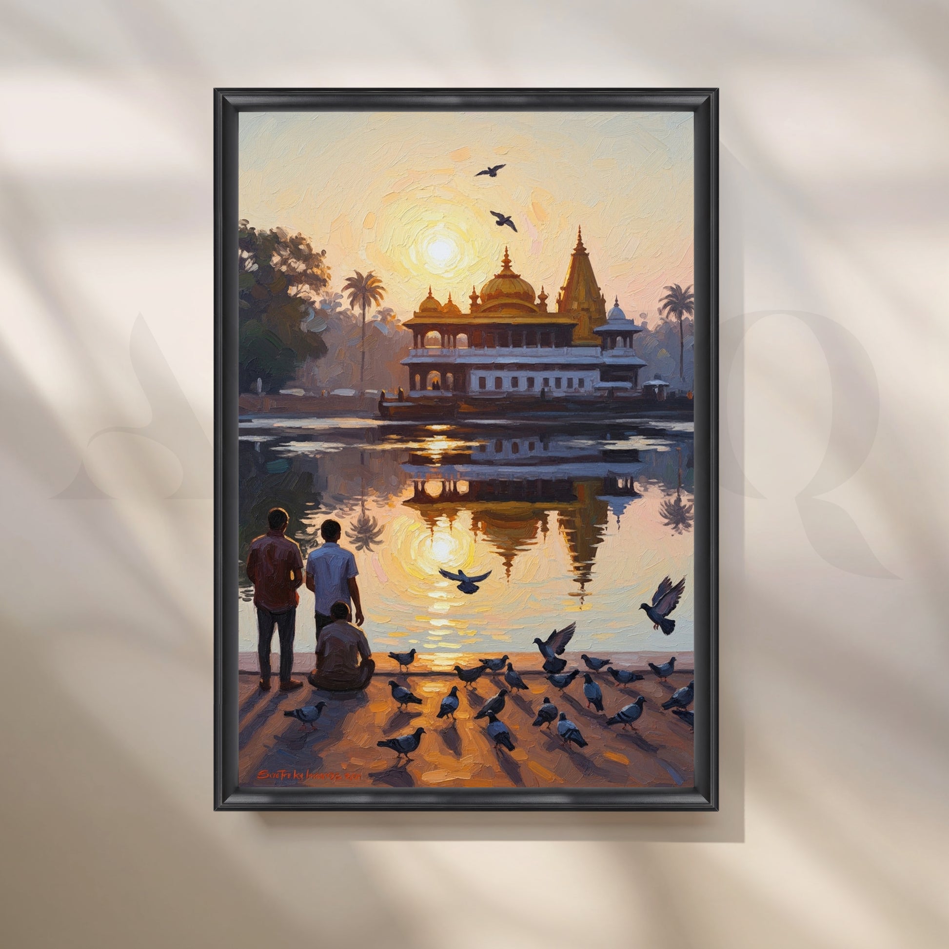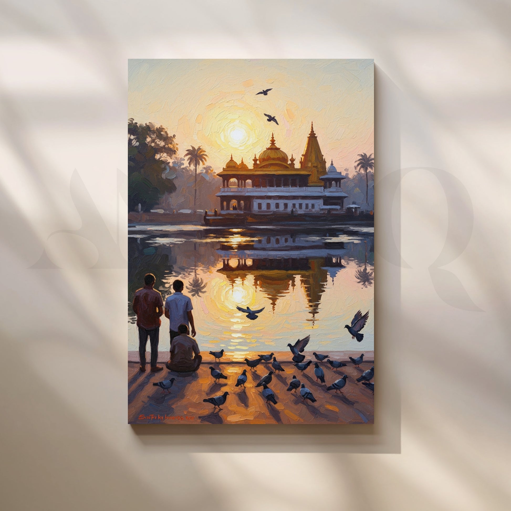 Anciq ‘Temple Reflections at Dawn’ captures a peaceful sunrise over a riverside temple, mirrored in calm waters as pigeons and devotees animate the foreground. This serene canvas painting brings spiritual energy to meditation rooms, puja corners, or tranquil living spaces—perfect for those searching “spiritual canvas art” or “sunrise temple wall decor.”