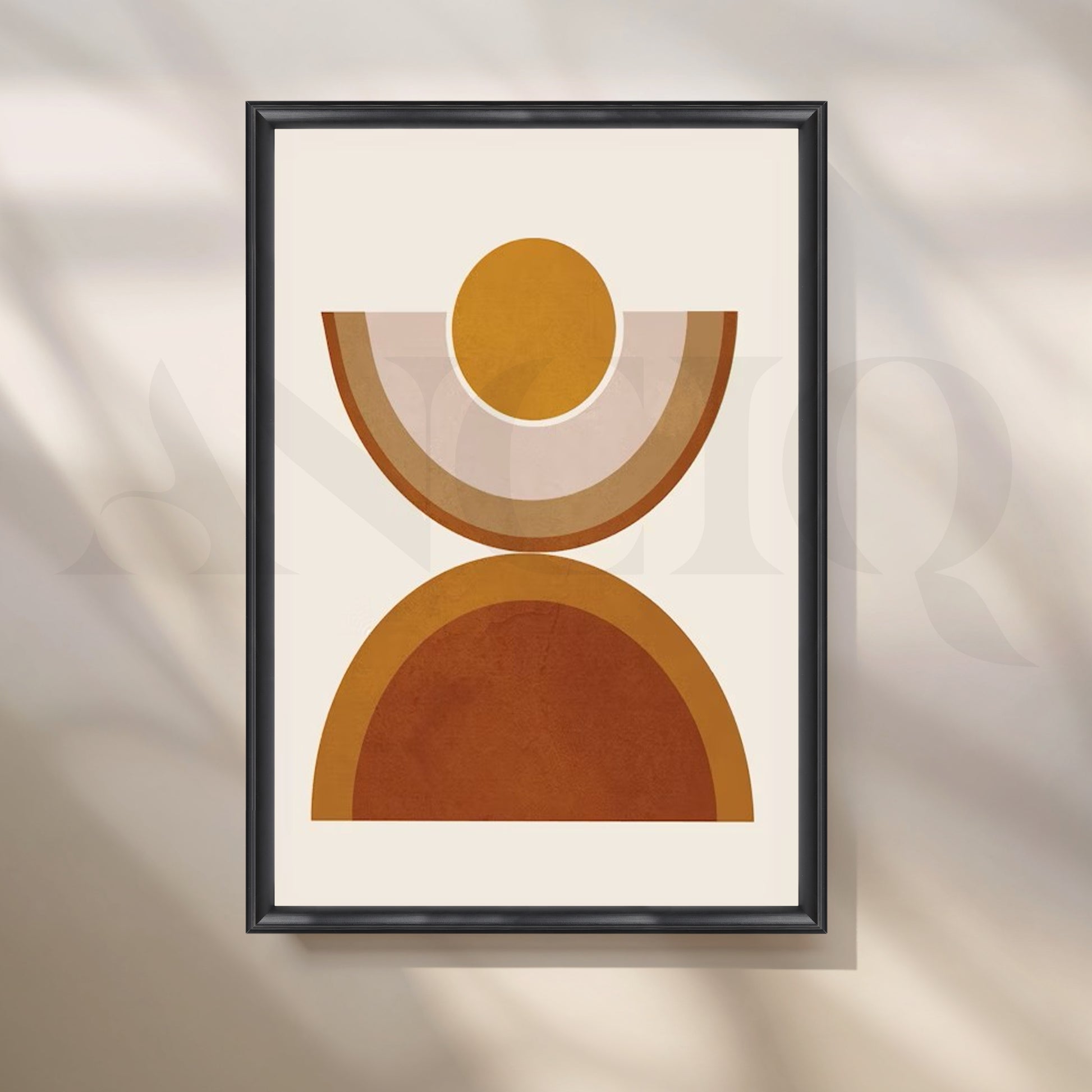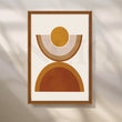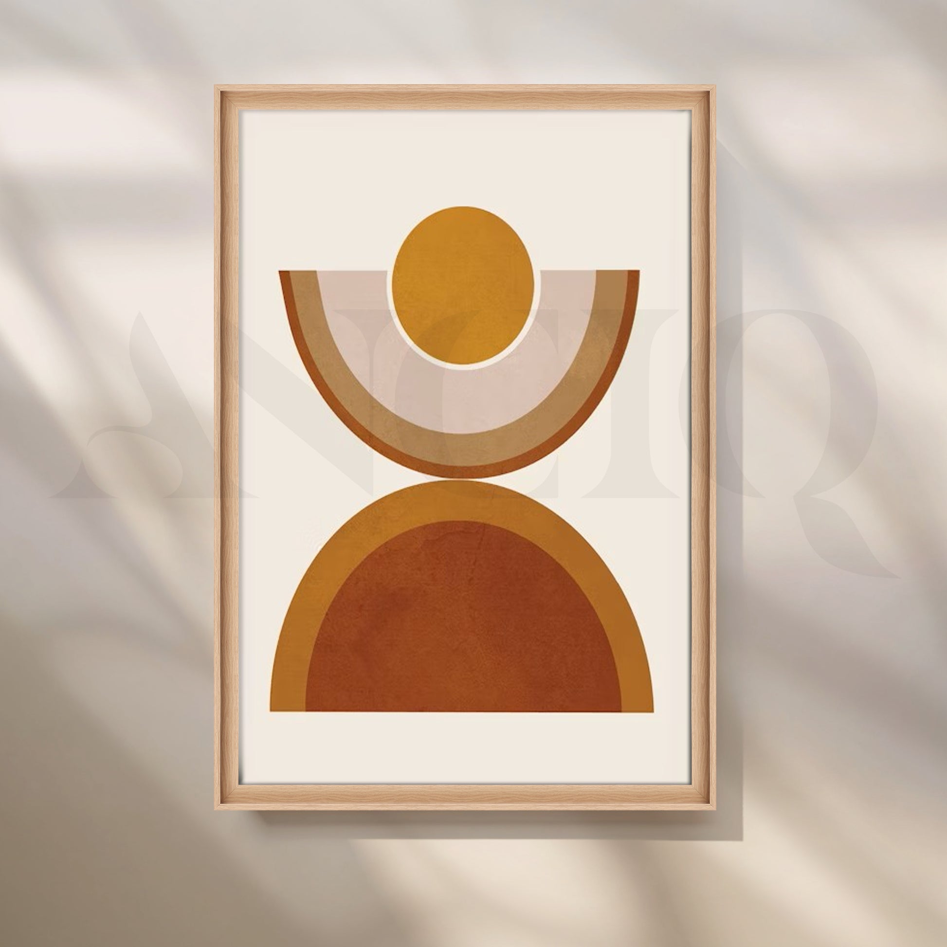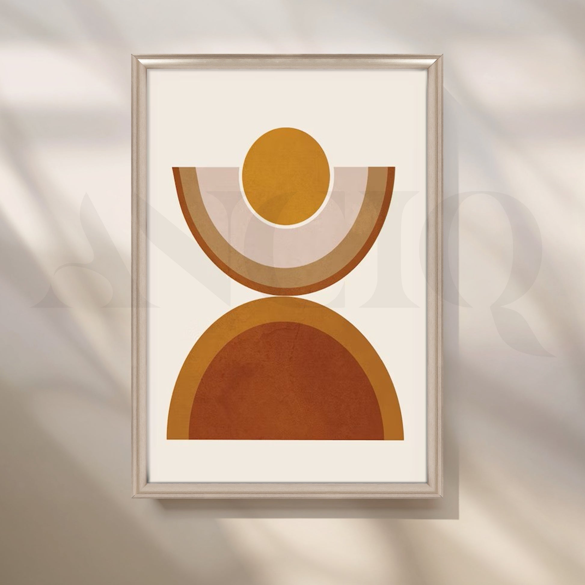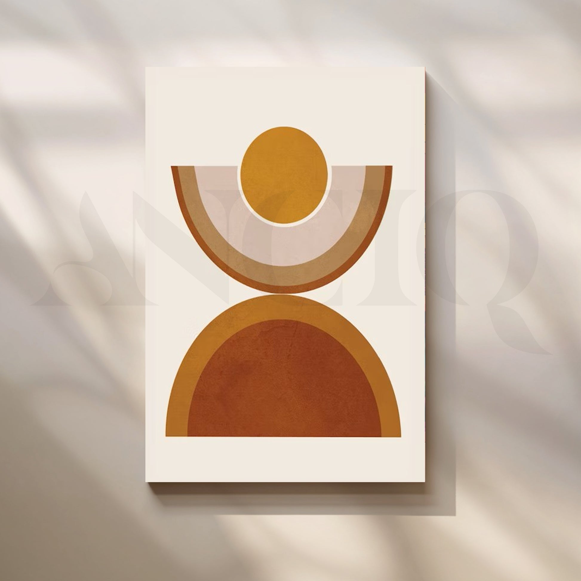 This minimal abstract canvas artwork features a golden circle and layered terracotta arches on a soft cream backdrop. Warm earthy tones make it perfect for modern living rooms, bedrooms and boho interiors. Ideal for shoppers searching for geometric wall art, neutral abstract canvas and Scandinavian inspired home decor.