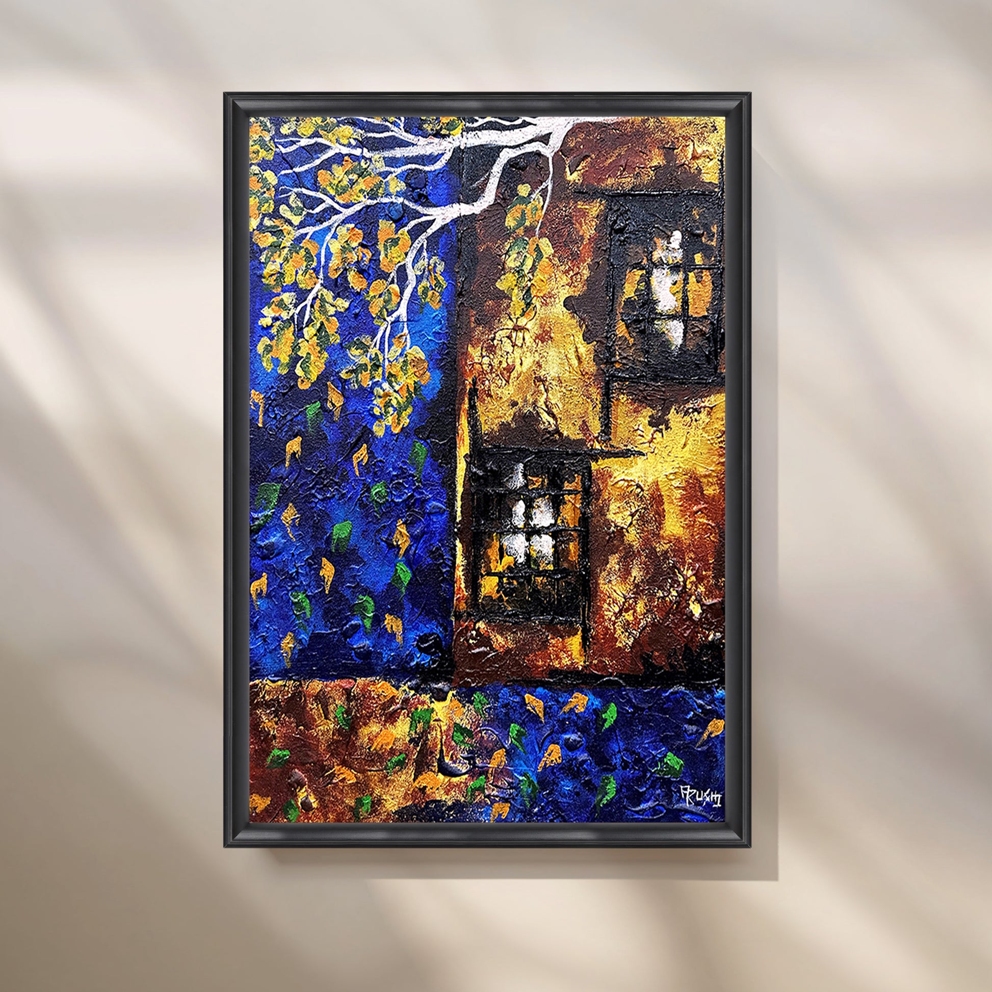 Embossed, acrylic art on canvas. The painting features bright yet soothing colours with falling petals, so as to give a feel of the start of autumn.