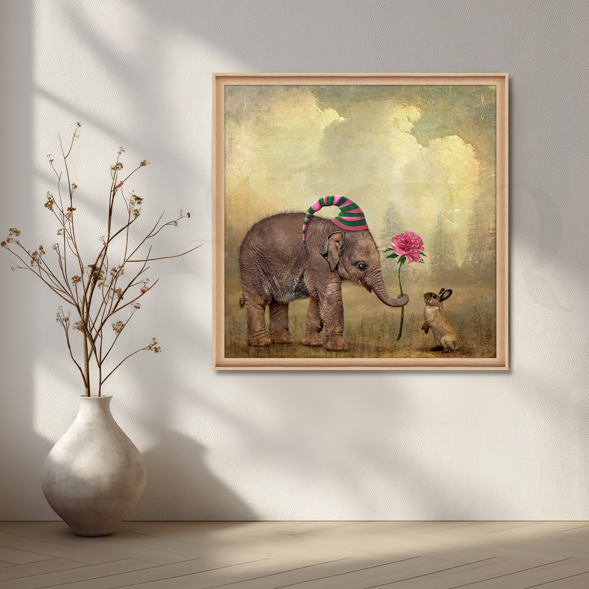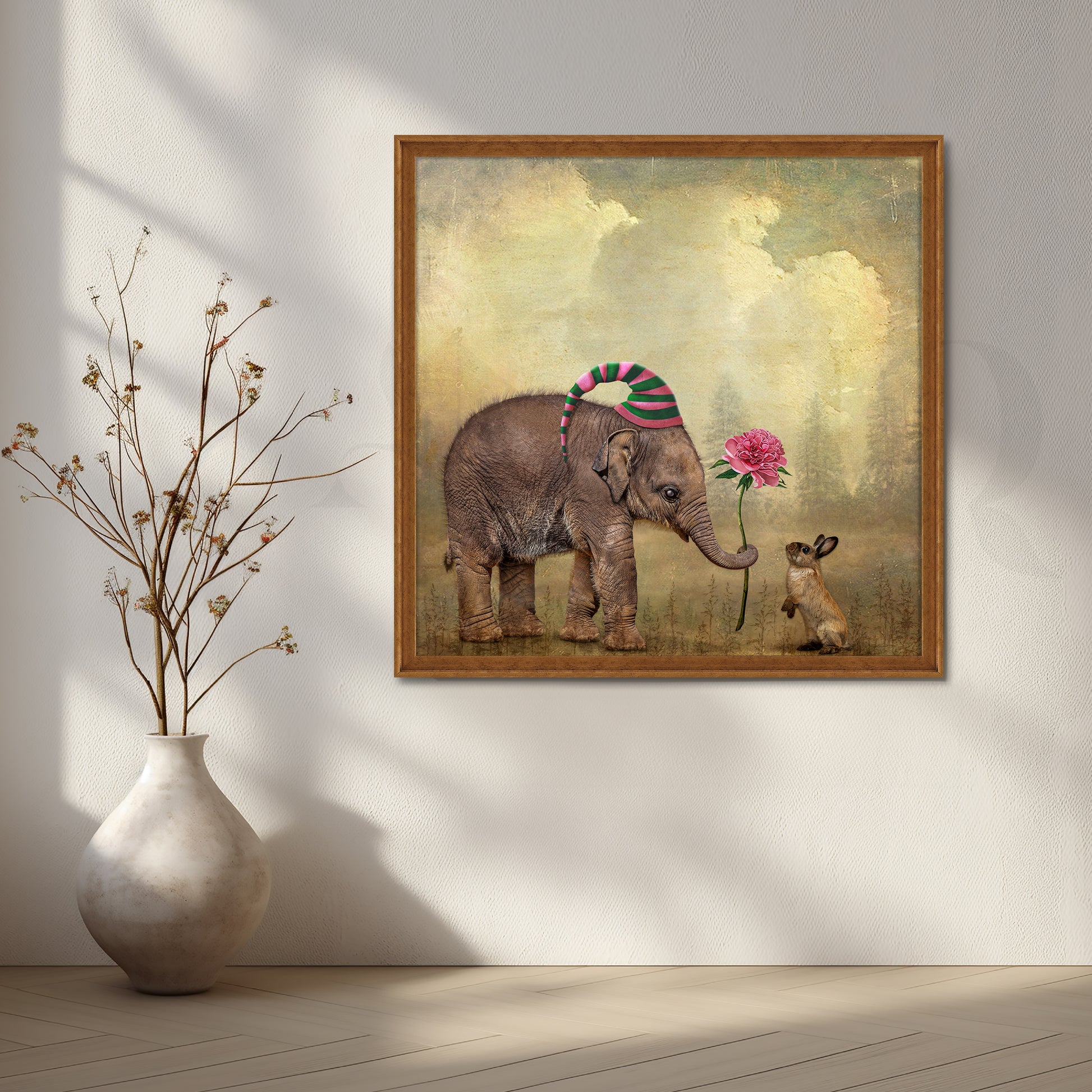 Anciq ‘The Gentle Exchange’ Canvas Artwork beautifully depicts a baby elephant offering a flower to a rabbit, radiating innocence and warmth. Perfect for kids’ rooms or nurseries, this artwork adds a touch of whimsy and kindness. Keywords: elephant wall art, nursery animal painting, kids room decor, cute animal canvas, baby elephant artwork.