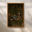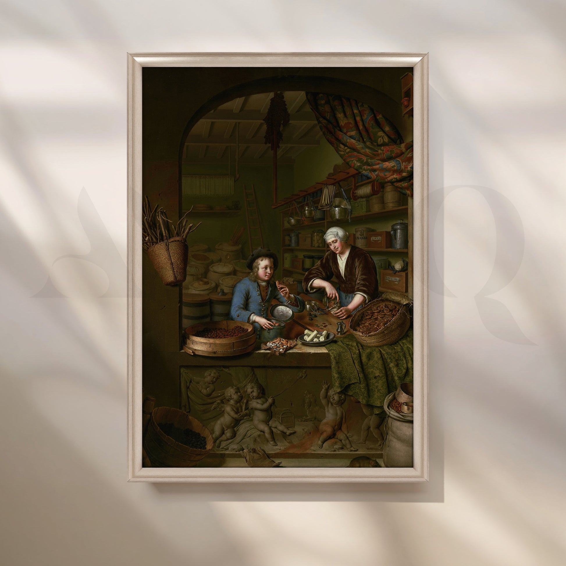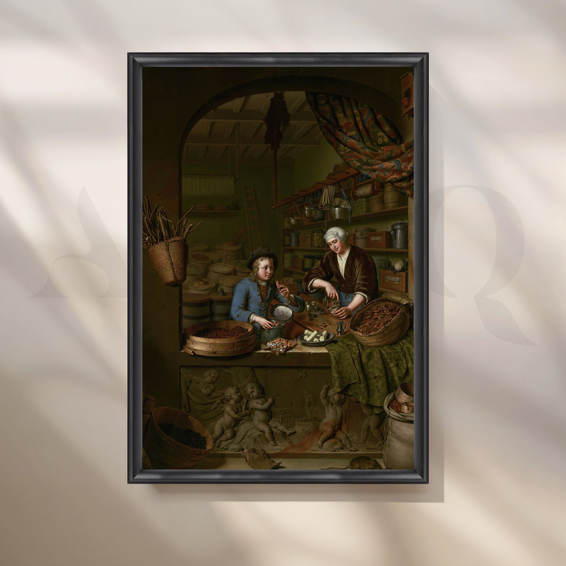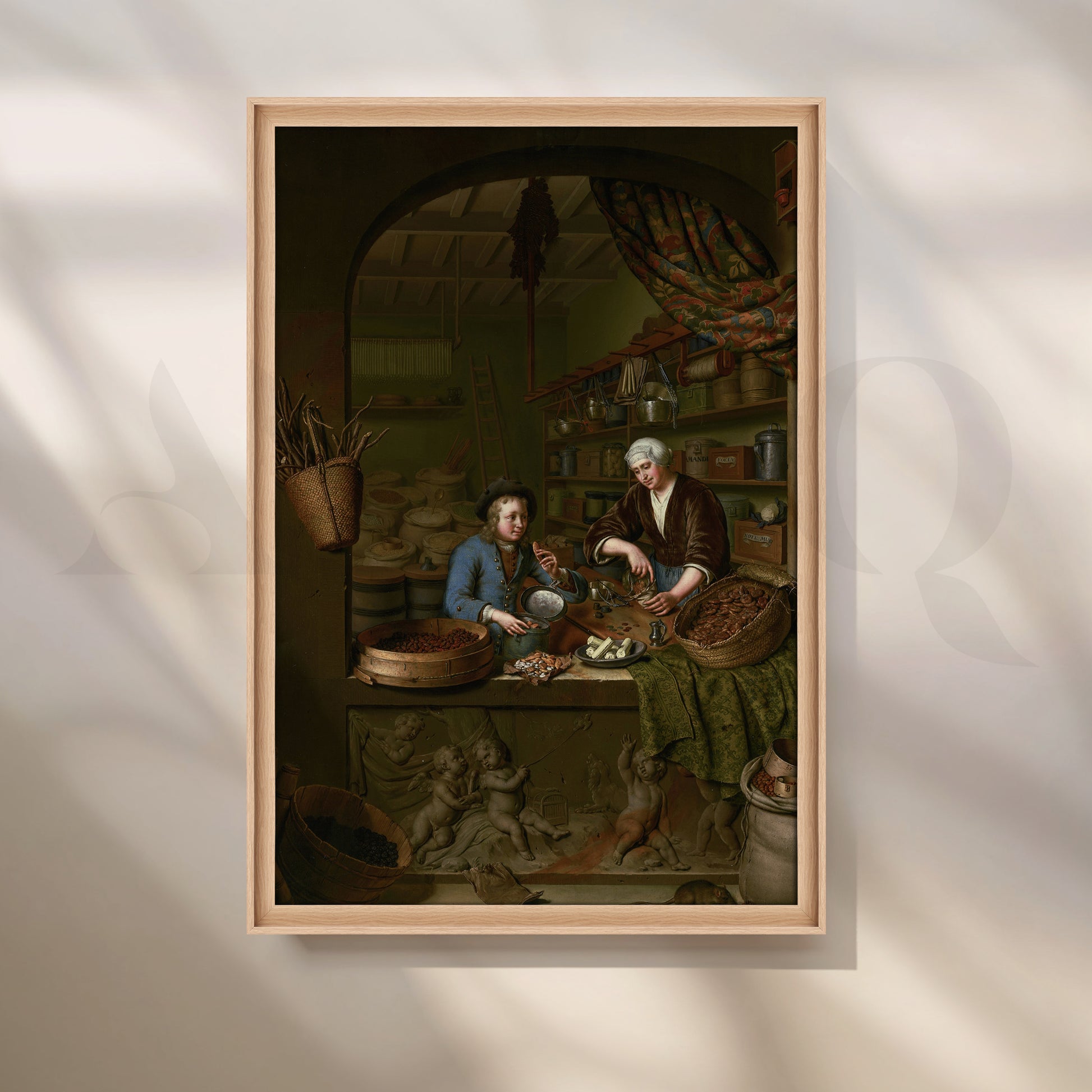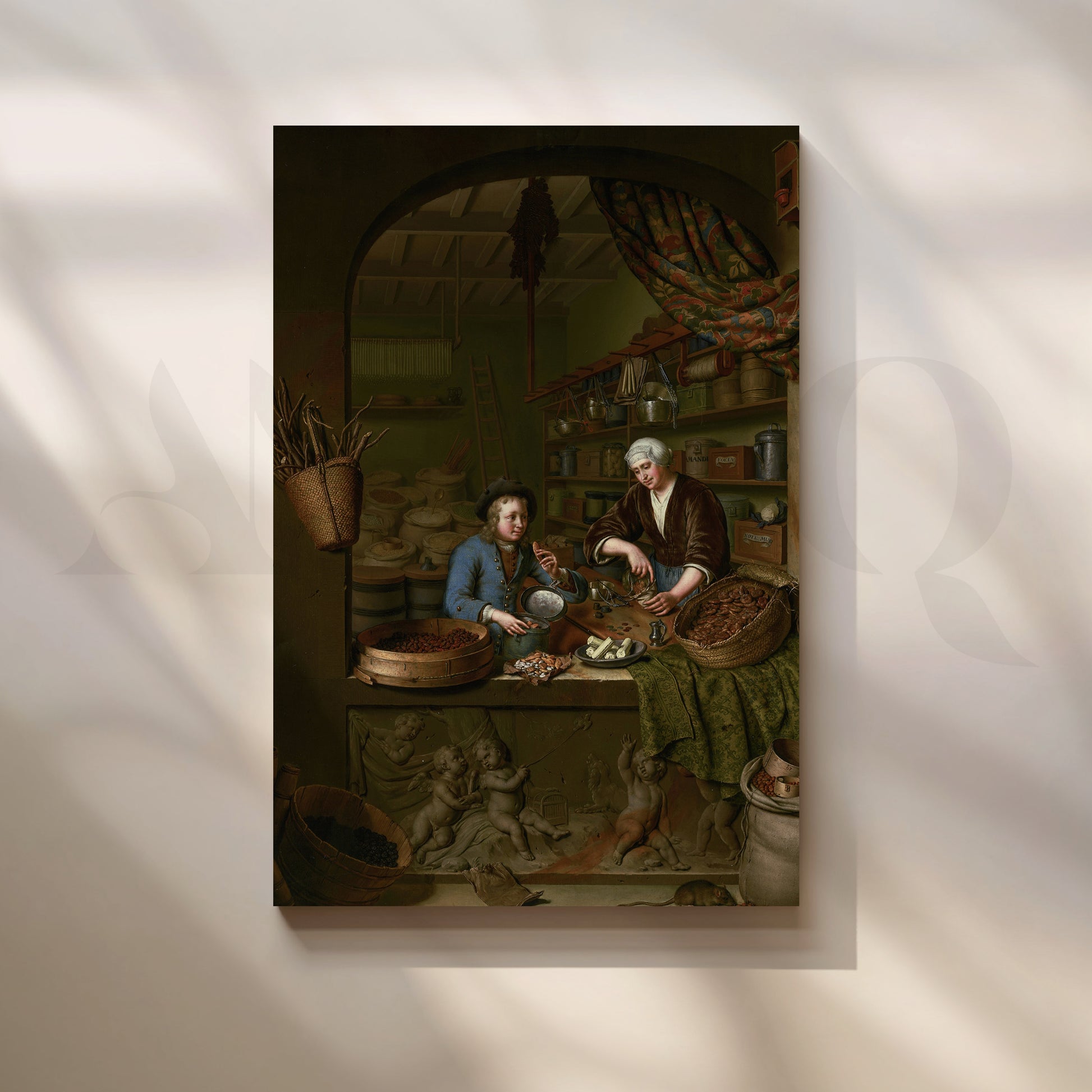 A captivating Anciq canvas artwork illustrating two merchants surrounded by spices and goods, evoking the charm of 17th-century trade markets. Perfect for dining rooms or kitchen walls with rustic or vintage aesthetics. Keywords: vintage market painting, spice trader art, classic European wall decor, rustic dining wall art.