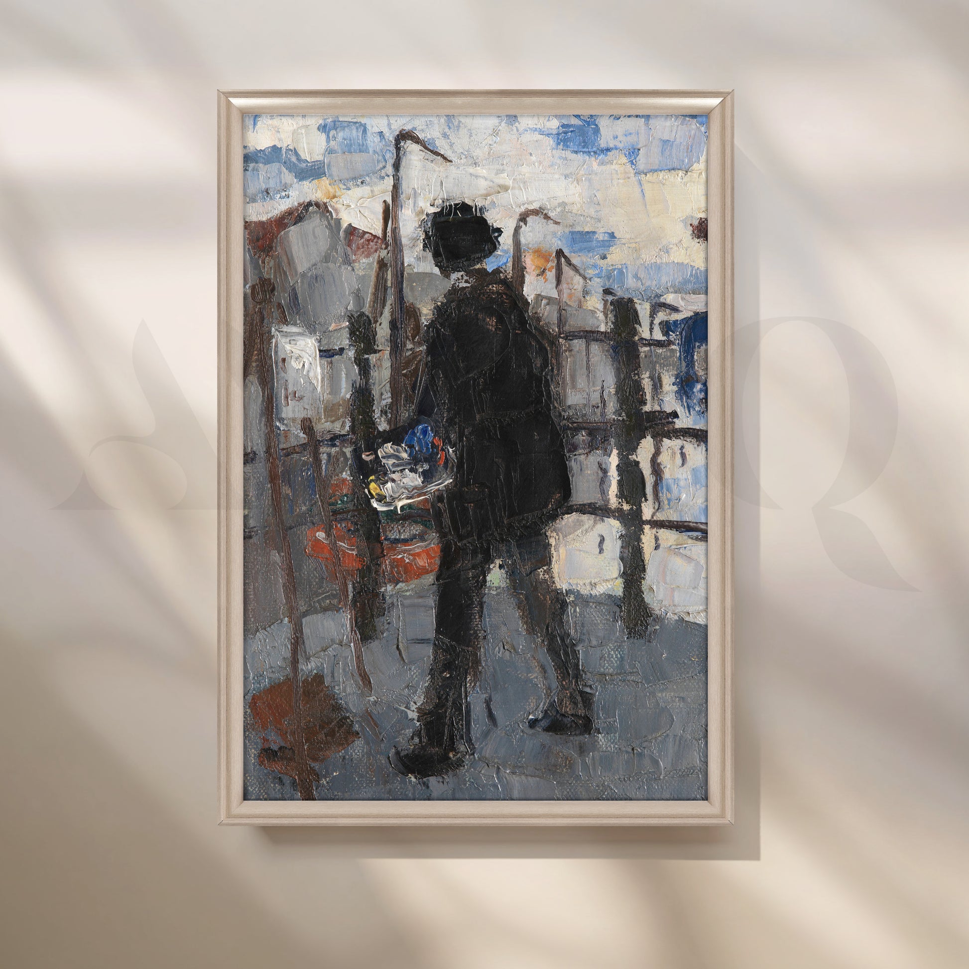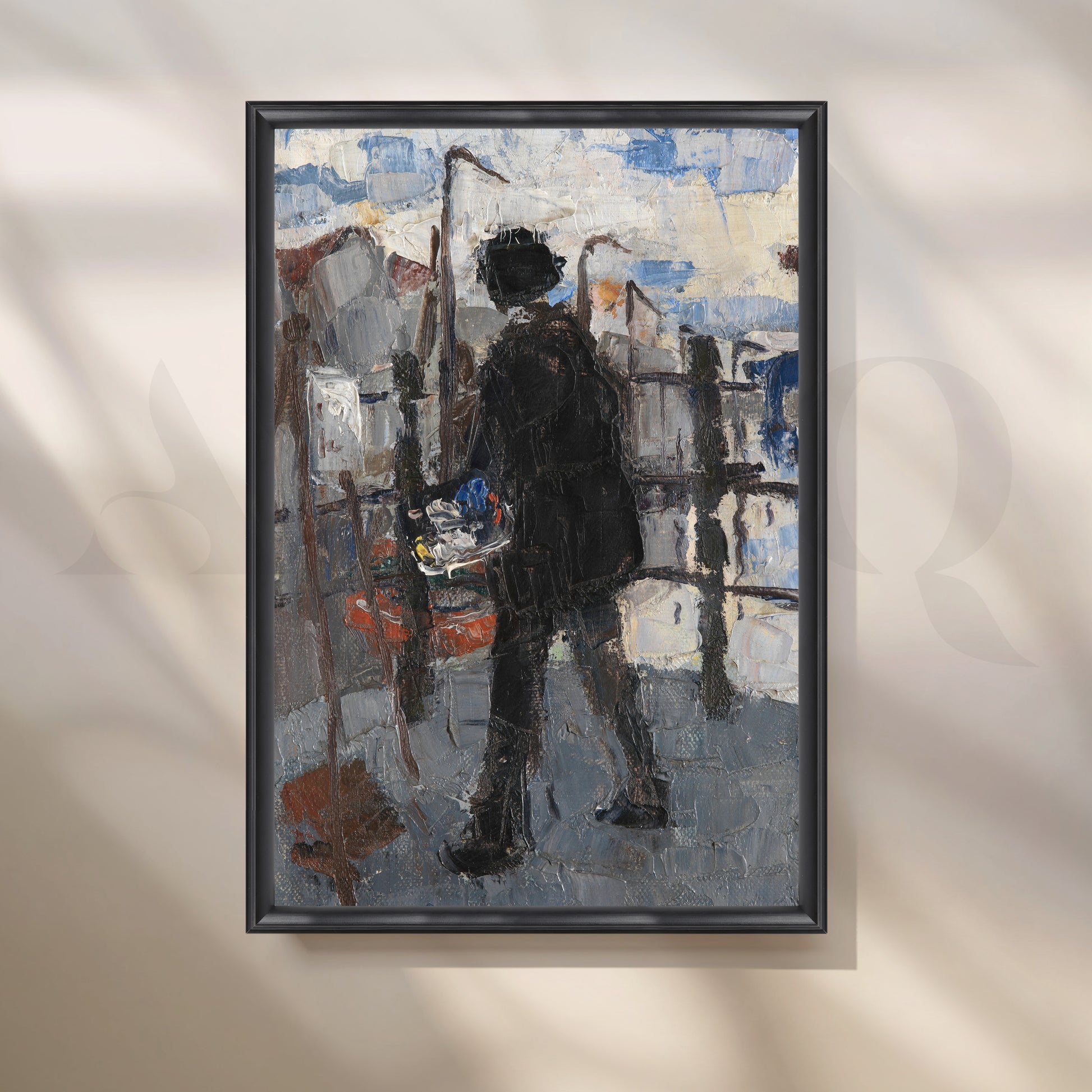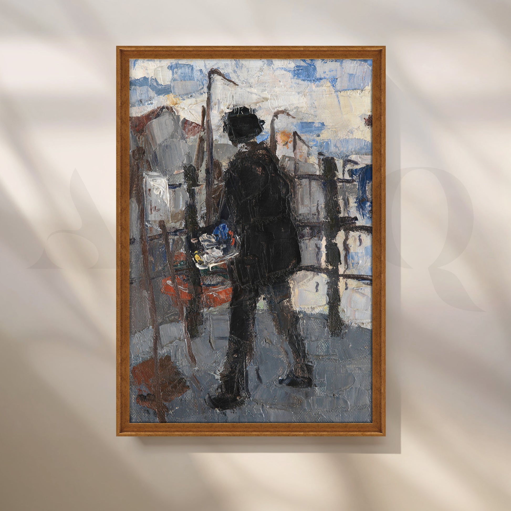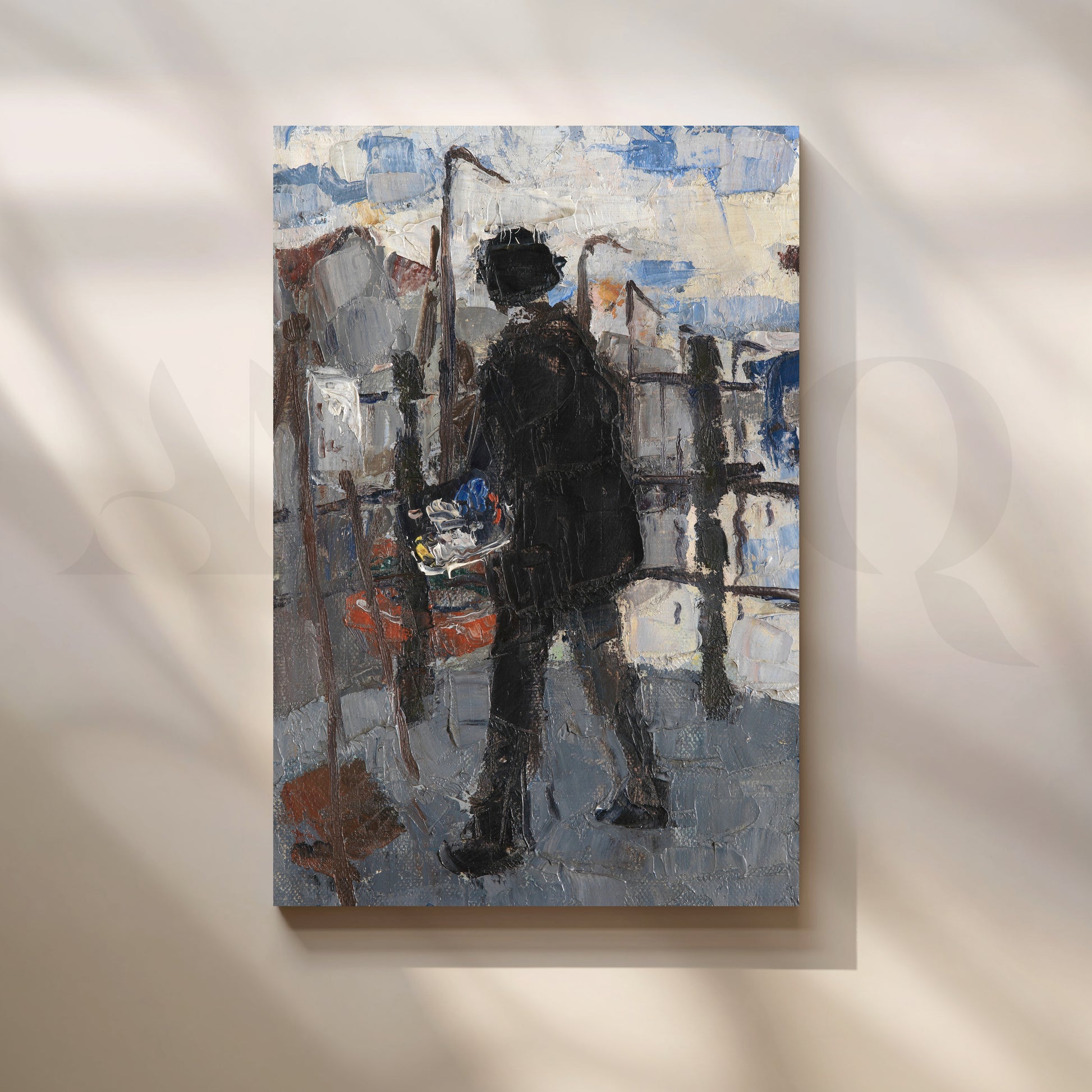 A moody, impasto scene of a lone artist painting en plein air, rendered with thick palette-knife strokes in cool greys and urban blues. The Street Painter brings texture, movement, and artistic energy to studios, hallways, and home offices. The expressive silhouette and city backdrop pair beautifully with contemporary or rustic interiors. Hang it where natural light can skim the surface to highlight its dimensional brushwork. Keywords: impressionist city painting, textured canvas art, artist silhouette wall art, modern hallway décor, palette-knife painting, studio décor, urban art print.