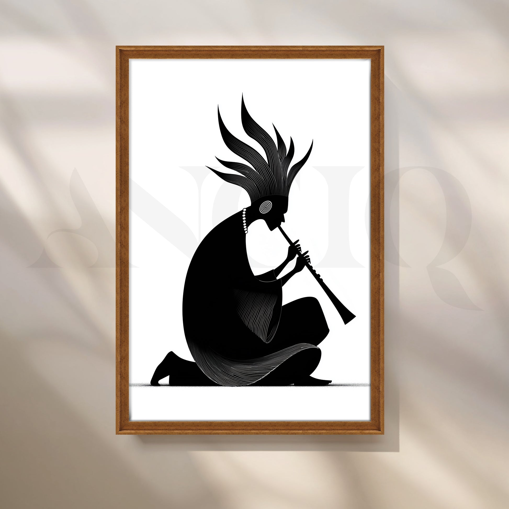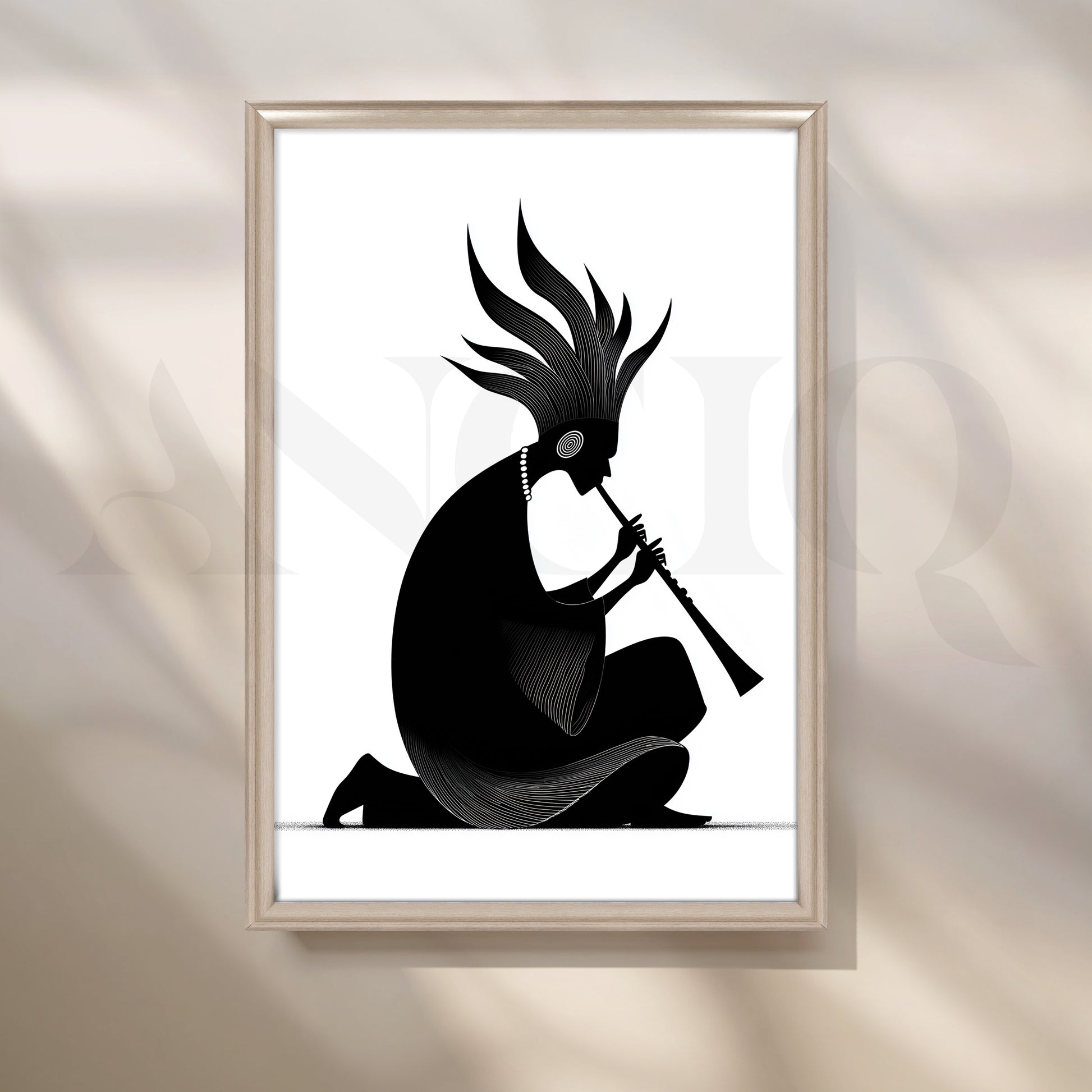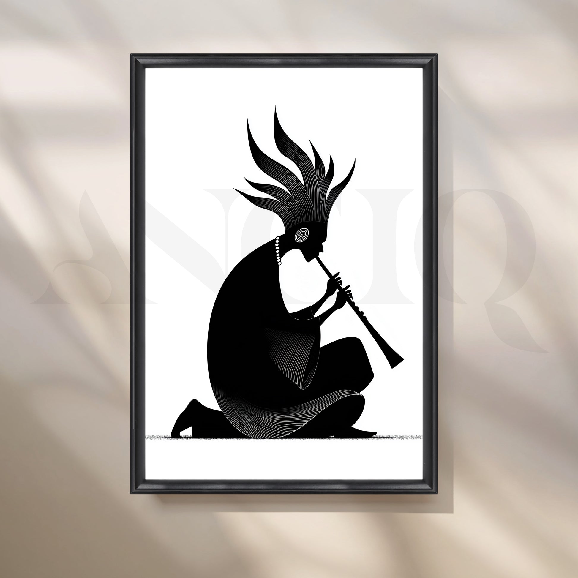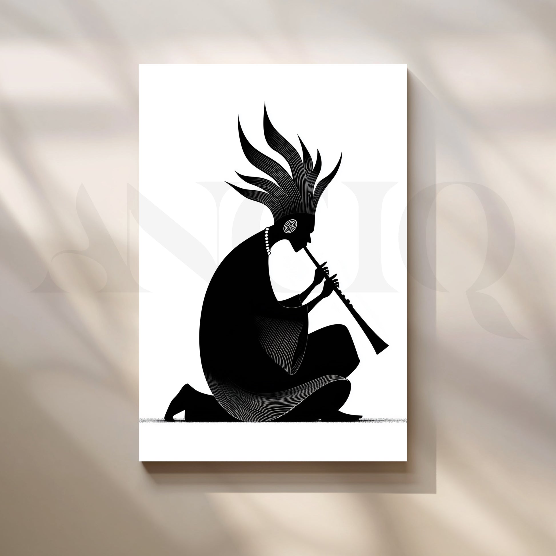This monochrome Anciq canvas portrays a tribal musician kneeling and playing a wind instrument. The minimal black-and-white tones evoke focus and rhythm—perfect for offices, studios, or music corners. Keywords: tribal art painting, musician wall decor, monochrome canvas art, minimal black and white painting, modern tribal artwork.
