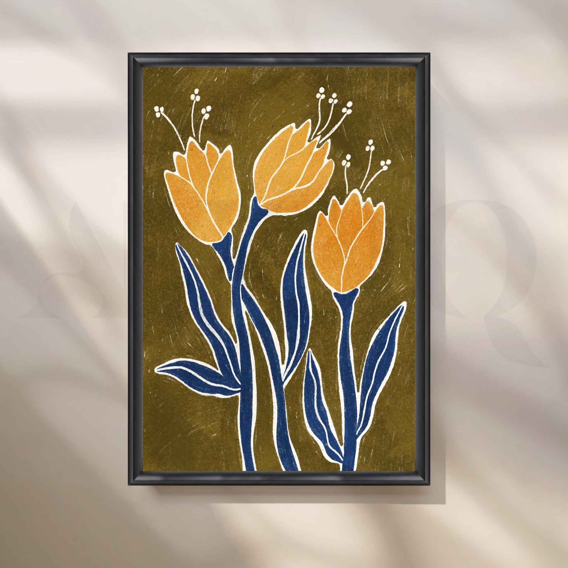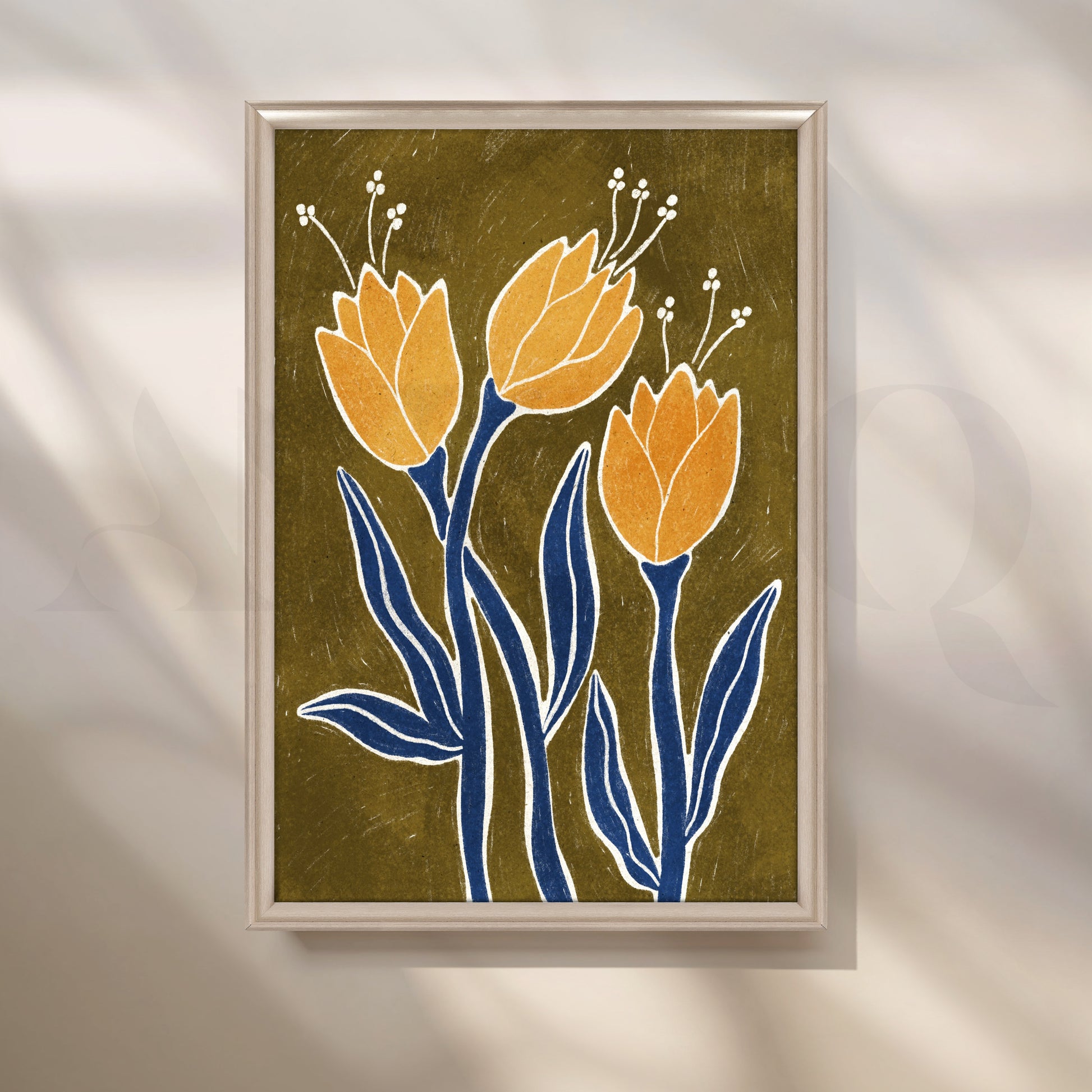 Three Golden Blooms Boho Art: This artwork showcases three golden flowers in full bloom, their simple blue stems and leaves adding a bold contrast against the muted background. The flowers are adorned with delicate white accents, giving the piece a handcrafted, textured feel. The earthy tones and minimalist design capture the quiet beauty of nature in a stylized, almost abstract form.