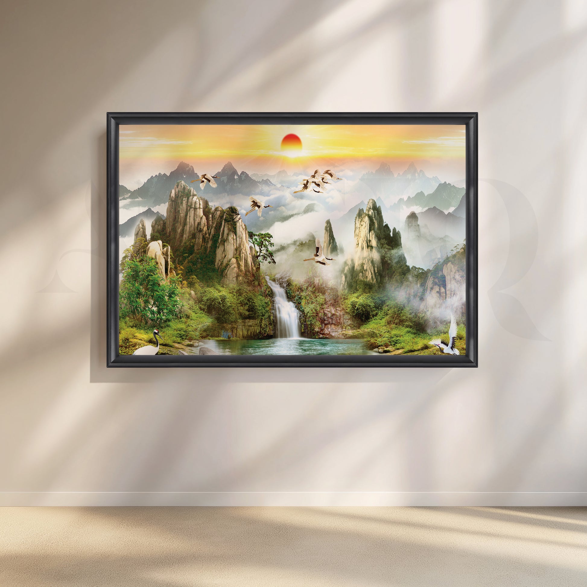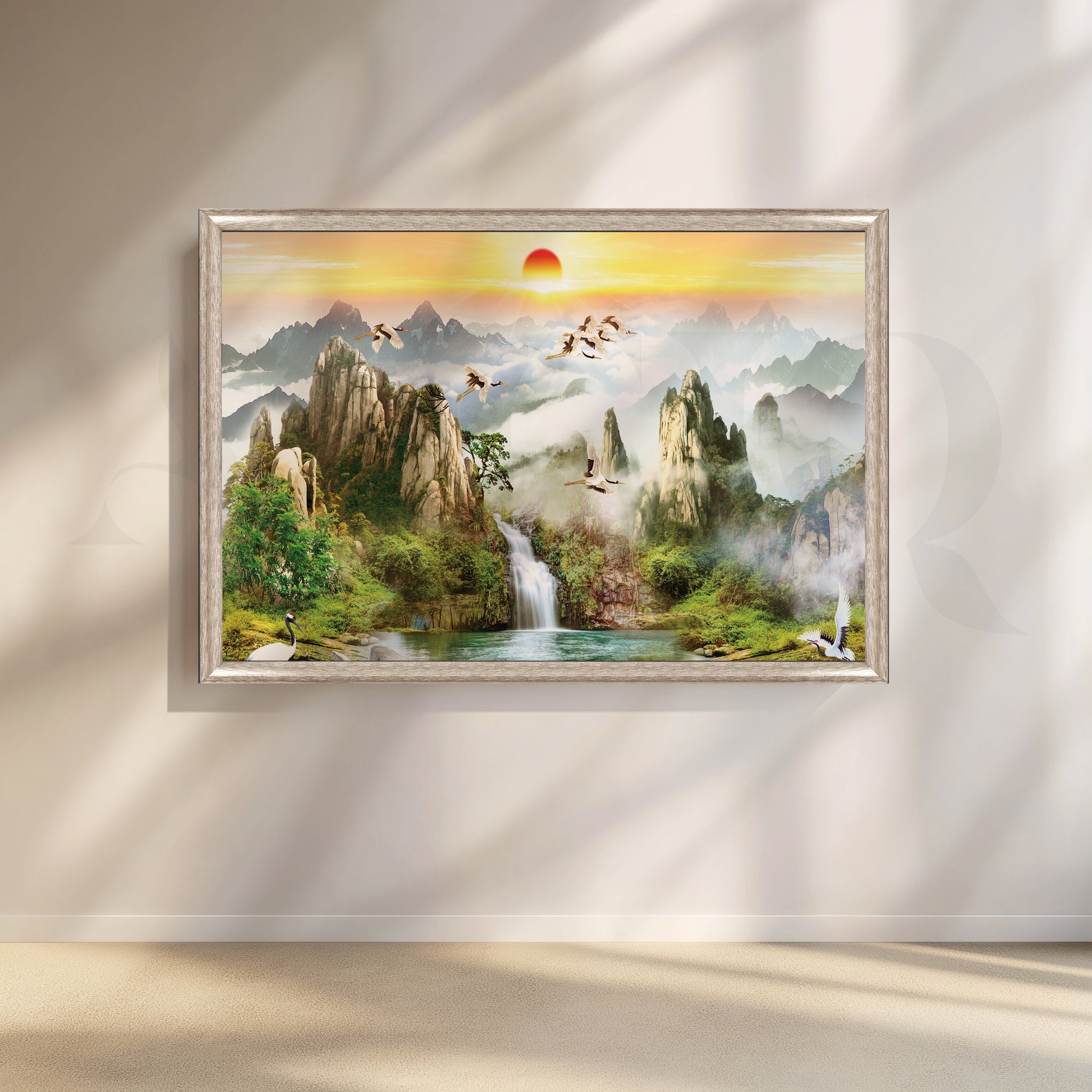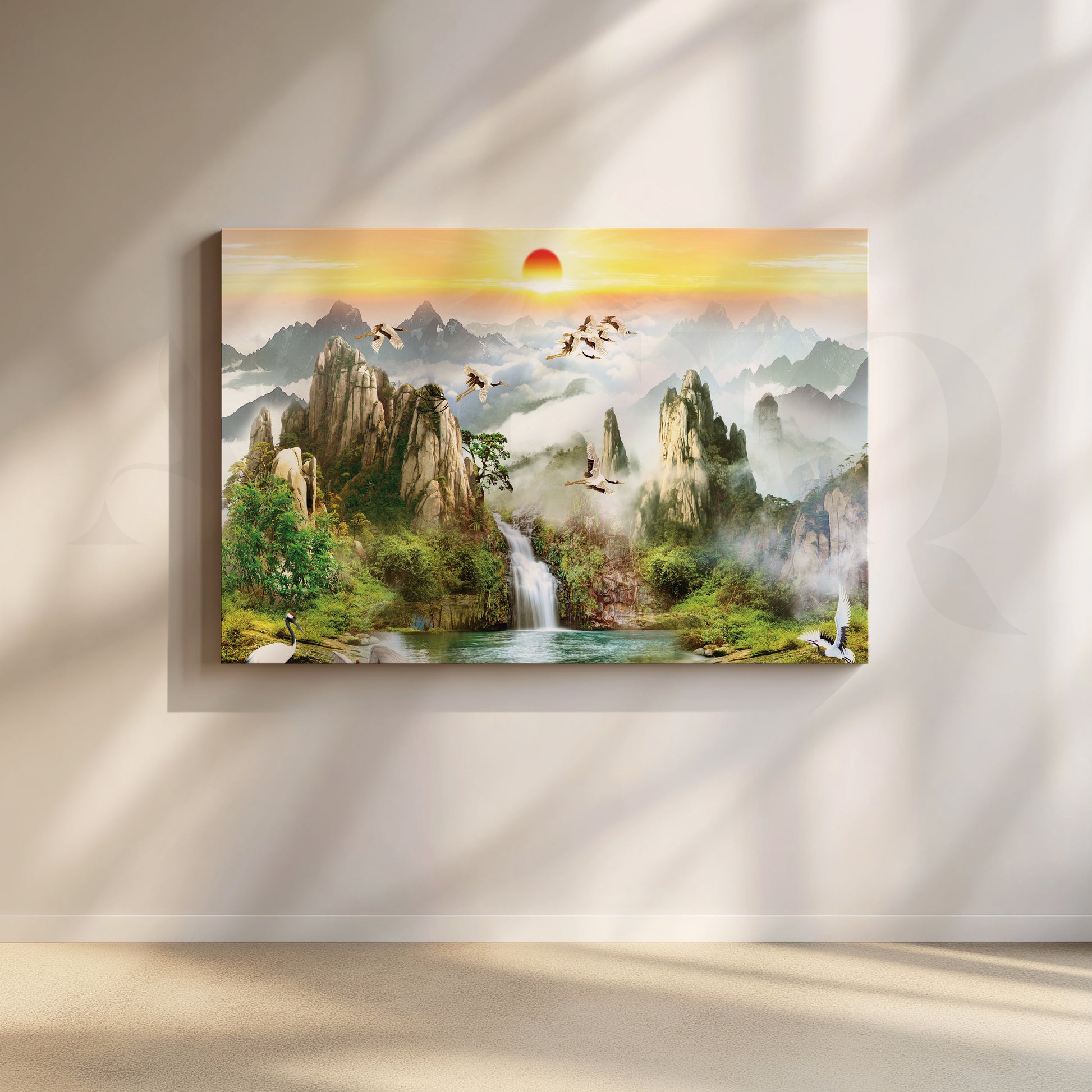 This mesmerizing canvas depicts a spectacular waterfall cascading down the mountain. A flock of cranes glides gracefully above the waterfall. The vibrant colors and detailed brush work create a serene and dramatic landscape. This piece of art would be a beautiful addition to any home or office.
