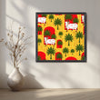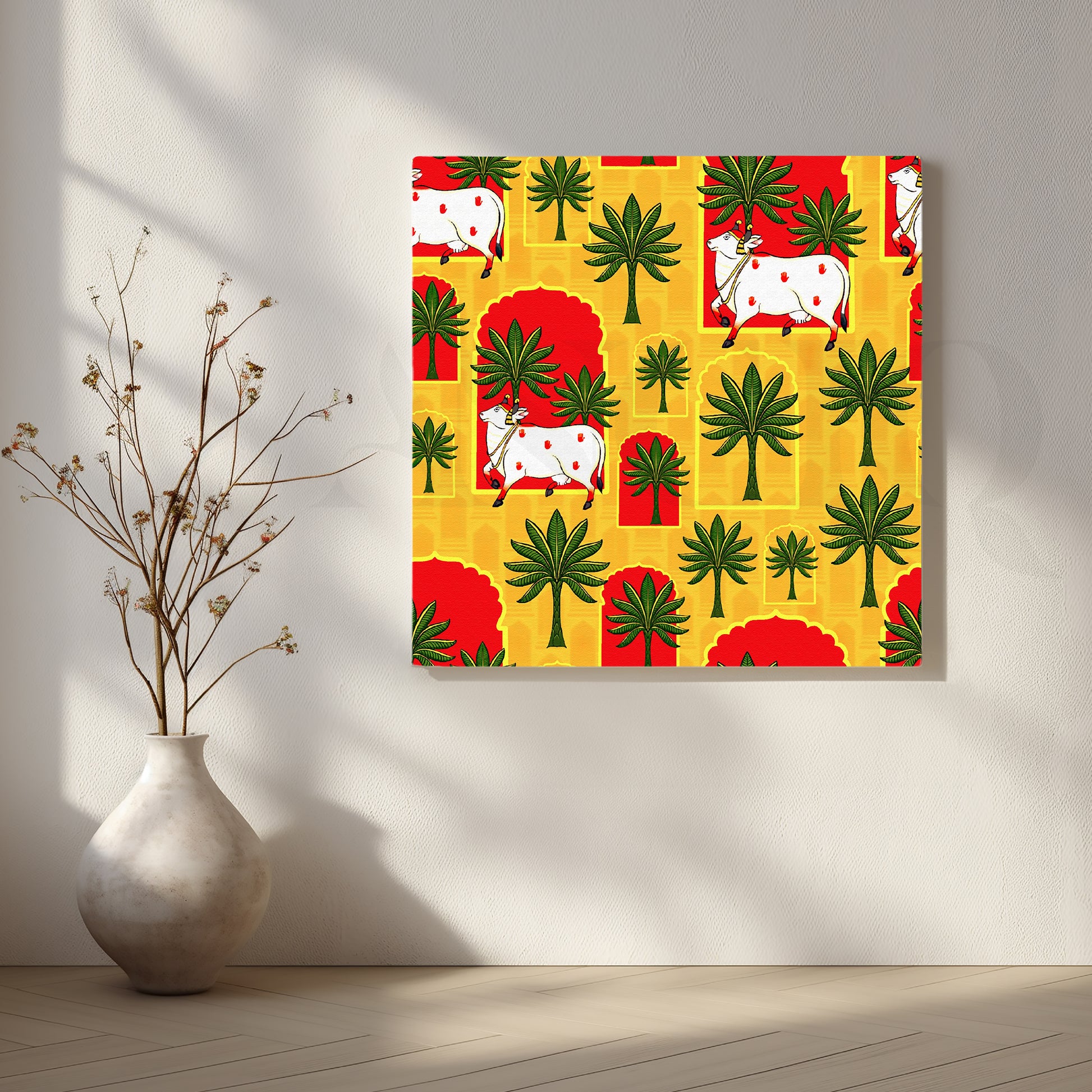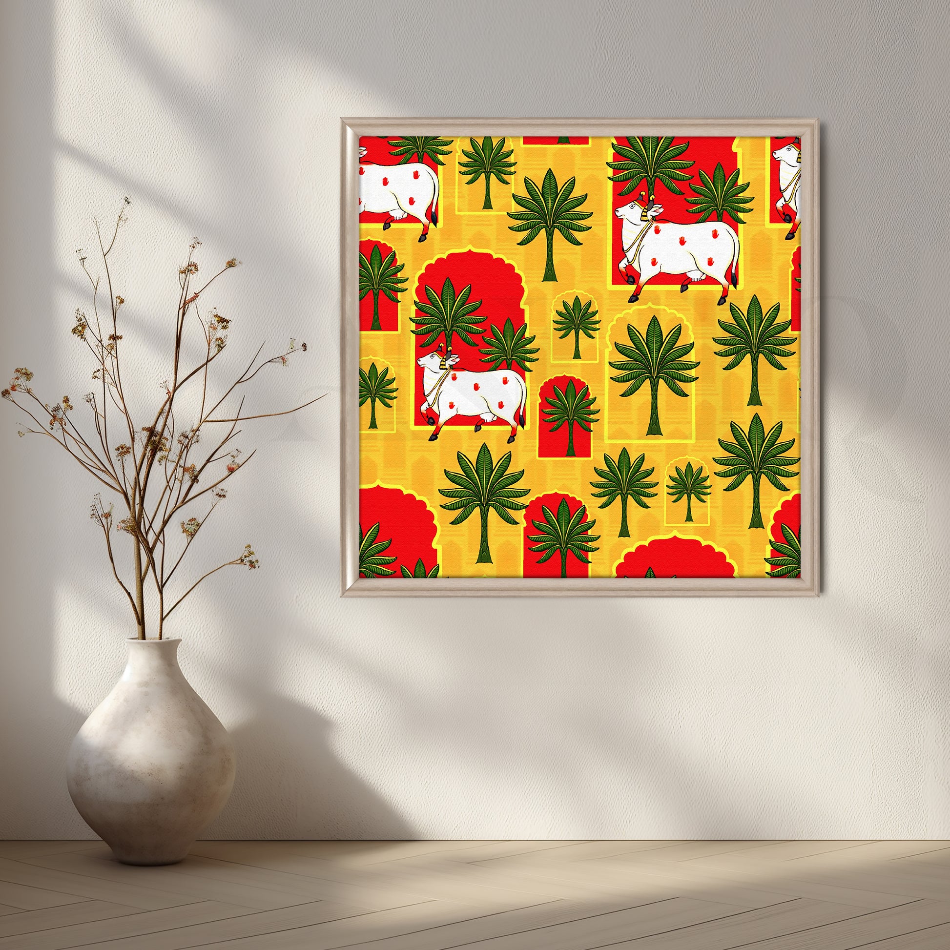 Traditional Cattle and Palm Motifs Against Vibrant Geometric Backdrop
