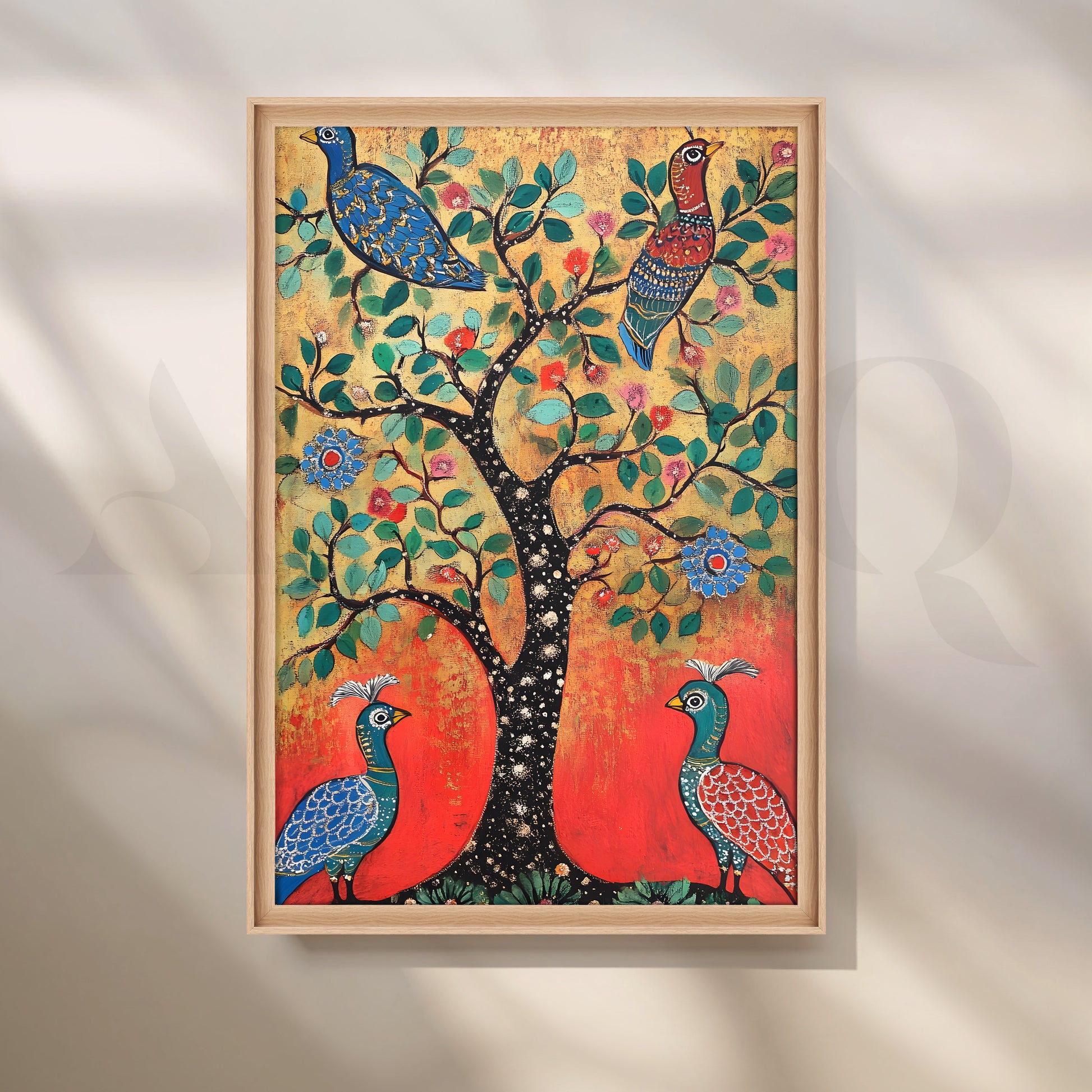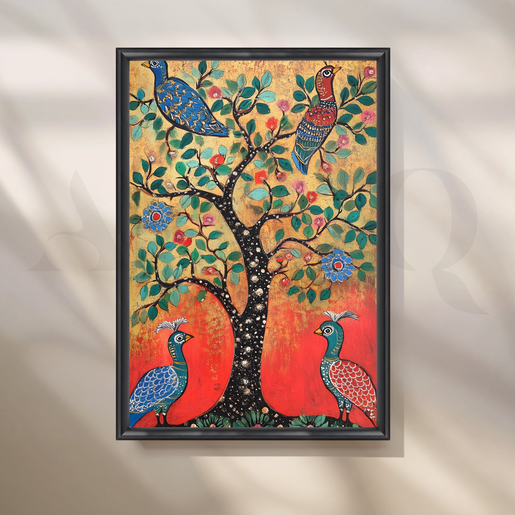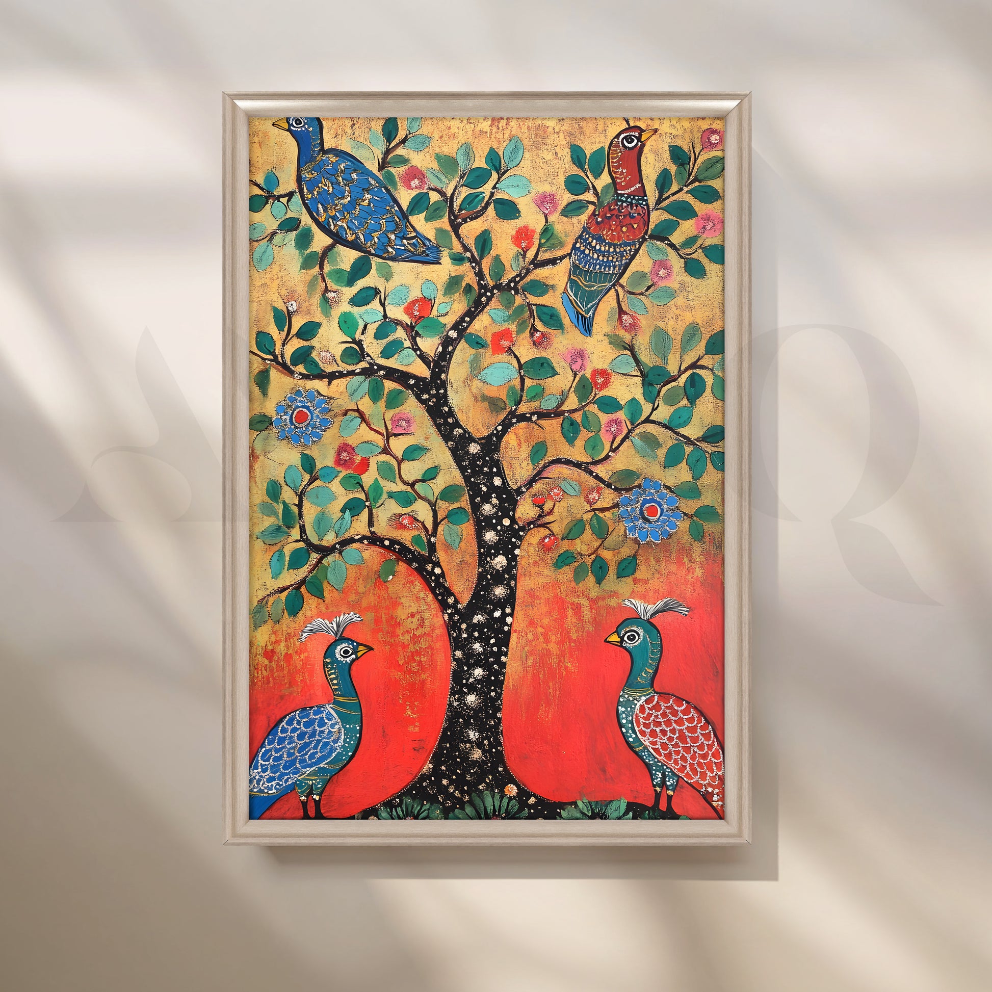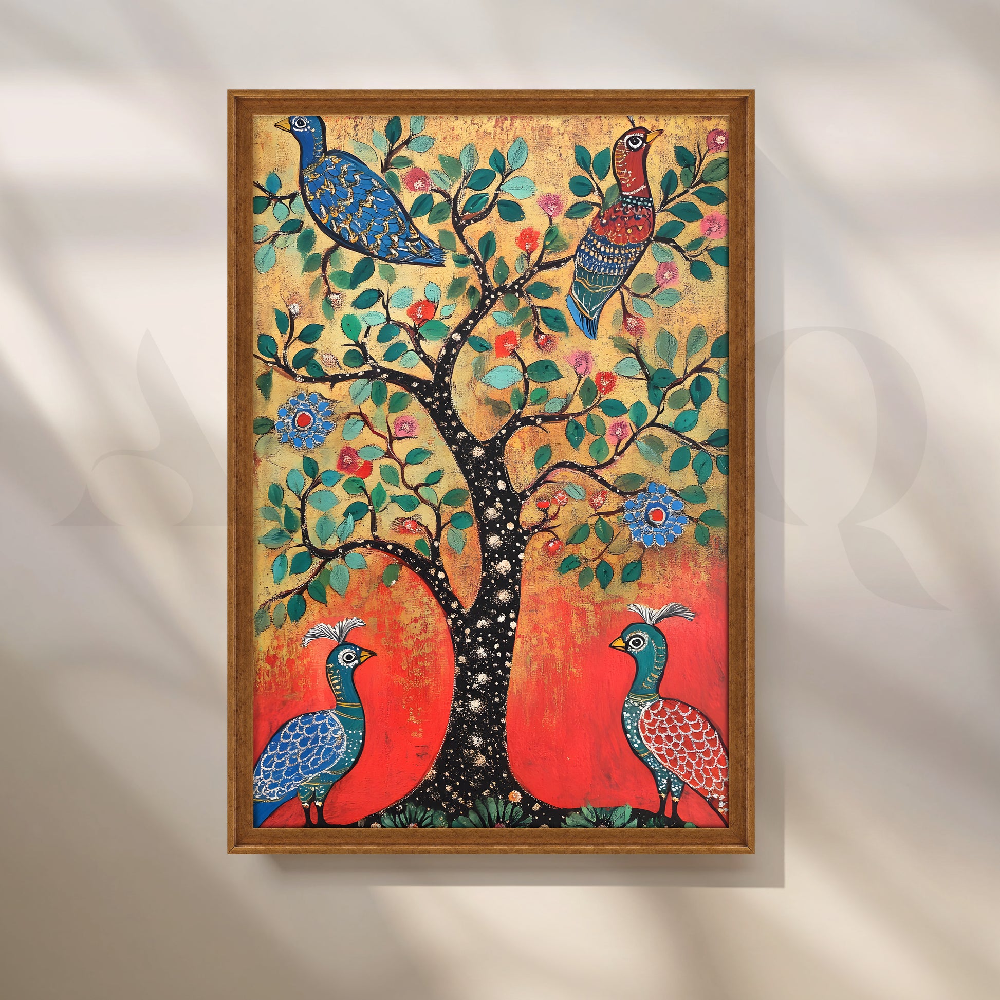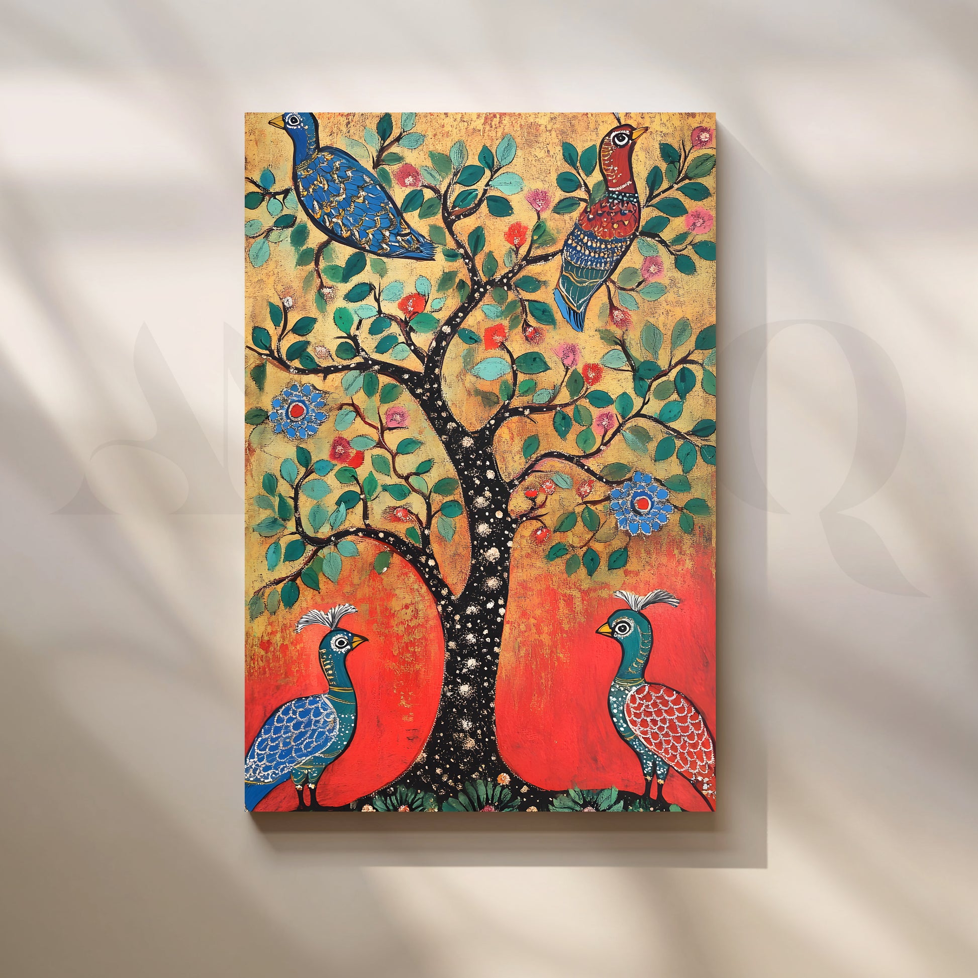 Featuring detailed peacocks perched around a blooming tree, this folk-style canvas blends warm reds, greens and golds to create a festive Indian aesthetic. Ideal for living rooms, puja rooms and gifting. Optimized for searches like peacock folk art, Indian tree of life painting and colourful ethnic wall décor.