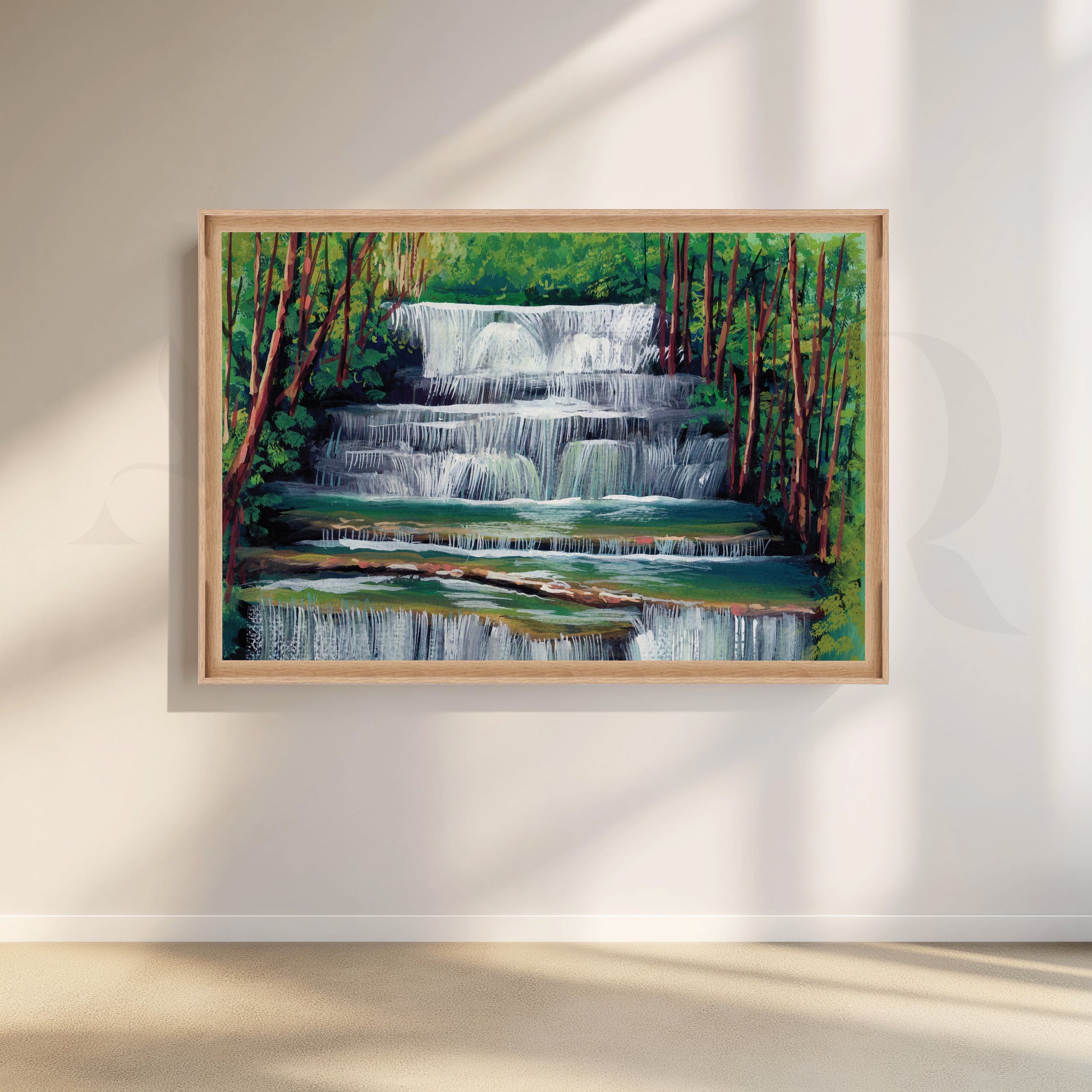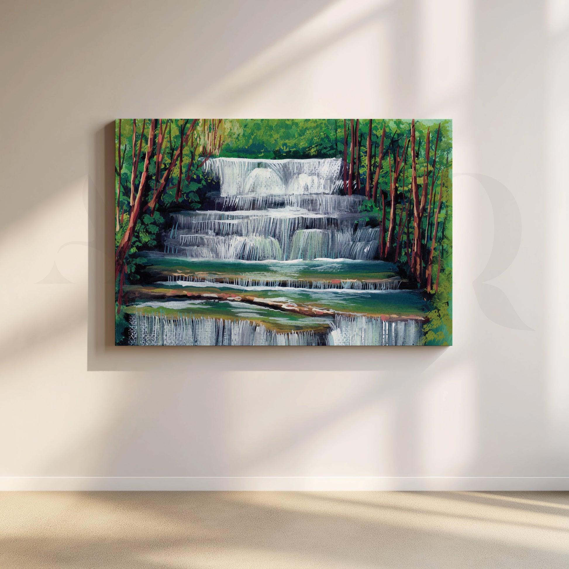 Bring a little tranquility to your home with this beautiful canvas of a waterfall surrounded by lush vegetation. Vibrant colors and detailed brush work create a realistic portrait that transports you to the tranquility of a forest. This canvas is perfect for any room in your home and will definitely be a conversation starter for guests.