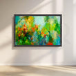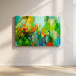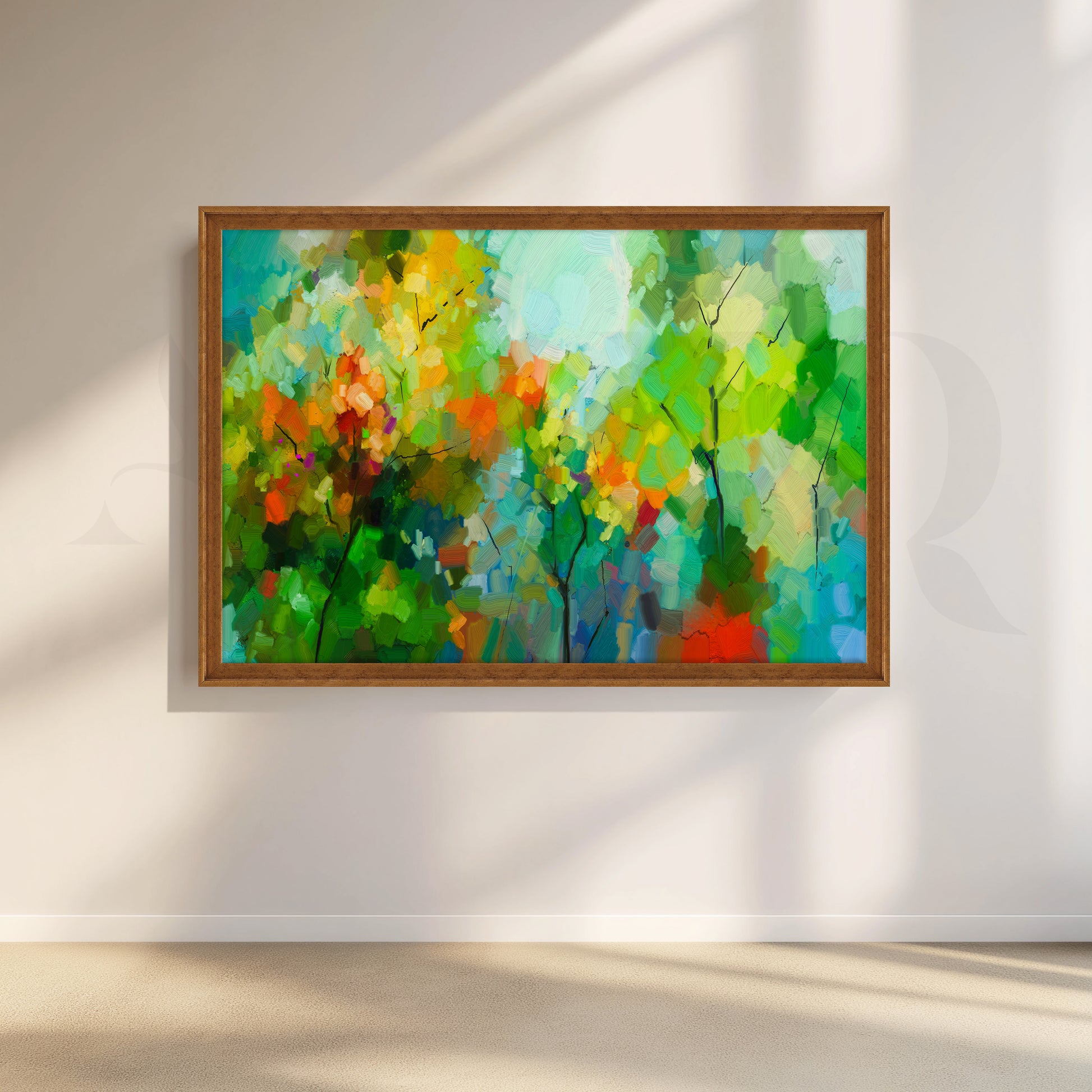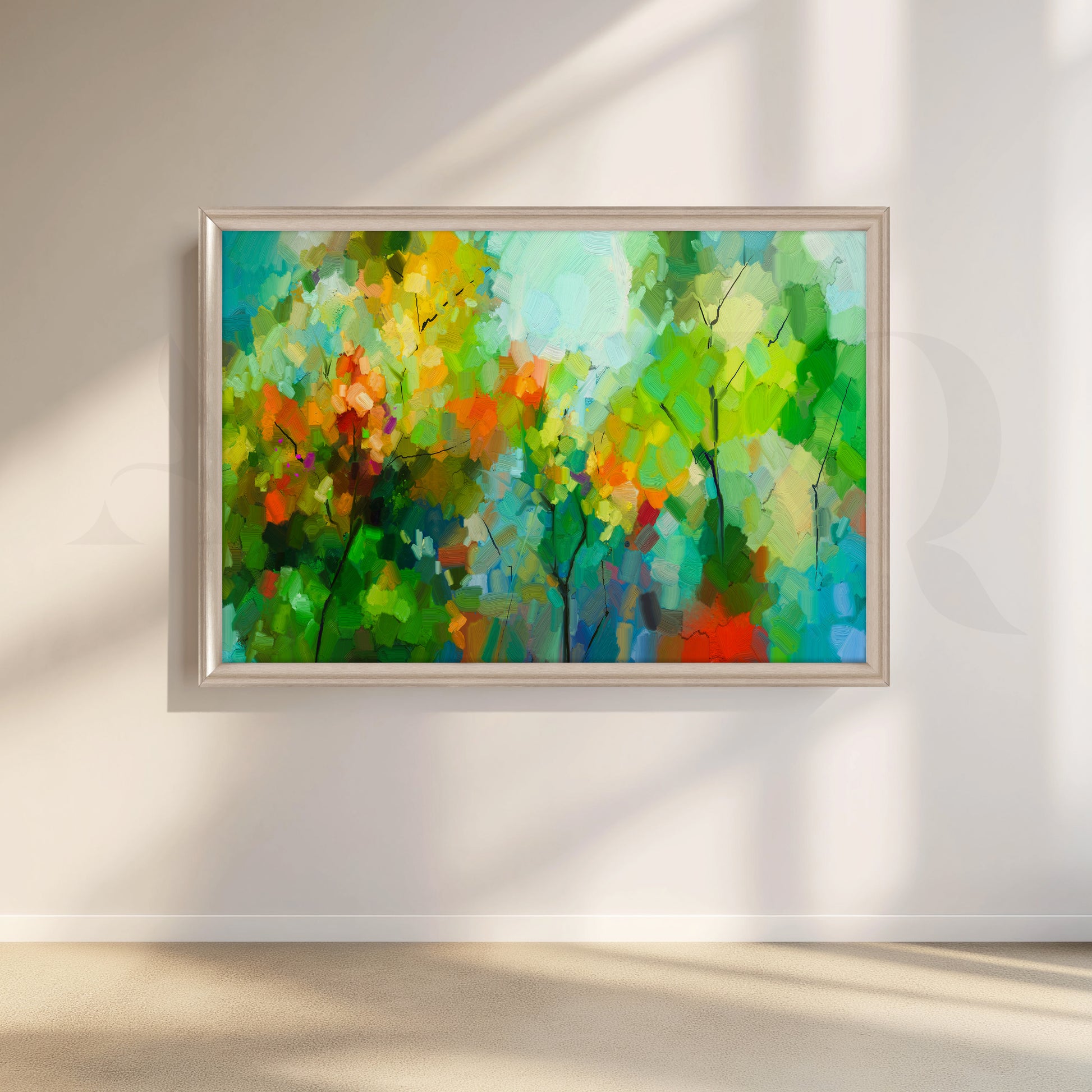 The "Tranquil Solitude Canvas Wall Painting" transcends the ordinary with its captivating abstract forest. Lush greens and fiery reds erupt from a central tree, reaching towards a clear blue sky. This vibrant symphony of color brings a touch of untamed beauty to any space.