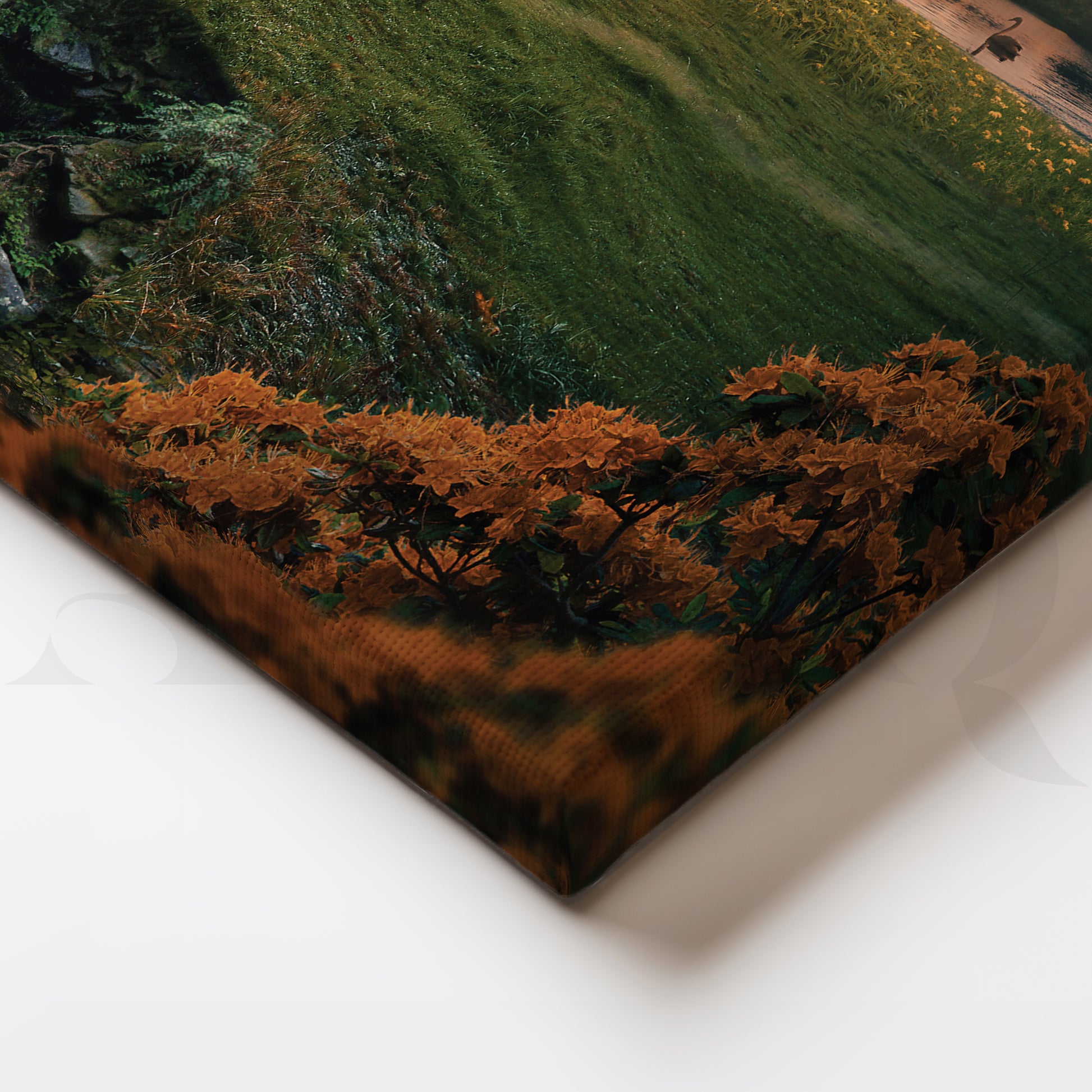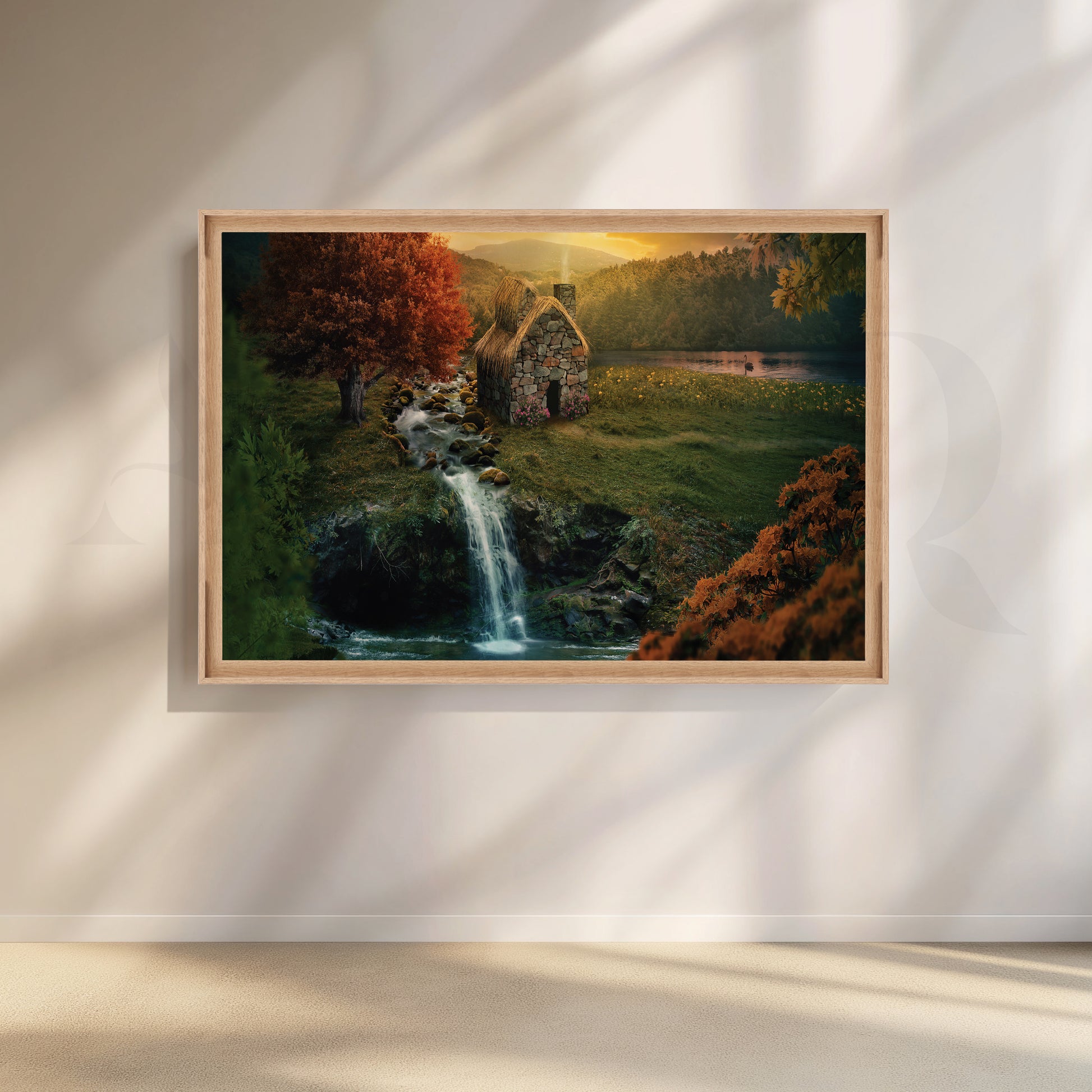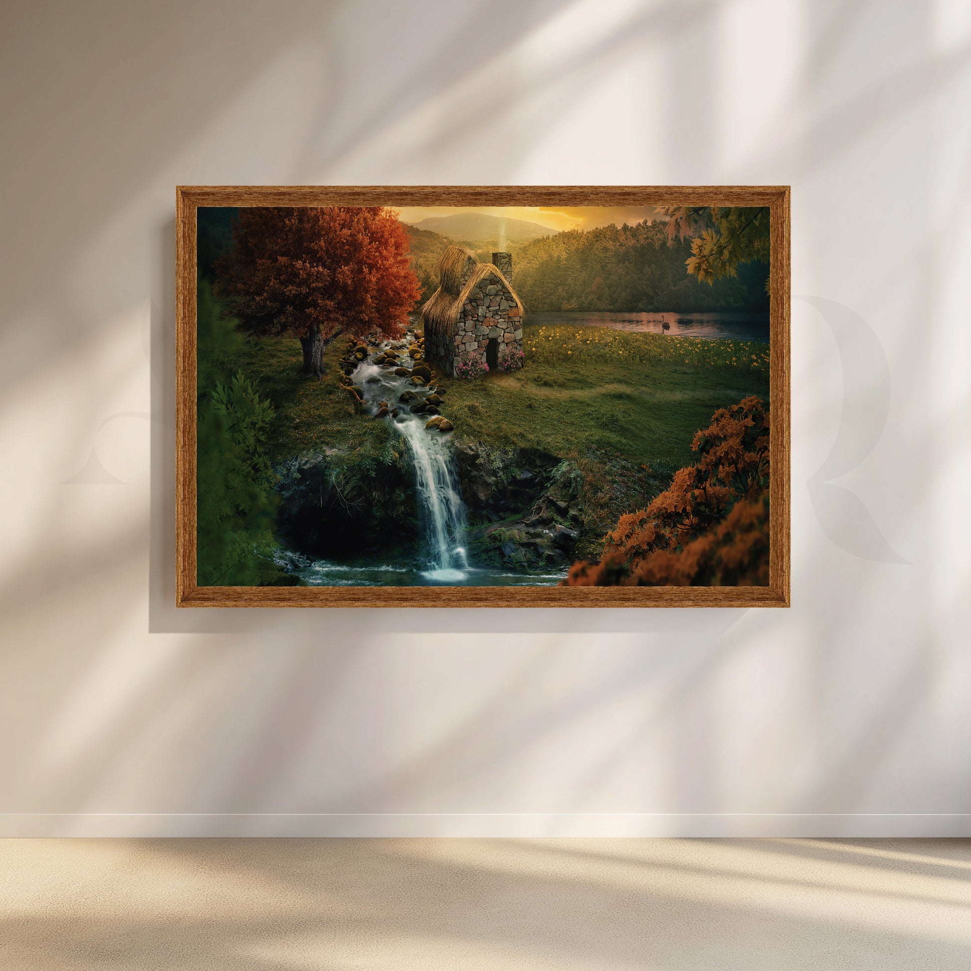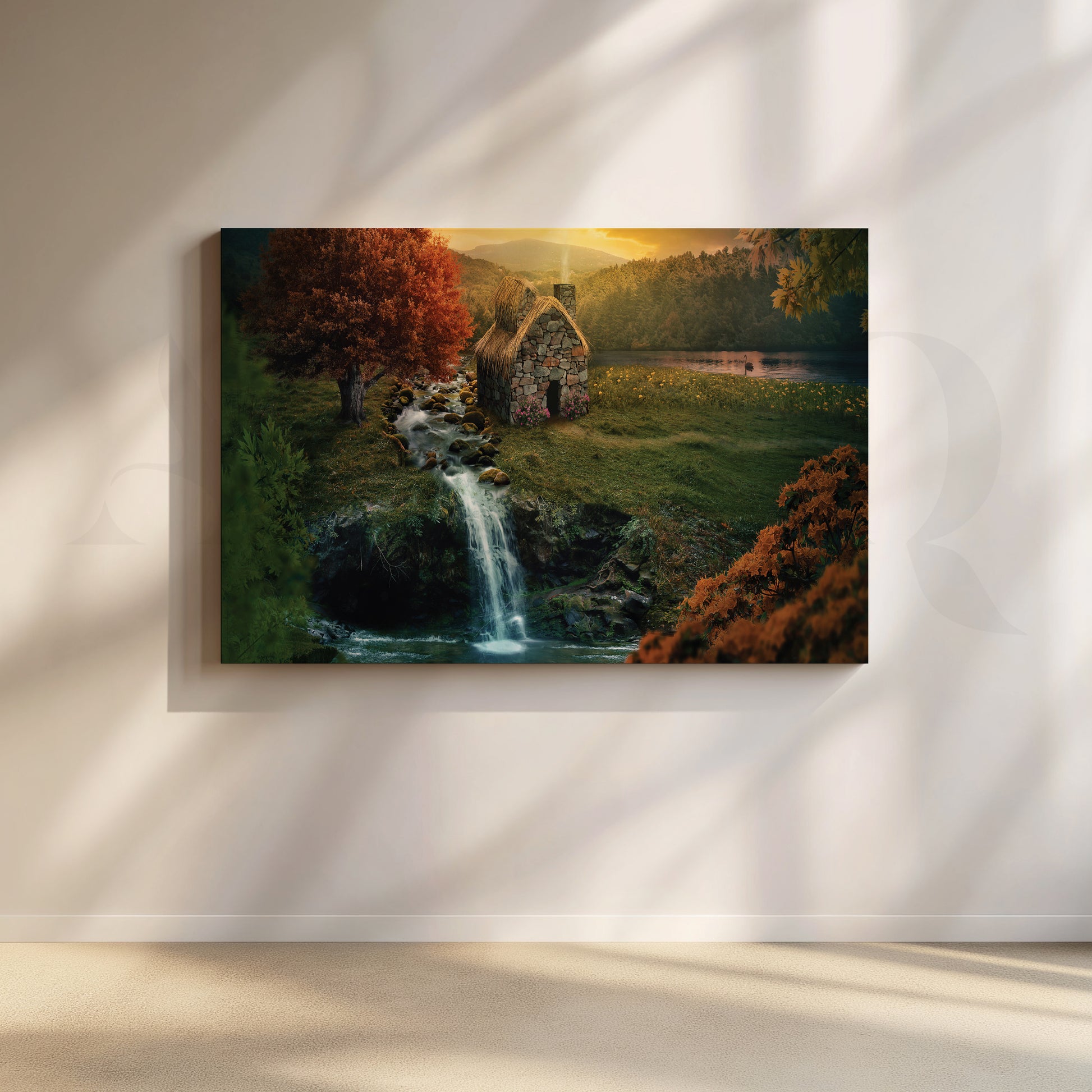 Bring a little tranquility to your home with this beautiful canvas of a house next to a waterfall. The stone building is lush green, while vibrant flowers add a pop of color to the space. Made with these beautiful patterned canvas, they are perfect for adding a touch of nature to any room.
