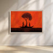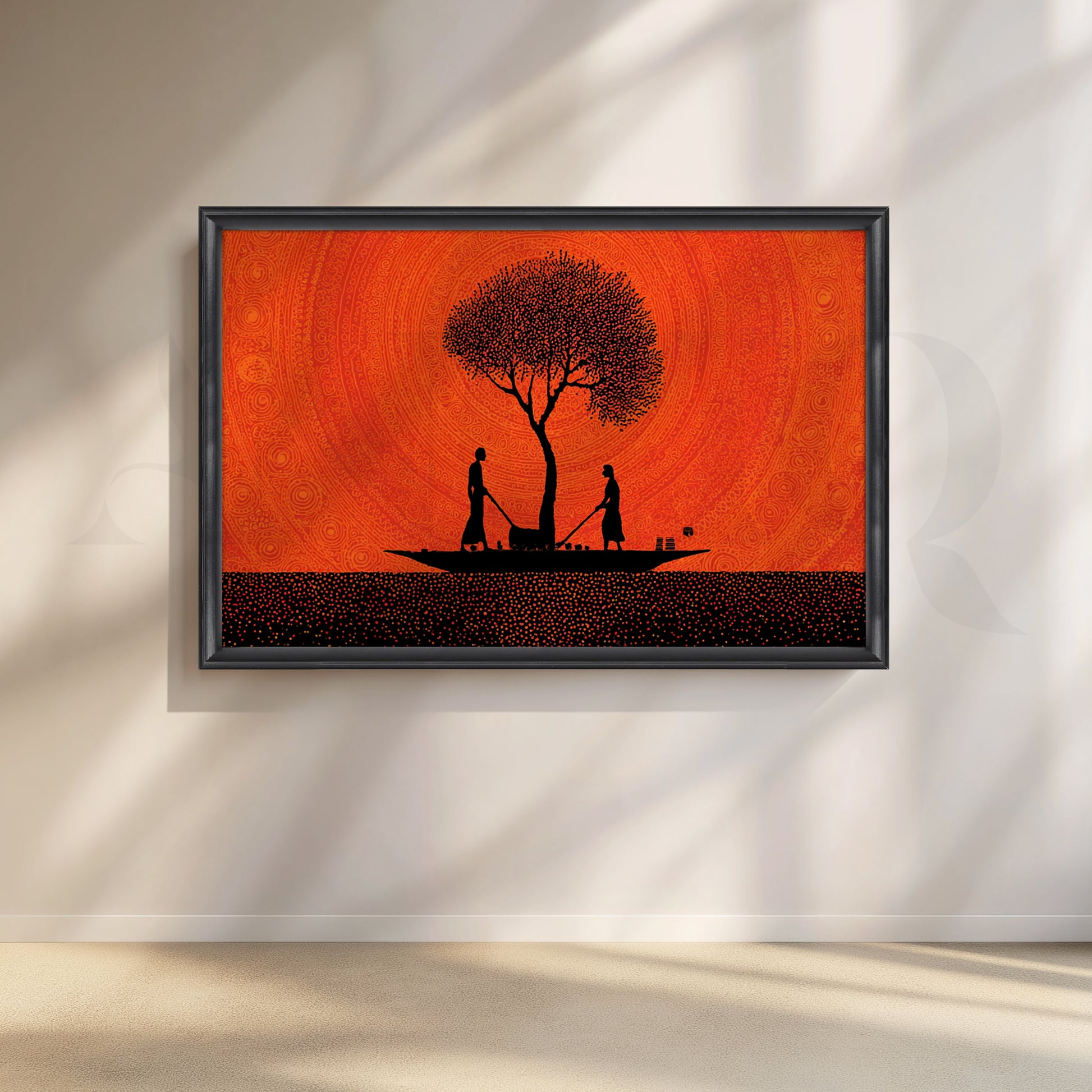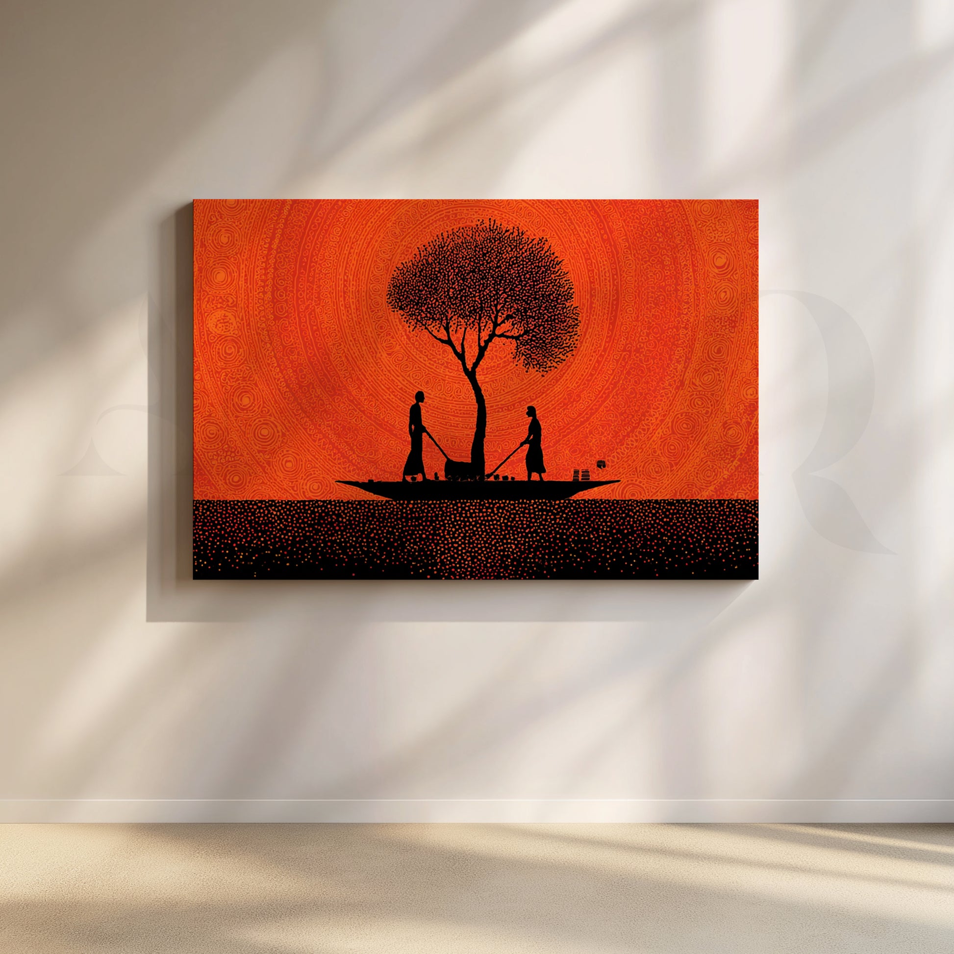 Centered on a graceful tree growing from a boat, this orange Warli canvas symbolizes harmony and balance. Concentric patterns ripple like calm water, while two figures share a quiet voyage—perfect for bedrooms, meditation corners, or reading nooks. The earthy orange glow adds warmth without clutter. Keywords: Warli tree of life, calming bedroom art, orange canvas painting, spiritual wall décor, minimalist tribal artwork, zen home décor.