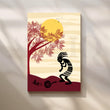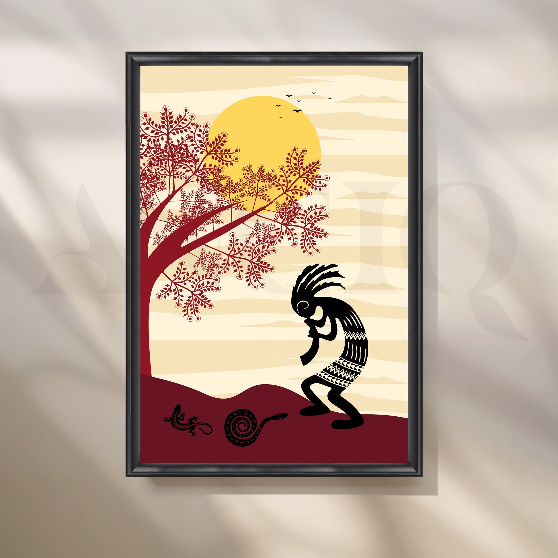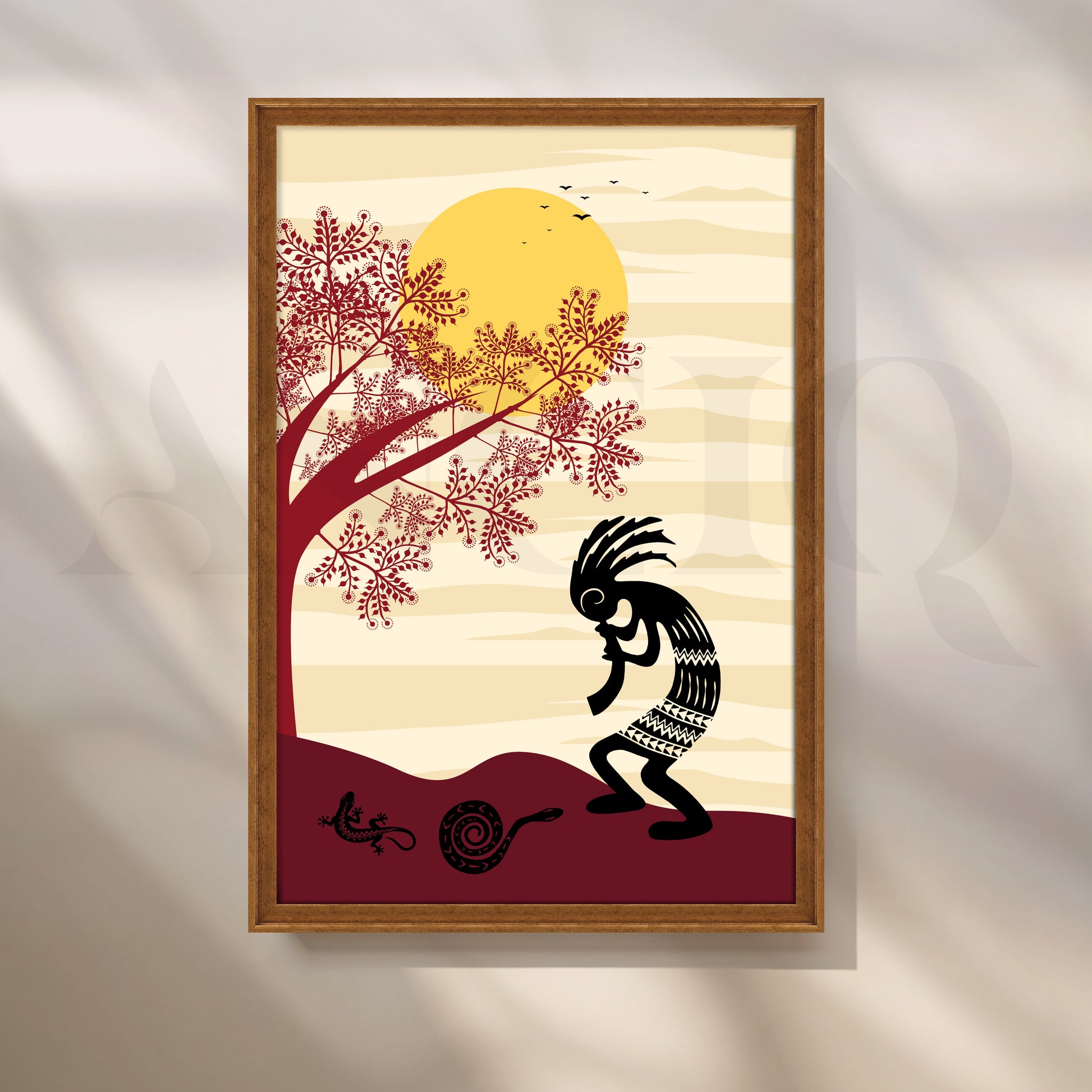 This Anciq canvas painting captures a tribal musician playing the flute under a golden sun beside a red tree. The earthy beige and maroon tones create a warm, cultural vibe perfect for living rooms, cafés, or creative corners. Ideal keywords: tribal art painting, boho wall decor, flute player canvas art, ethnic wall art for home.