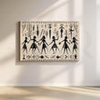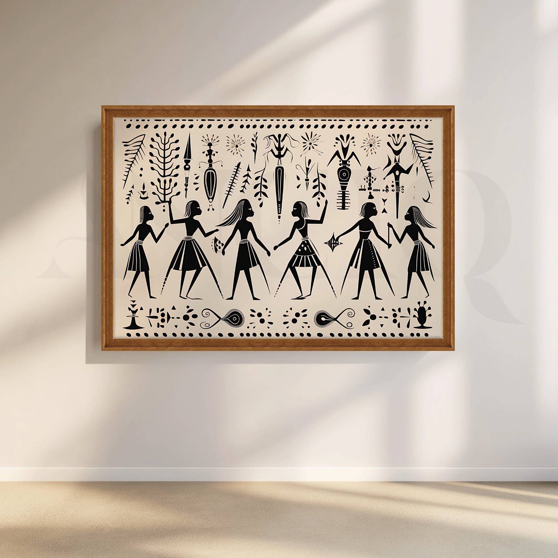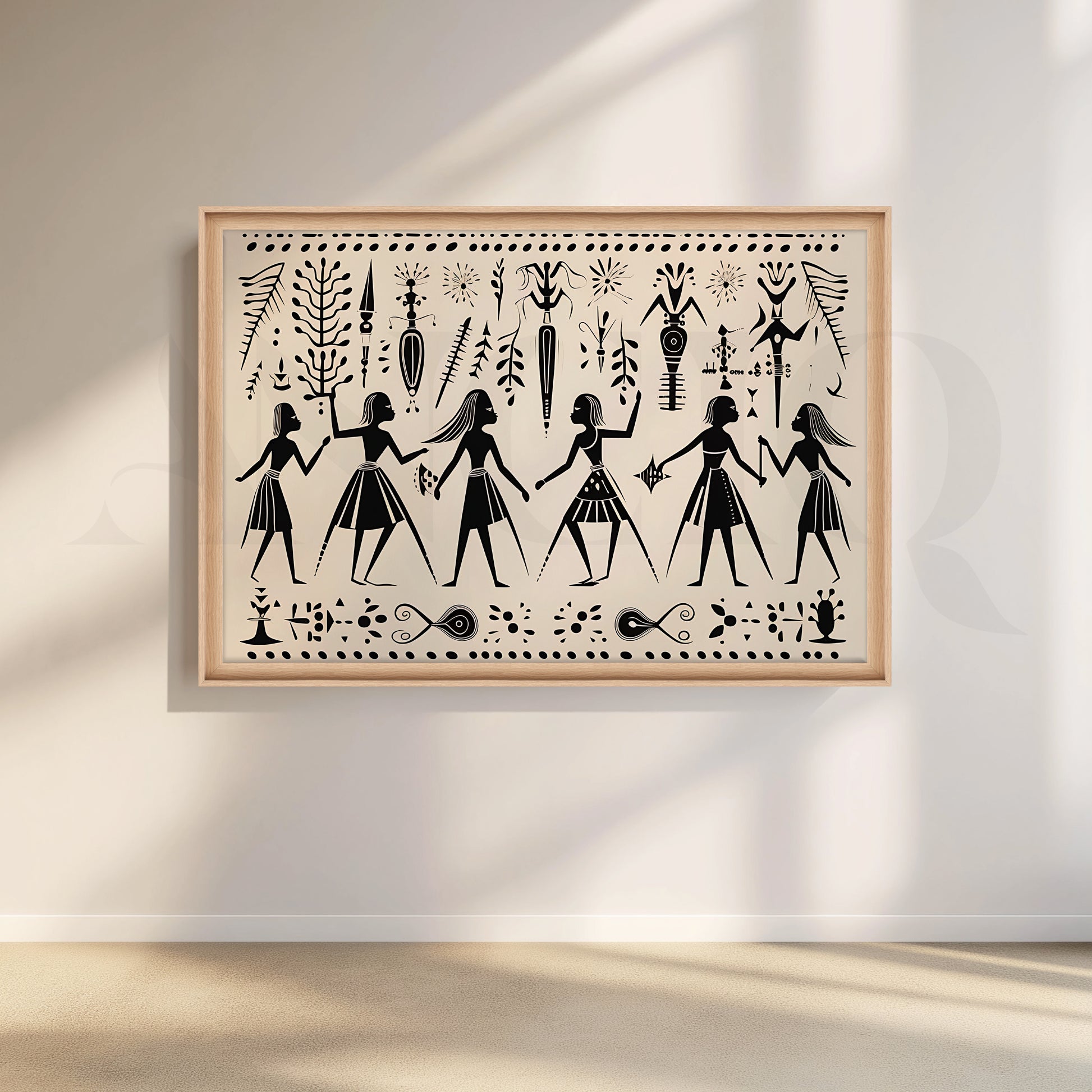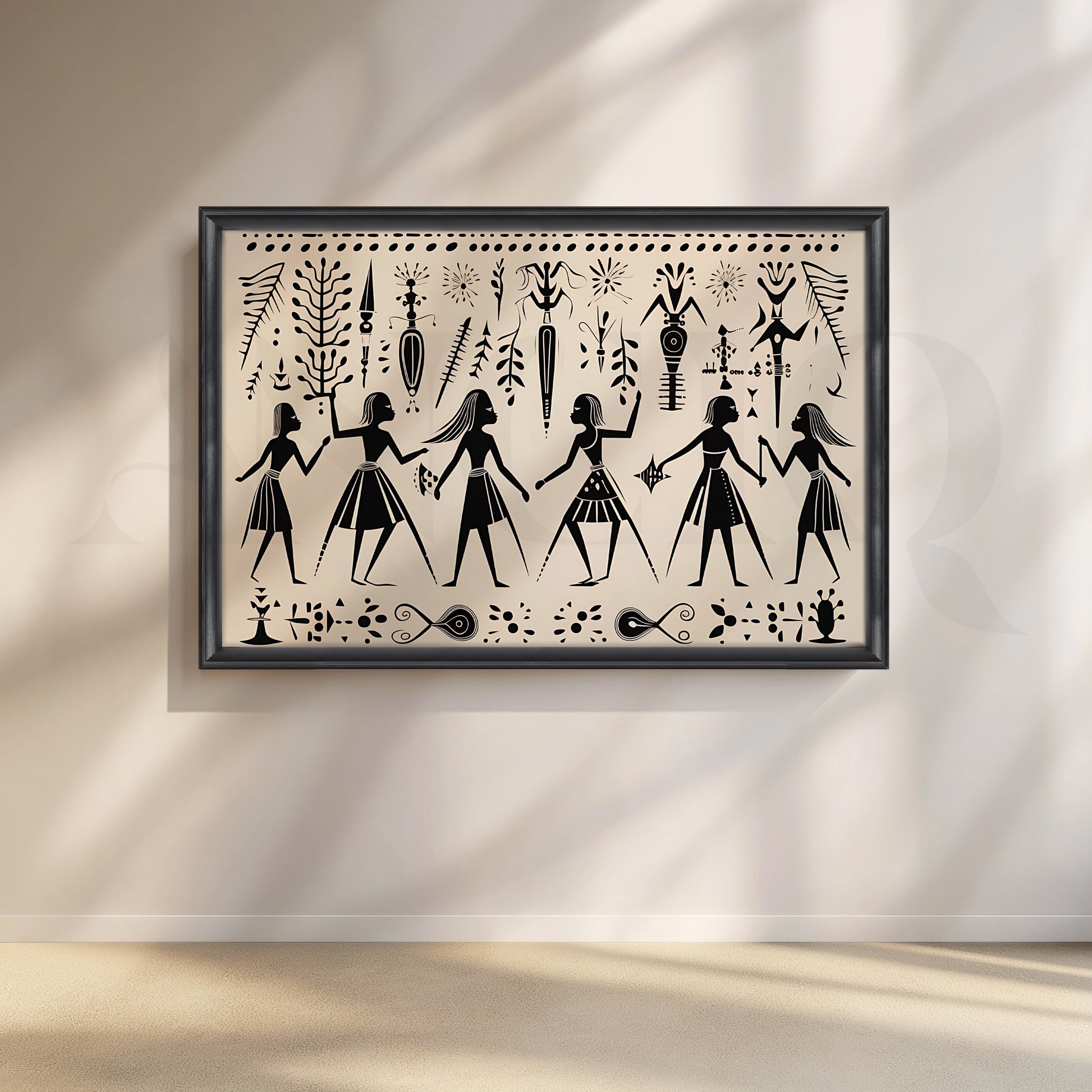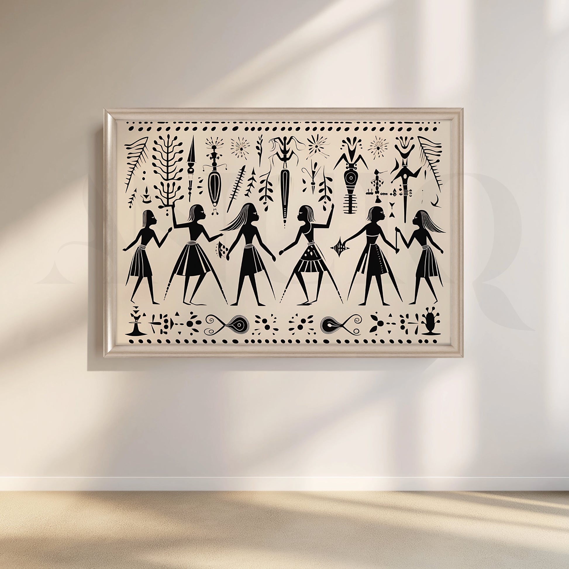 This monochrome Anciq artwork portrays tribal women holding hands in unity, surrounded by nature-inspired motifs. Ideal for bedrooms or serene artistic spaces. Keywords: tribal women art, black and white wall painting, ethnic modern decor, boho minimal canvas, cultural artwork.