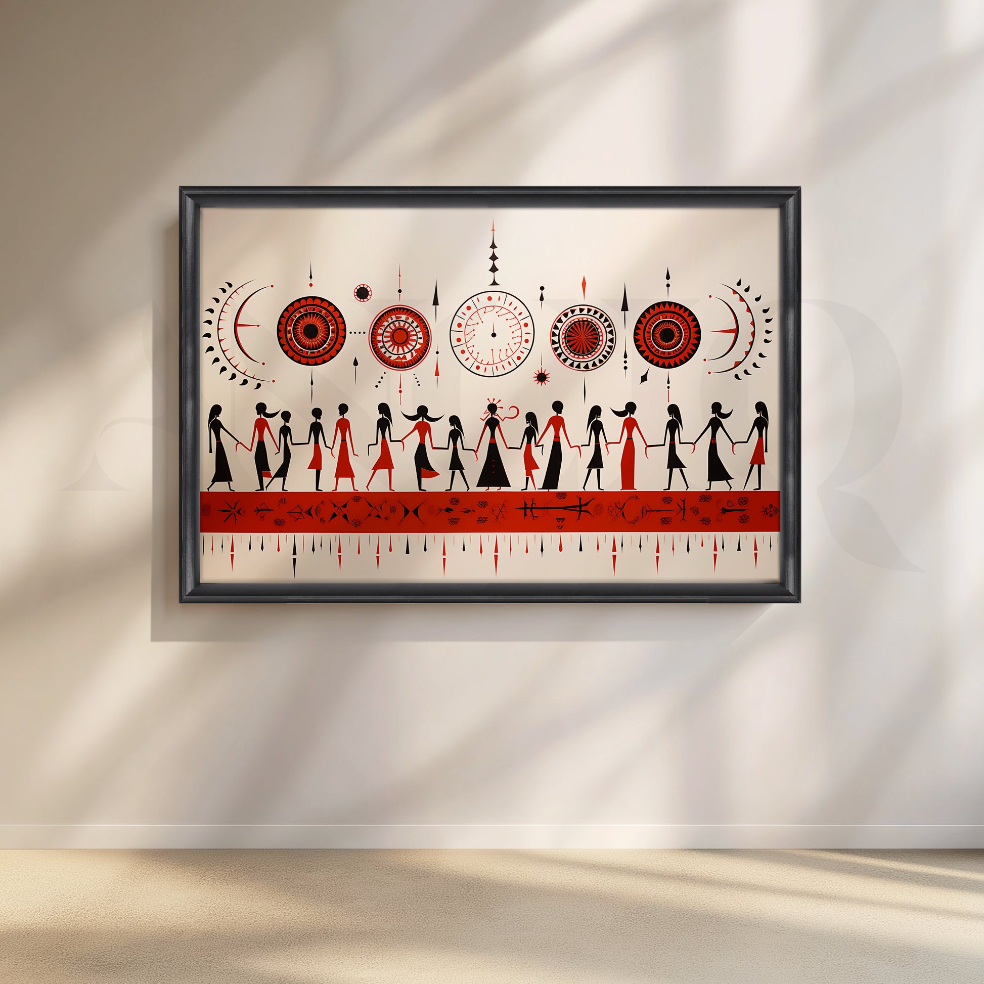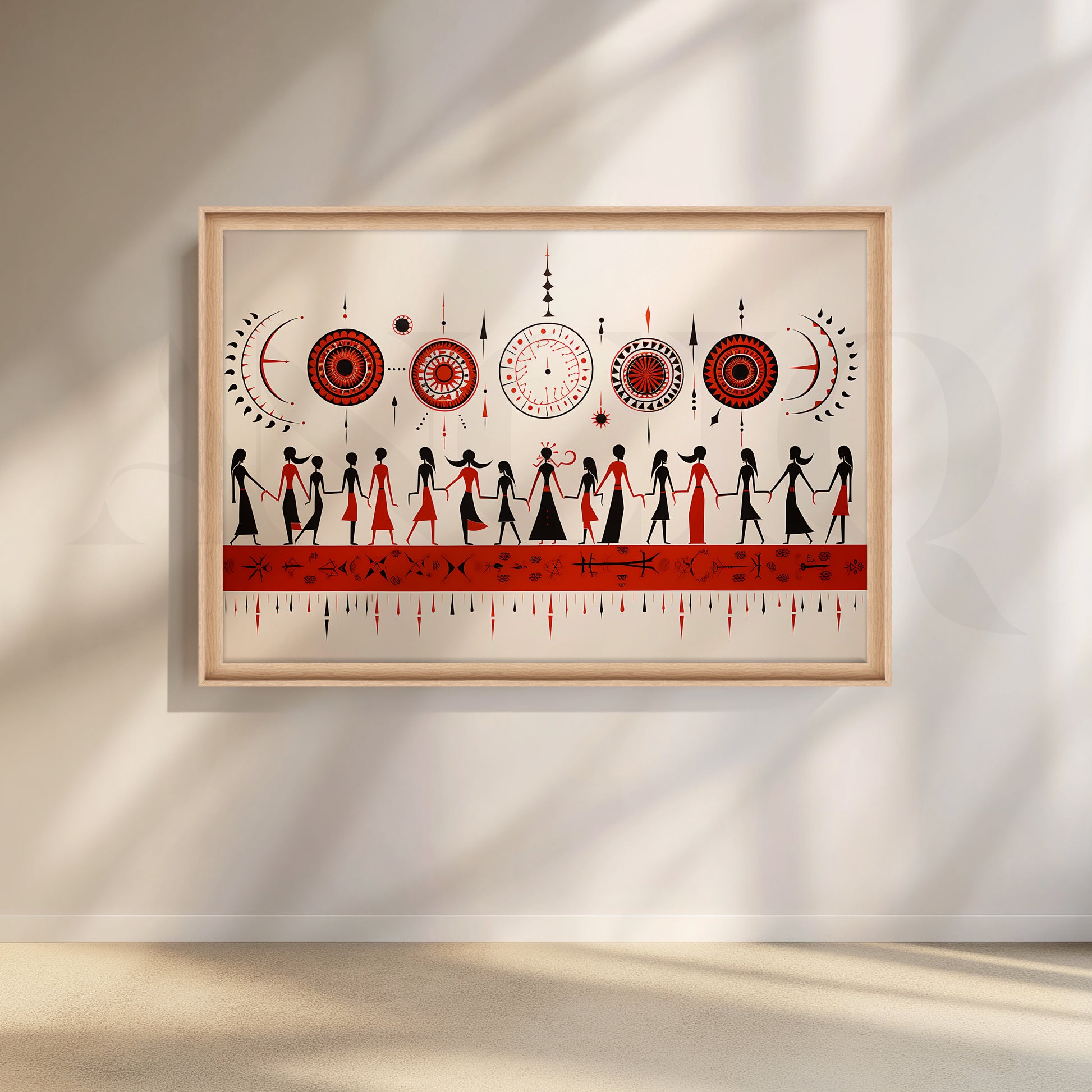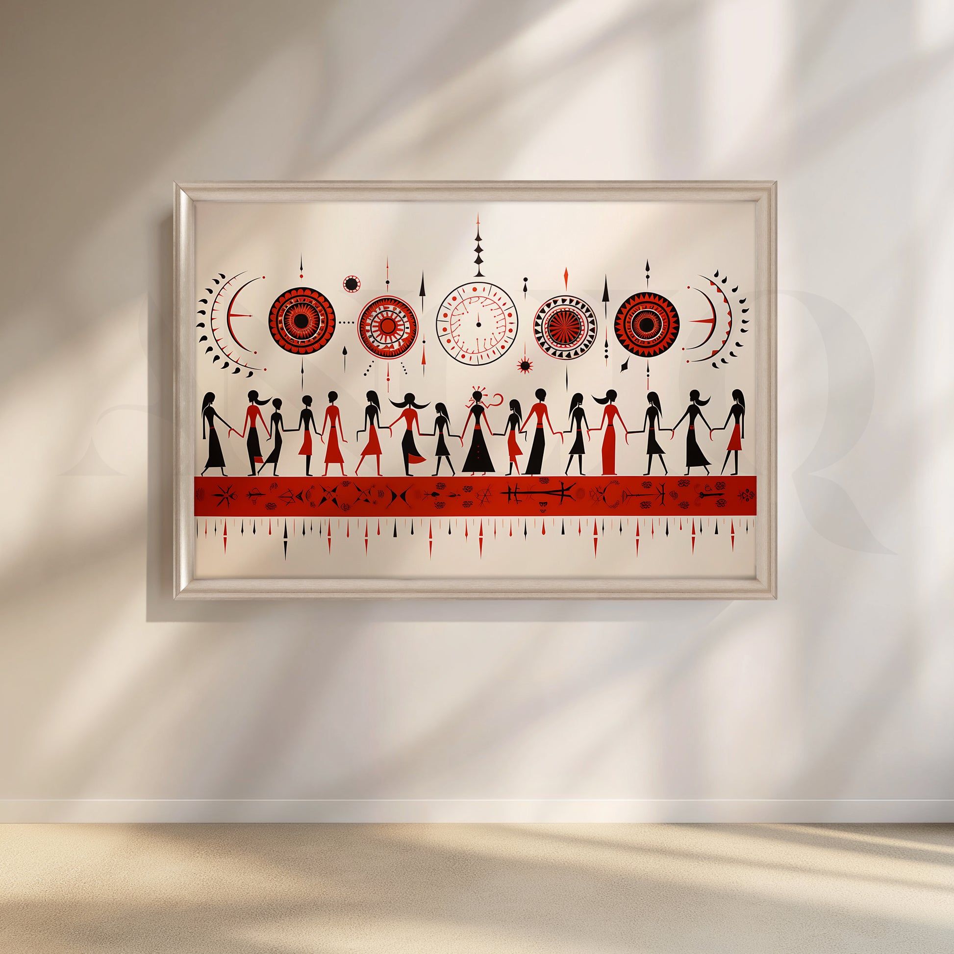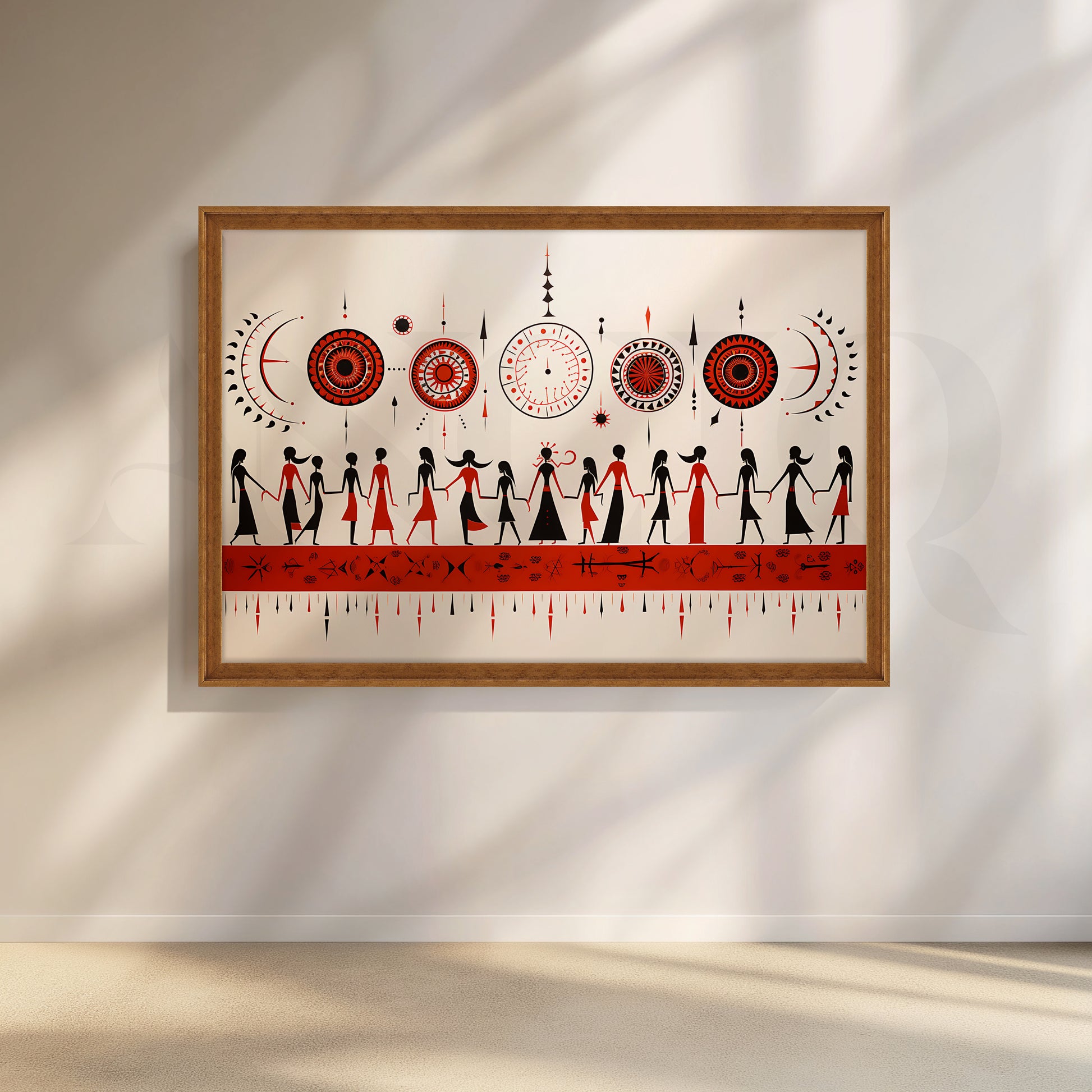 This Anciq artwork portrays hand-in-hand tribal figures dancing under celestial motifs in red, black, and cream tones. Perfect for hallways or cultural décor corners. Keywords: Warli art painting, tribal dance artwork, ethnic red wall art, traditional Indian decor, minimalist folk canvas.