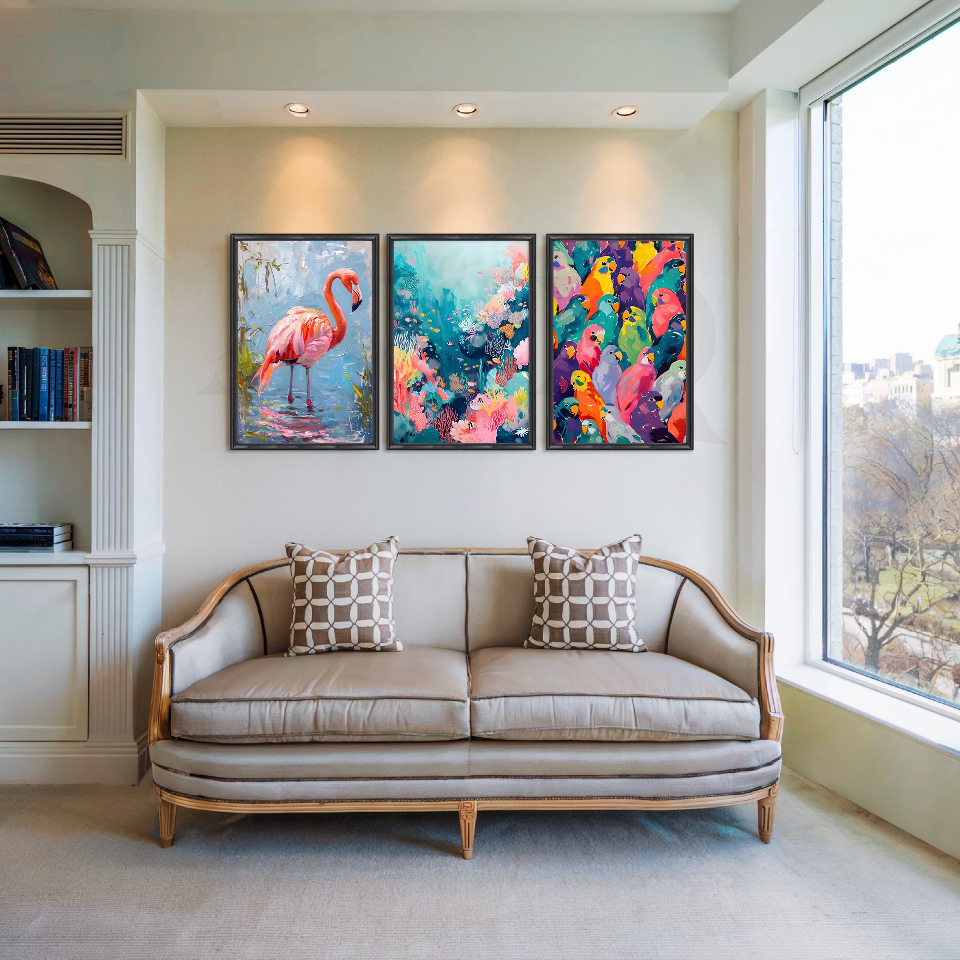 Anciq ‘Tropical Birds & Bloom’ Gallery Wall fills your space with flamingos, reef-like florals, and a flock of colourful parrots. Perfect for living rooms, kids’ rooms, balconies, or holiday homes, this 3-piece set brings playful vacation vibes indoors. Ideal for tropical wall art, colourful gallery wall décor, and nature-inspired interiors.