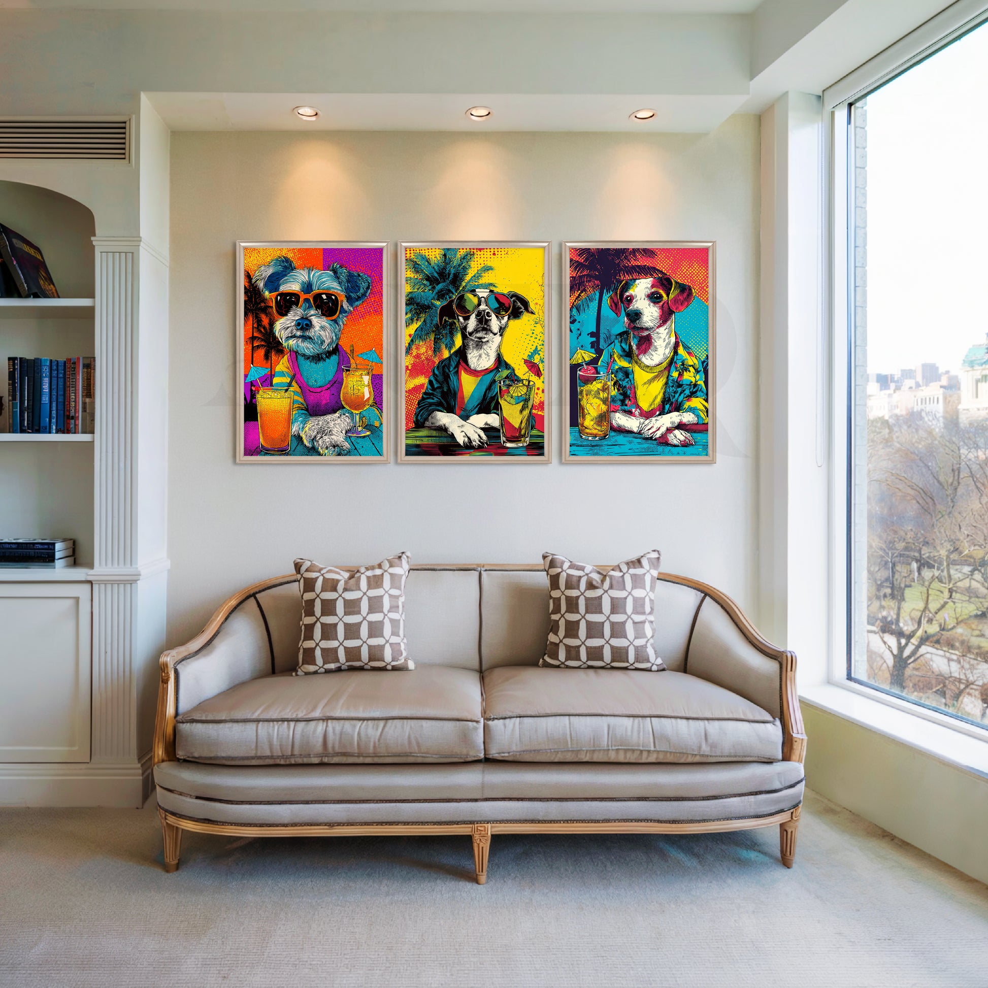 This playful gallery wall shows three cool dogs in sunglasses sipping cocktails against vibrant tropical backdrops. Packed with pop-art colour and bar vibes, it instantly livens up living rooms, home bars, cafés, gaming rooms and party zones. A perfect choice for dog lovers who want quirky, modern wall art that feels fun, bold and unapologetically joyful.