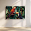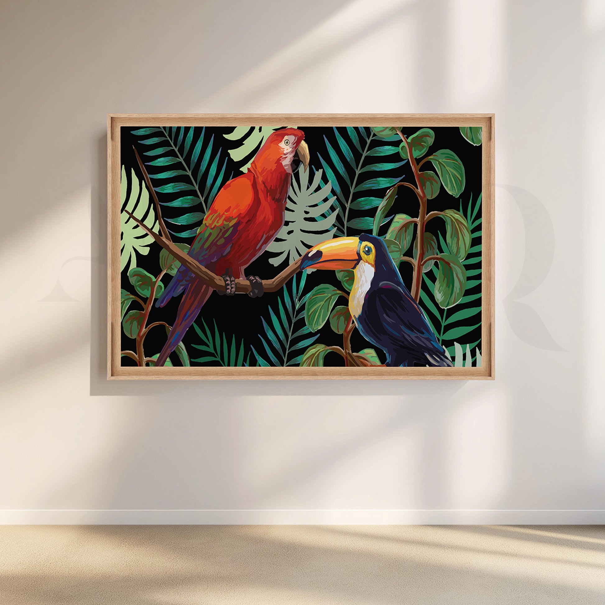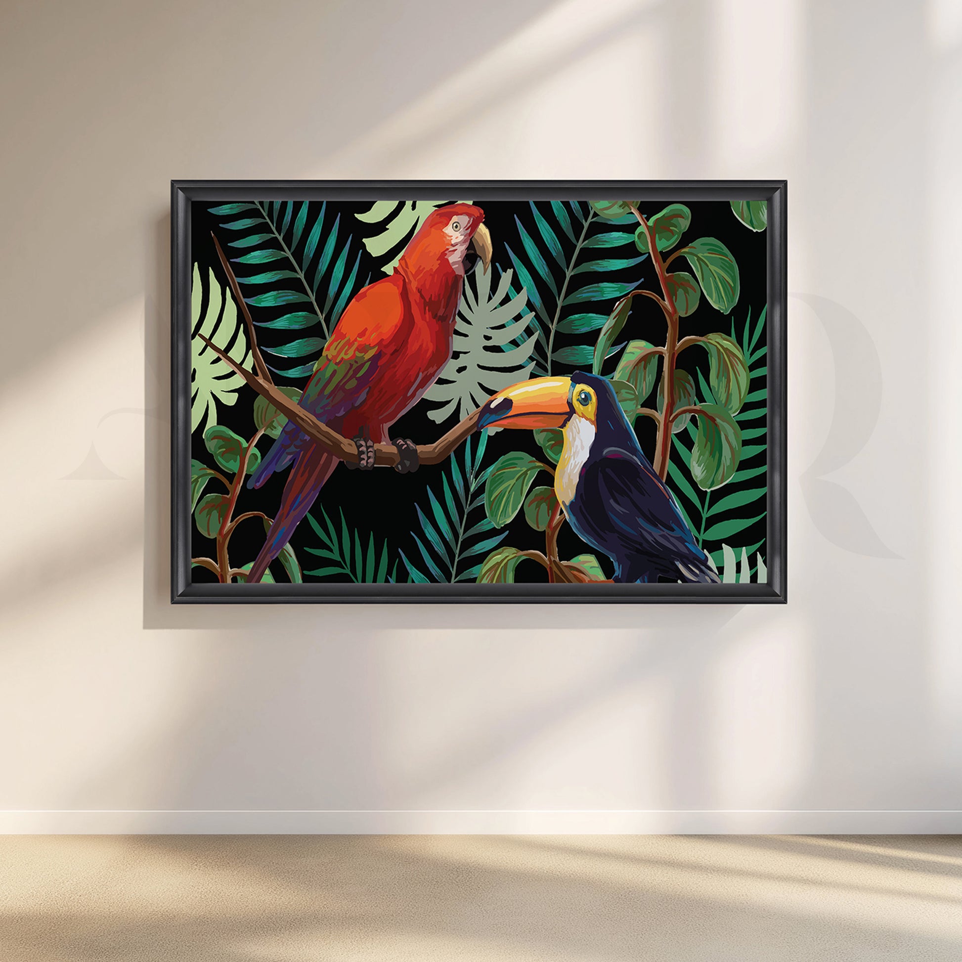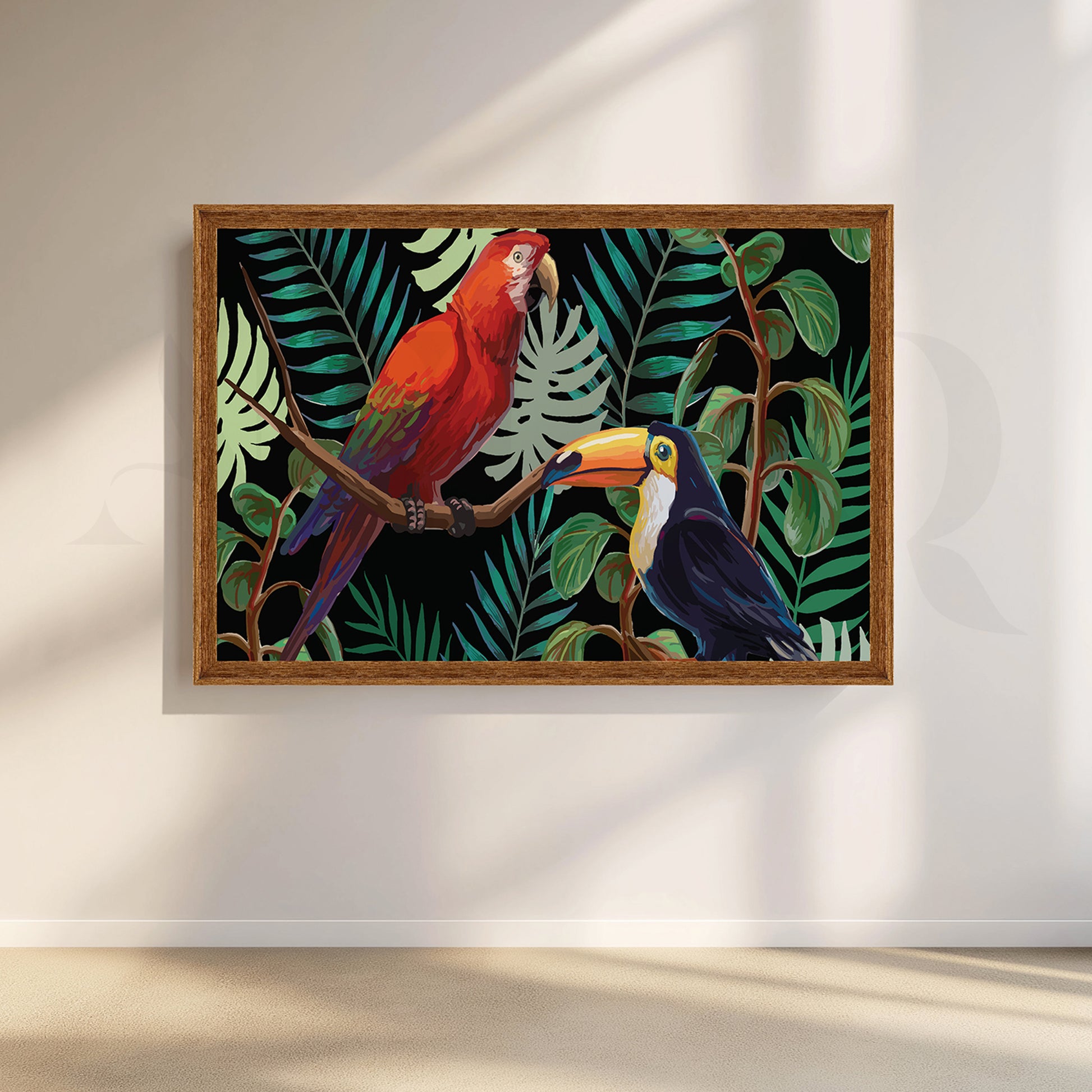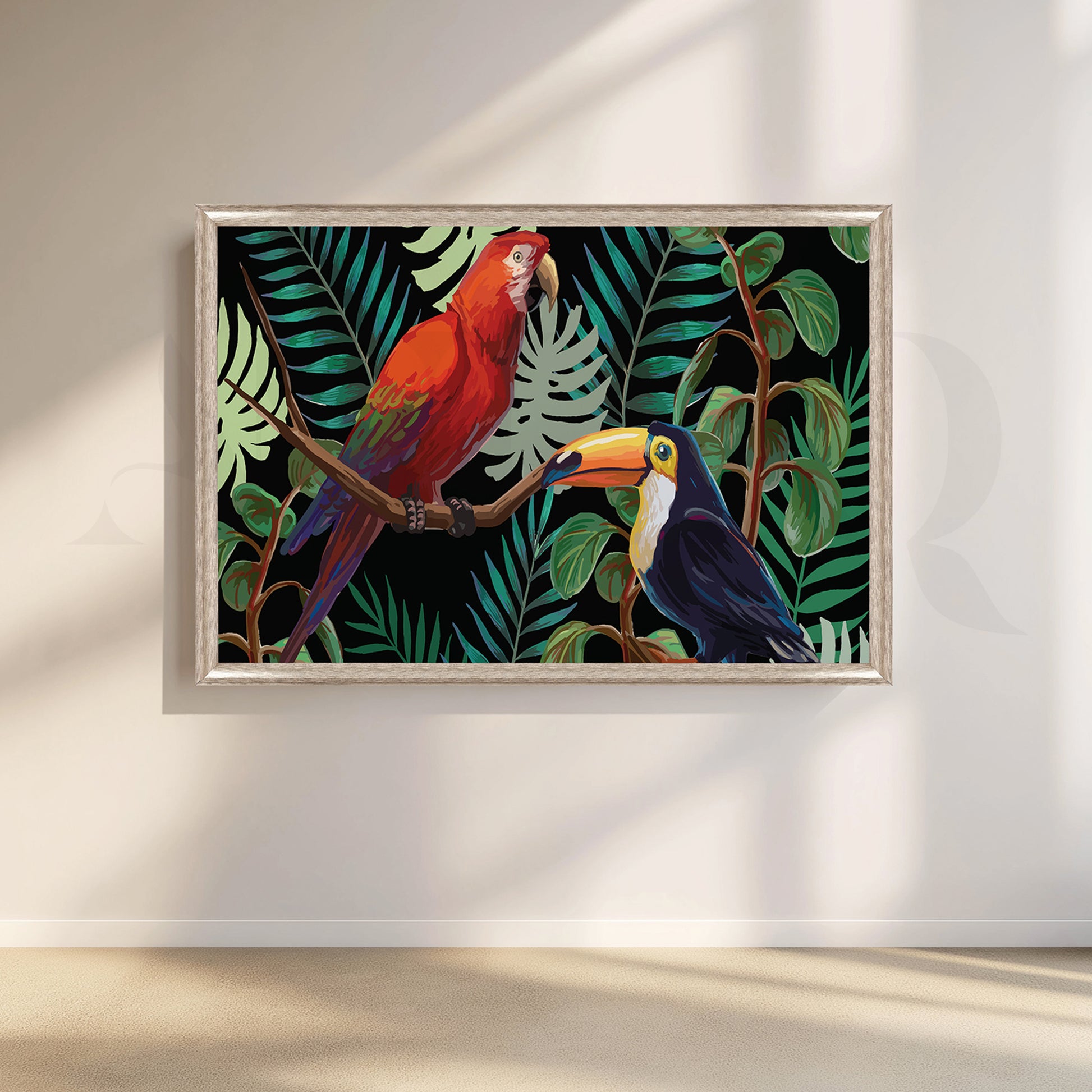 Vibrant feathers burst forth in this captivating oil painting. Two exotic birds, a toucan and a parrot, perch on a lush jungle branch, their colorful beaks nuzzling feathers in a moment of tropical tranquility. This unique piece brings the vibrancy of the rainforest to your home.