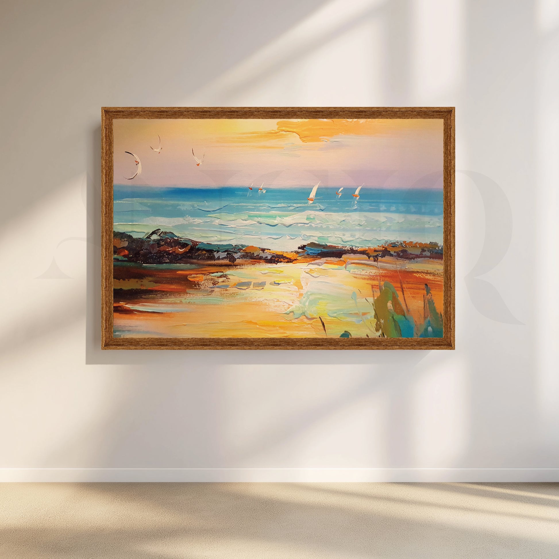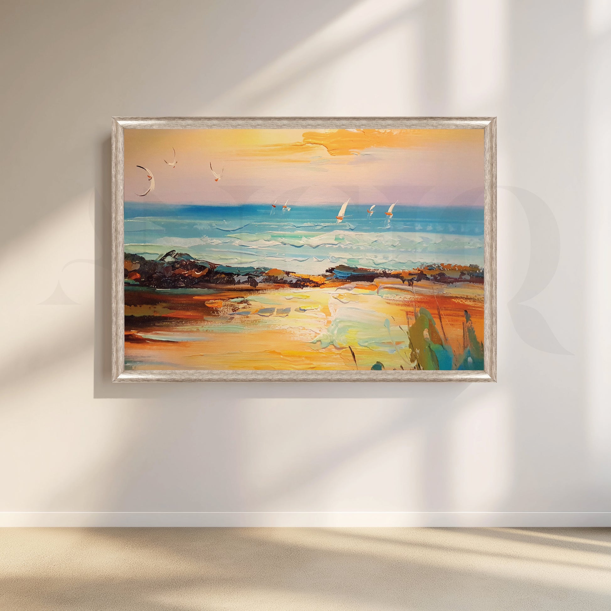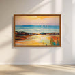 Capture the serenity of a vibrant sunset cruise. This painting washes your walls in fiery hues of orange and pink, with sailboats casting elegant shadows on a rippling sea. The perfect piece to evoke tranquility and a touch of wanderlust.