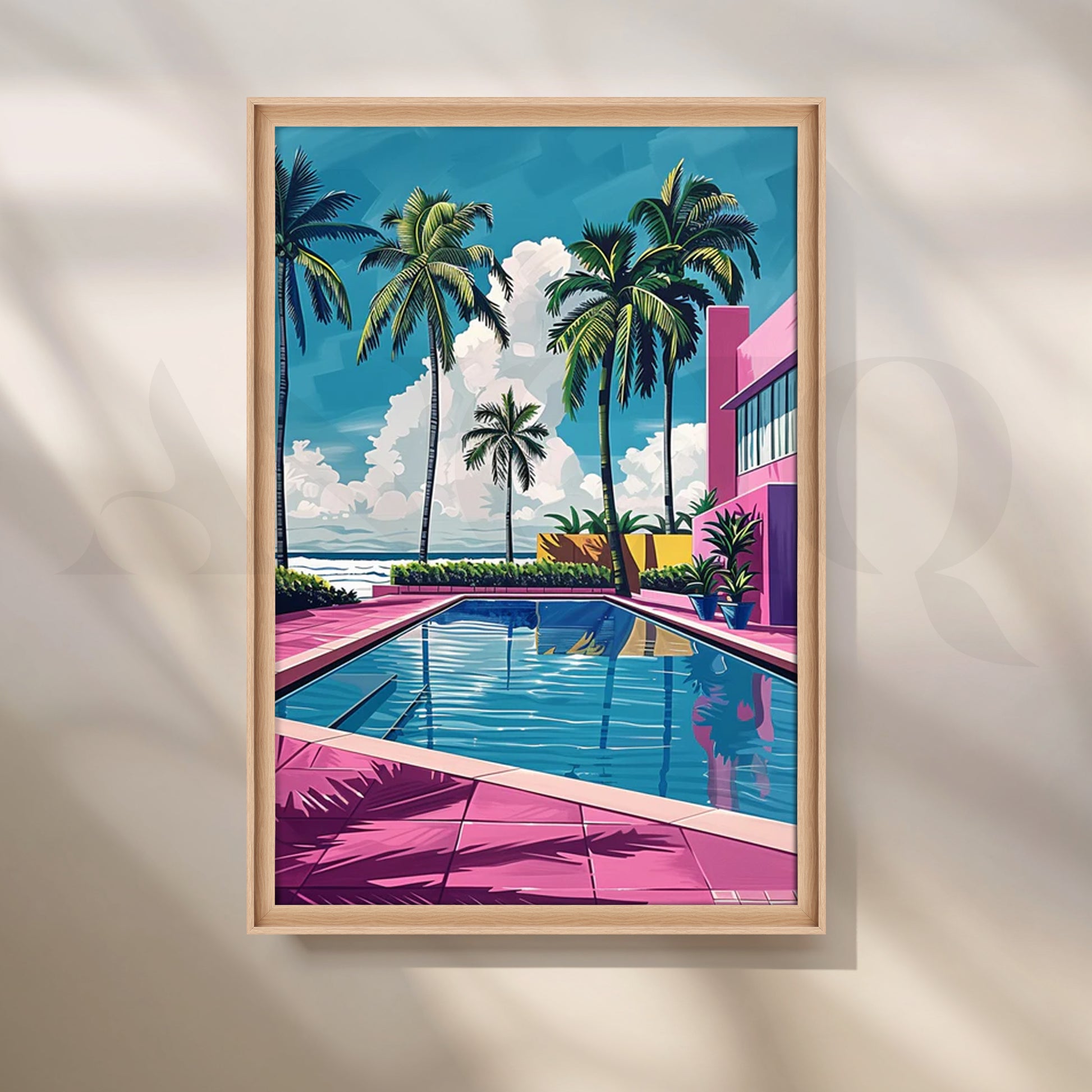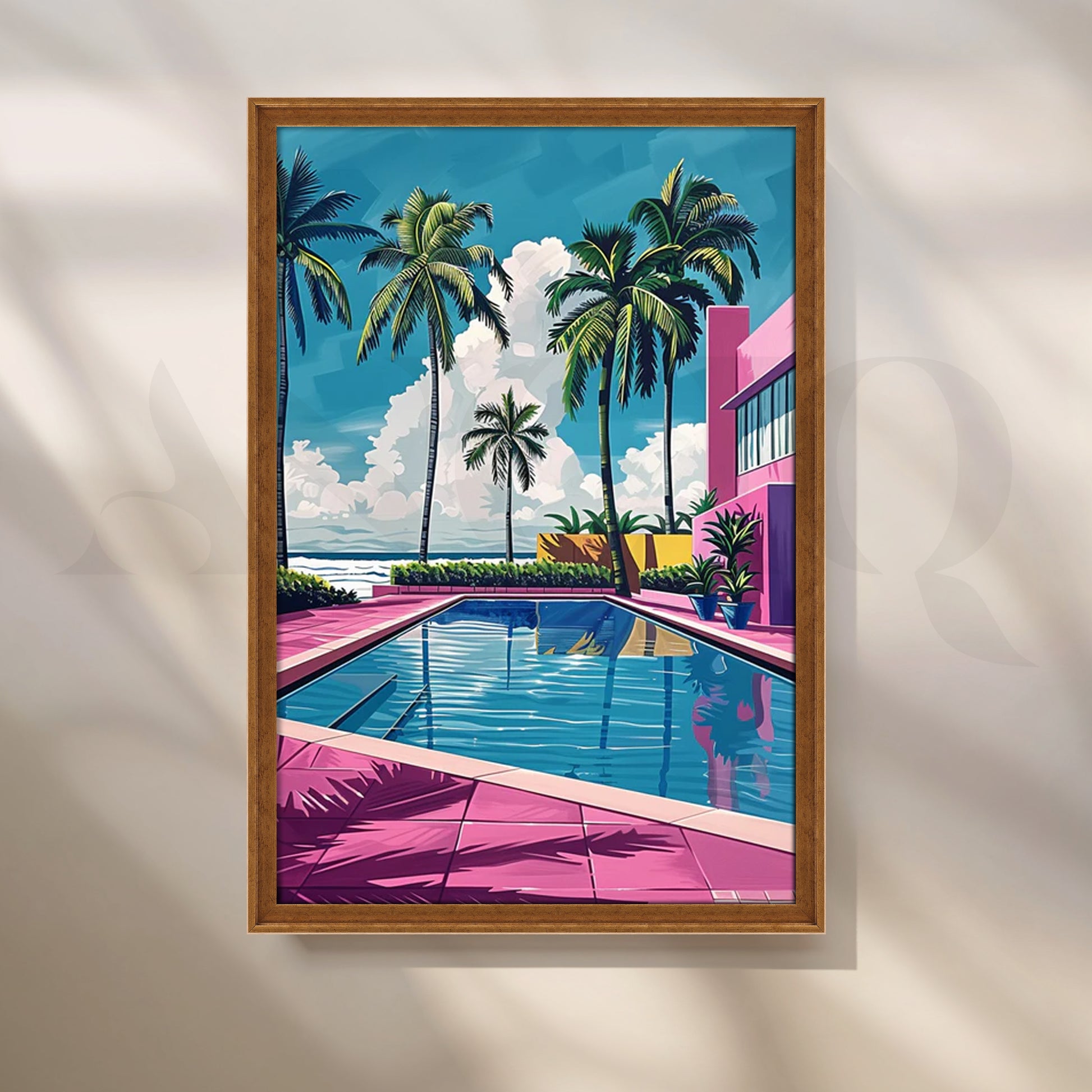 A sun-splashed, feel-good escape in color: turquoise sky, candy-pink tiles, swaying palms, and a glassy pool reflecting ocean clouds. This bold graphic scene channels retro South Beach glamour—perfect for brightening living rooms, home bars, studios, and Airbnbs with instant vacation energy. Crisp lines, saturated aquas and magentas, and palm-shadow details make it a striking statement piece that pairs beautifully with modern, coastal, or mid-century decor. Keywords: Miami pop art print, tropical pool canvas, palm tree wall art, neon coastal decor, South Beach poster, vibrant summer artwork, pink teal wall decor, retro resort illustration, beach house art, colorful modern home decor.