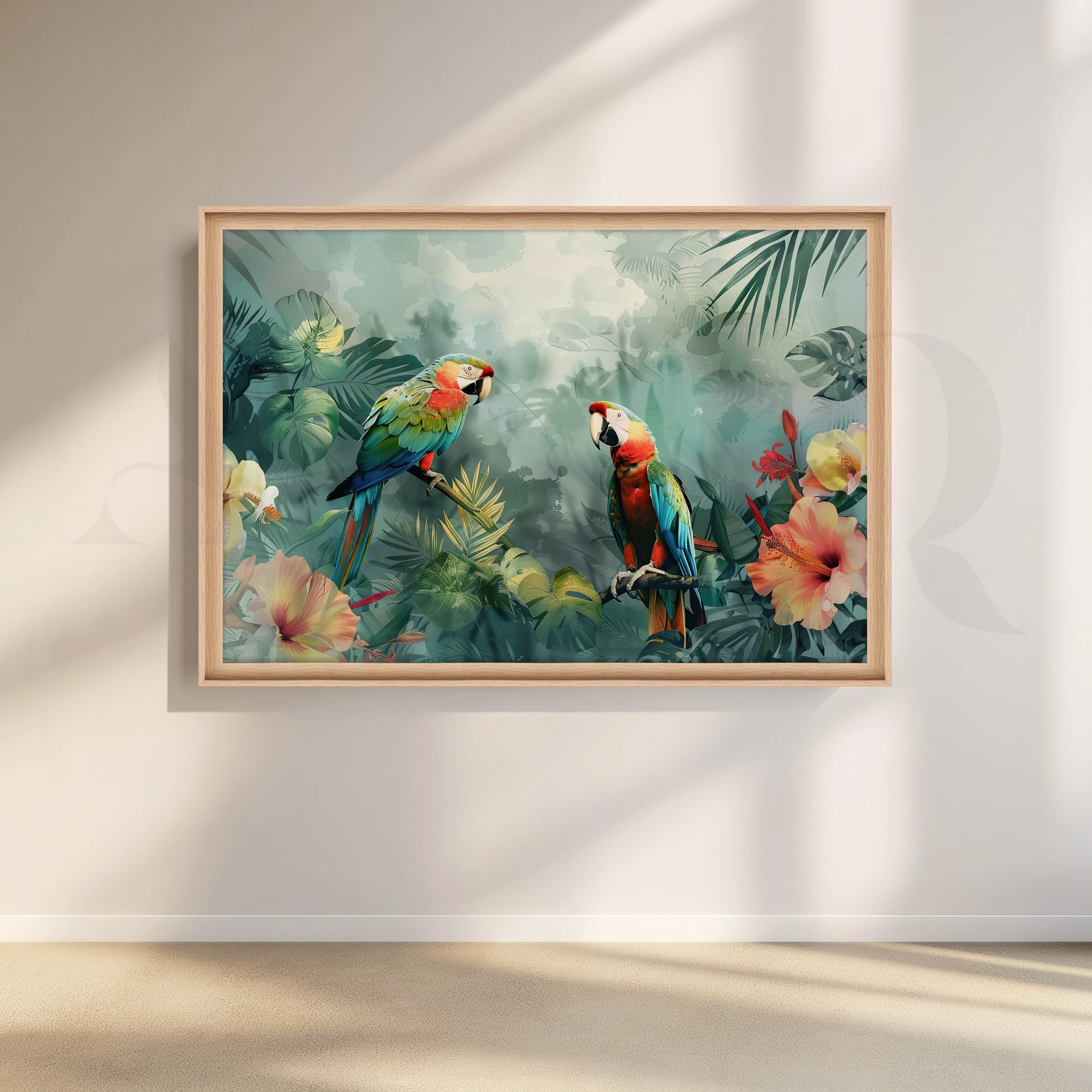 This vibrant canvas captures two vividly colored parrots perched amidst tropical foliage and blooming hibiscus flowers. With its lively brushwork and playful jungle palette, the artwork enlivens spaces with nature-inspired charm.