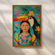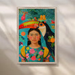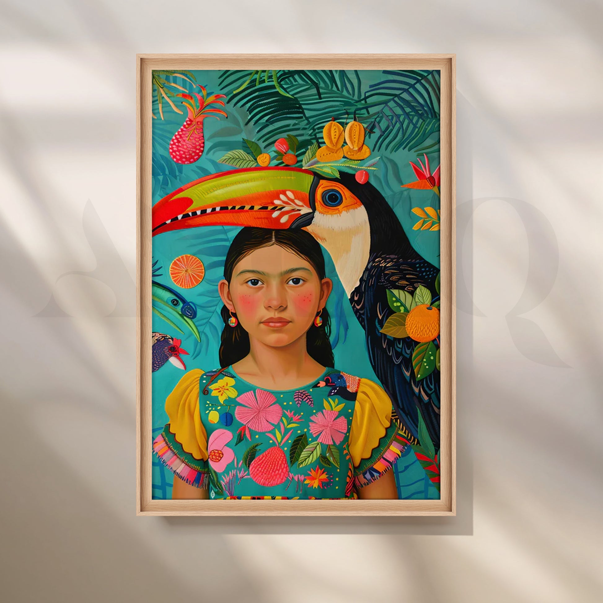The Tropical Portrait Wall Poster vividly captures a vibrant scene featuring a young girl adorned with tropical motifs and a striking toucan by her side. This wall poster's lush colors and intricate details celebrate nature and cultural beauty, making it a perfect centerpiece for eclectic or nature-inspired interiors.