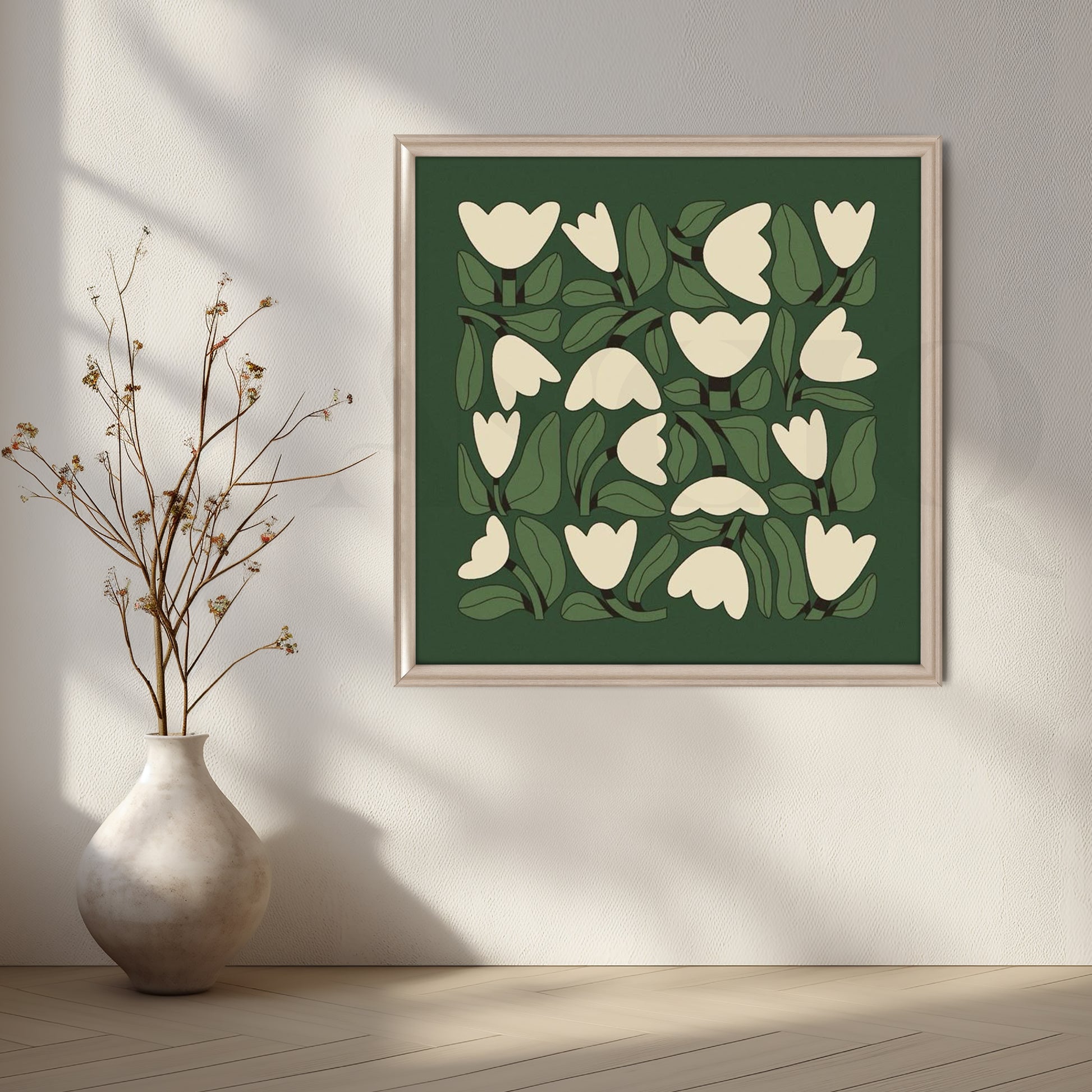 Add serenity to your cozy corner or reading nook with this lush green floral grid featuring soft ivory tulip blooms. Designed for art lovers who admire symmetry, modern minimalism, and organic motifs, this piece offers timeless charm in any interior.