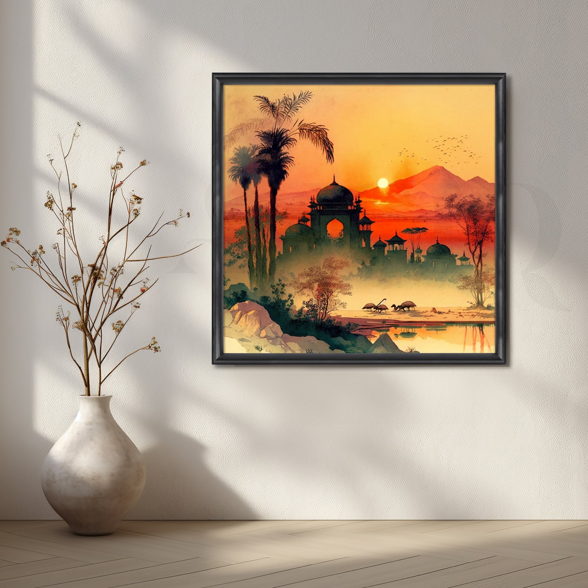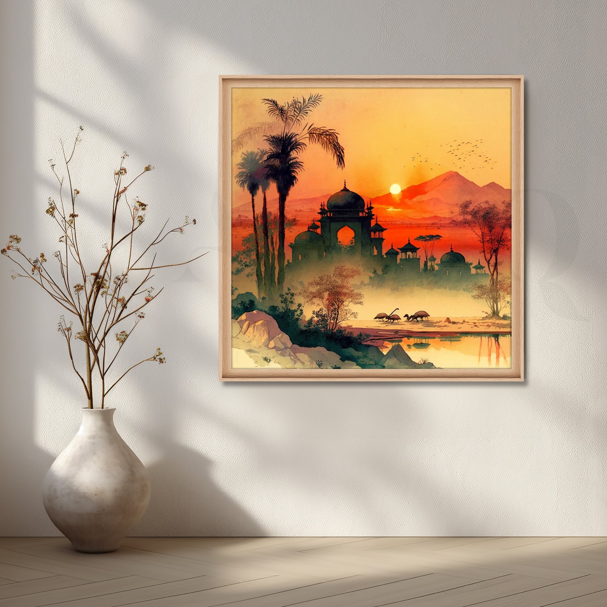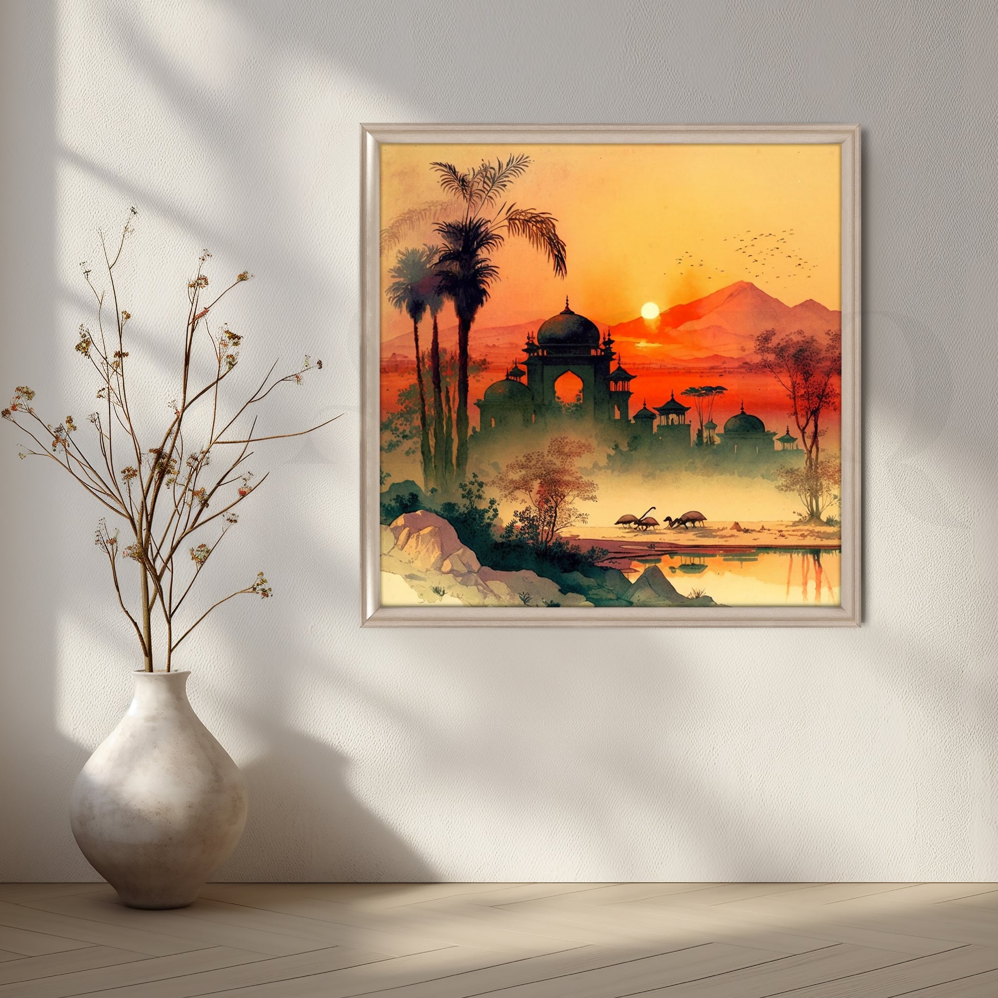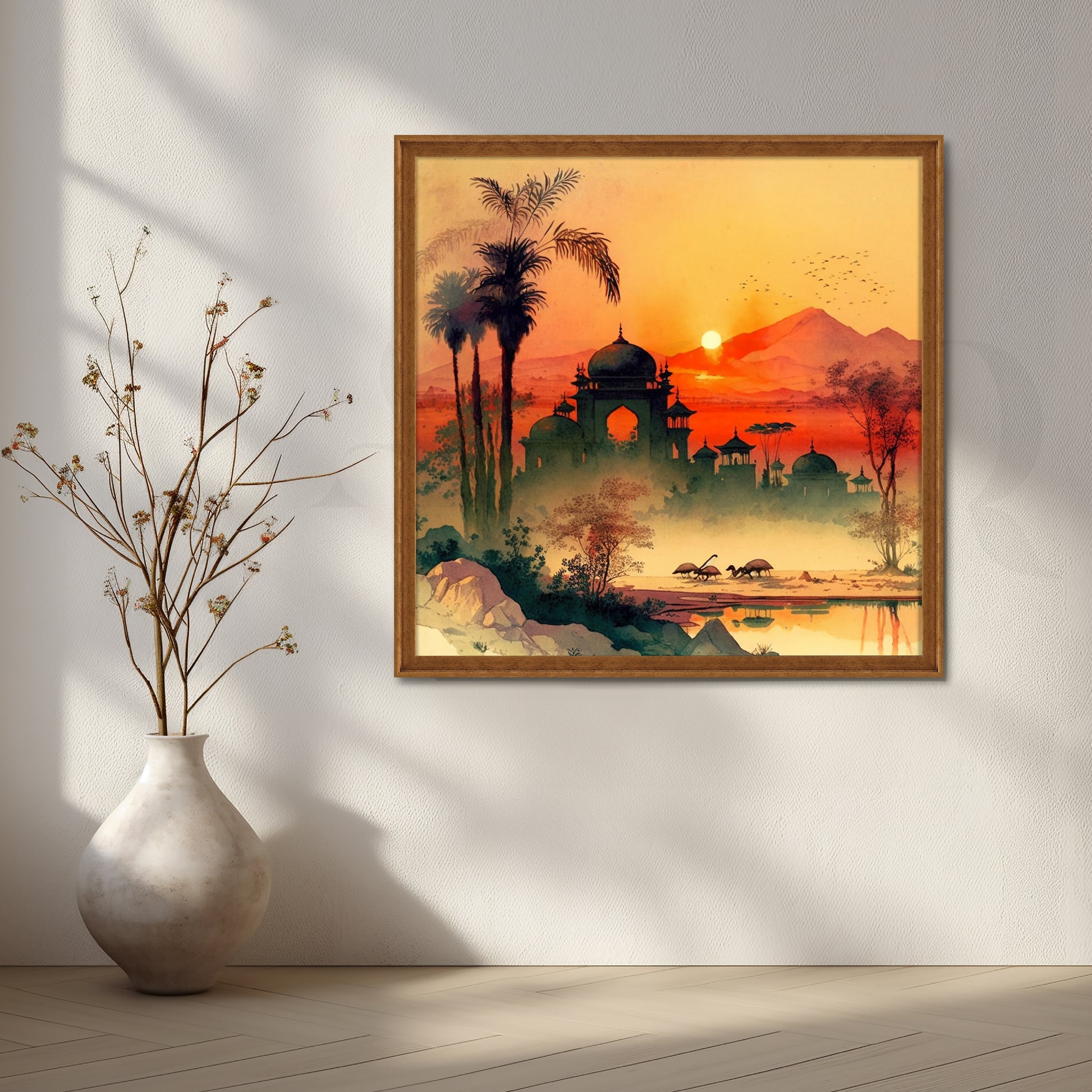 Anciq ‘Twilight of Royals’ Canvas Artwork for Bedroom depicts a dreamy sunset with domed palaces, palm trees, and grazing deer. The warm tones of orange and crimson evoke nostalgia and royalty. Perfect for bedrooms or reading corners, it suits modern classic interiors. A great pick for buyers looking for “sunset palace painting,” “royal India art,” or “canvas wall art with orange tones.”