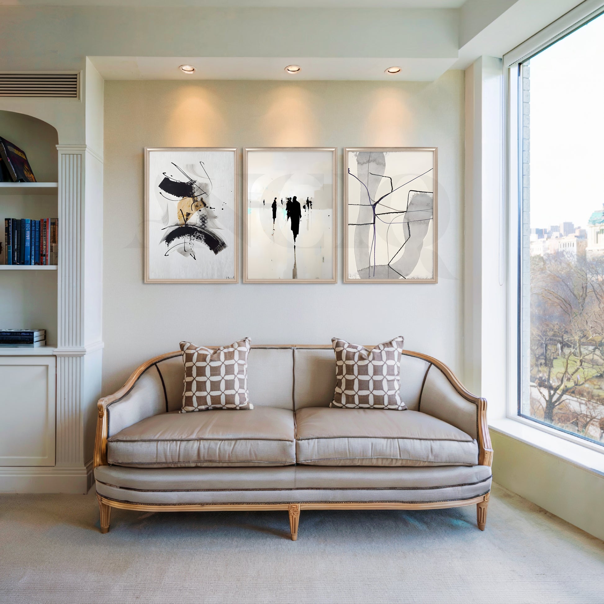 Anciq ‘Urban Mist Abstractions’ Gallery Wall pairs fluid brushstrokes, soft silhouettes, and linear forms in a calm neutral palette. Perfect for living rooms, offices, hallways, and reception areas, this 3-piece minimalist set adds quiet sophistication to modern interiors. Ideal for abstract wall art lovers seeking subtle, contemporary gallery wall décor.