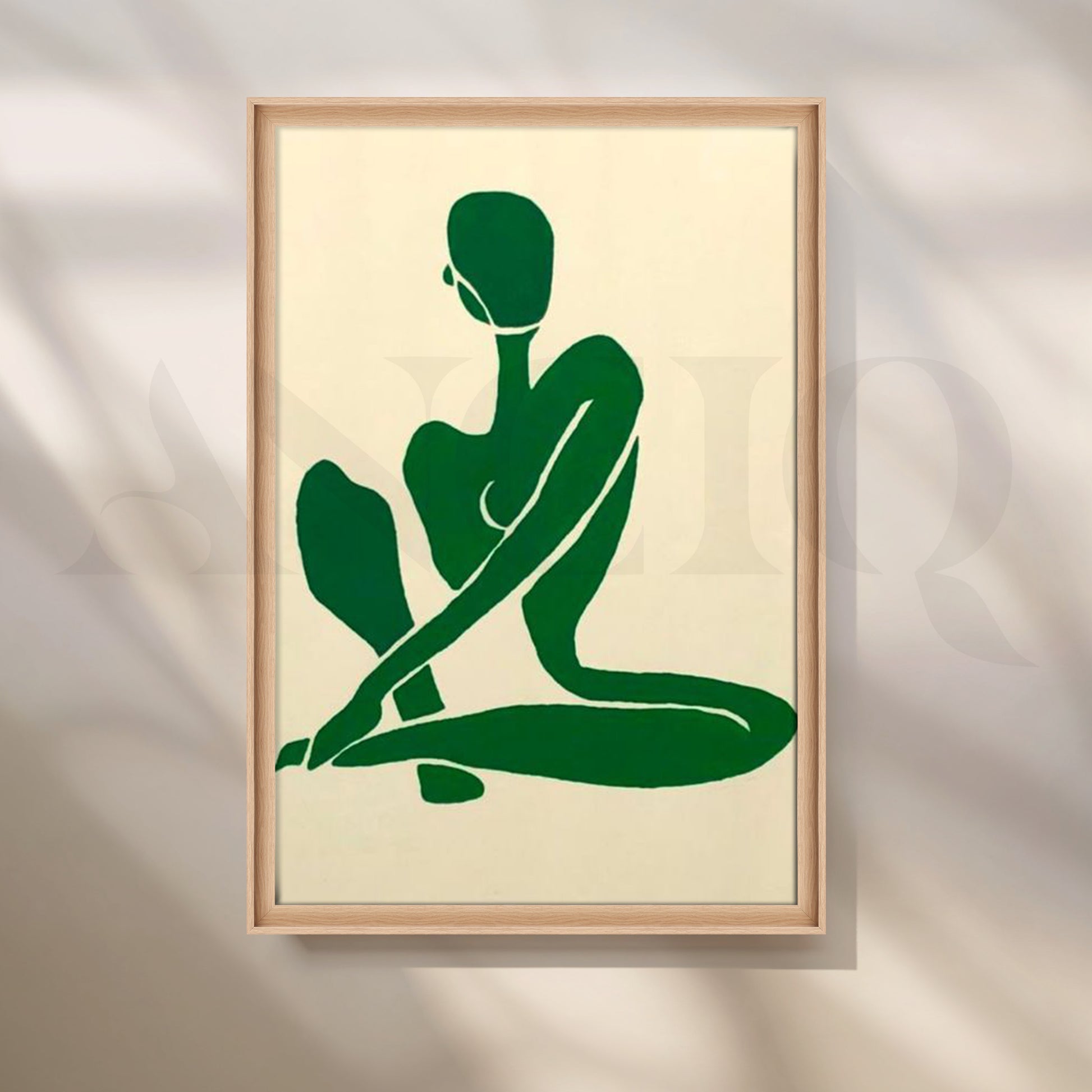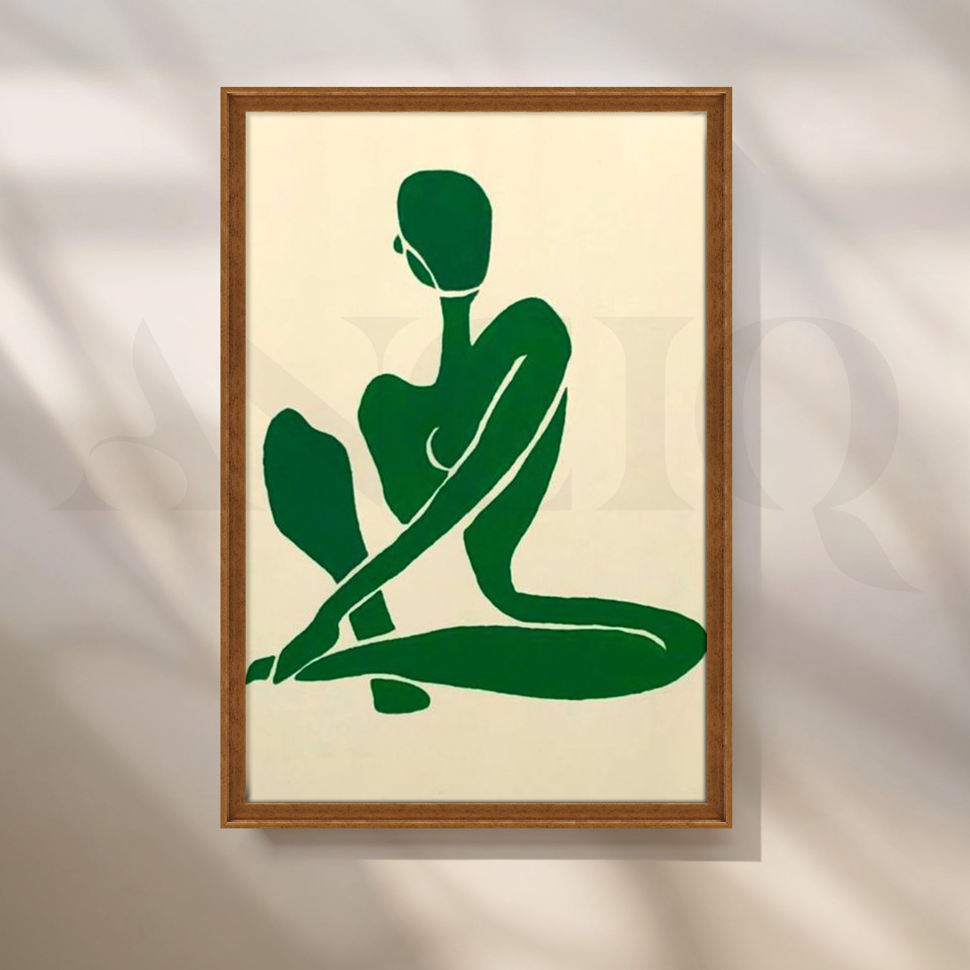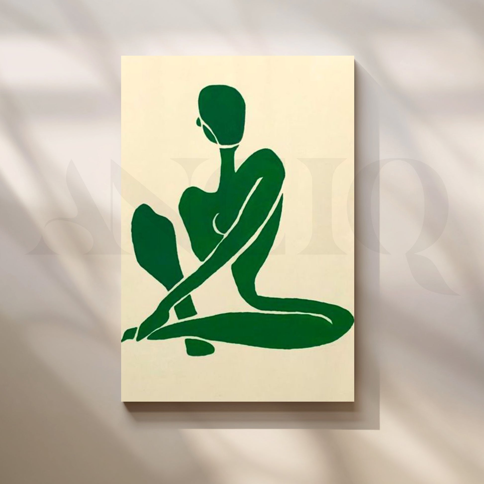 This minimalist green silhouette painting adds an elegant statement to modern bedrooms or creative studio spaces. The abstract figure in deep emerald on a soft beige backdrop brings poise and calm, perfect for art lovers seeking bold yet serene wall decor.