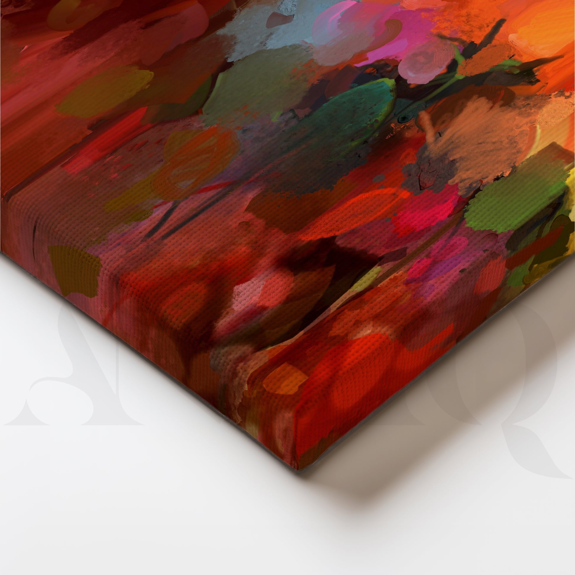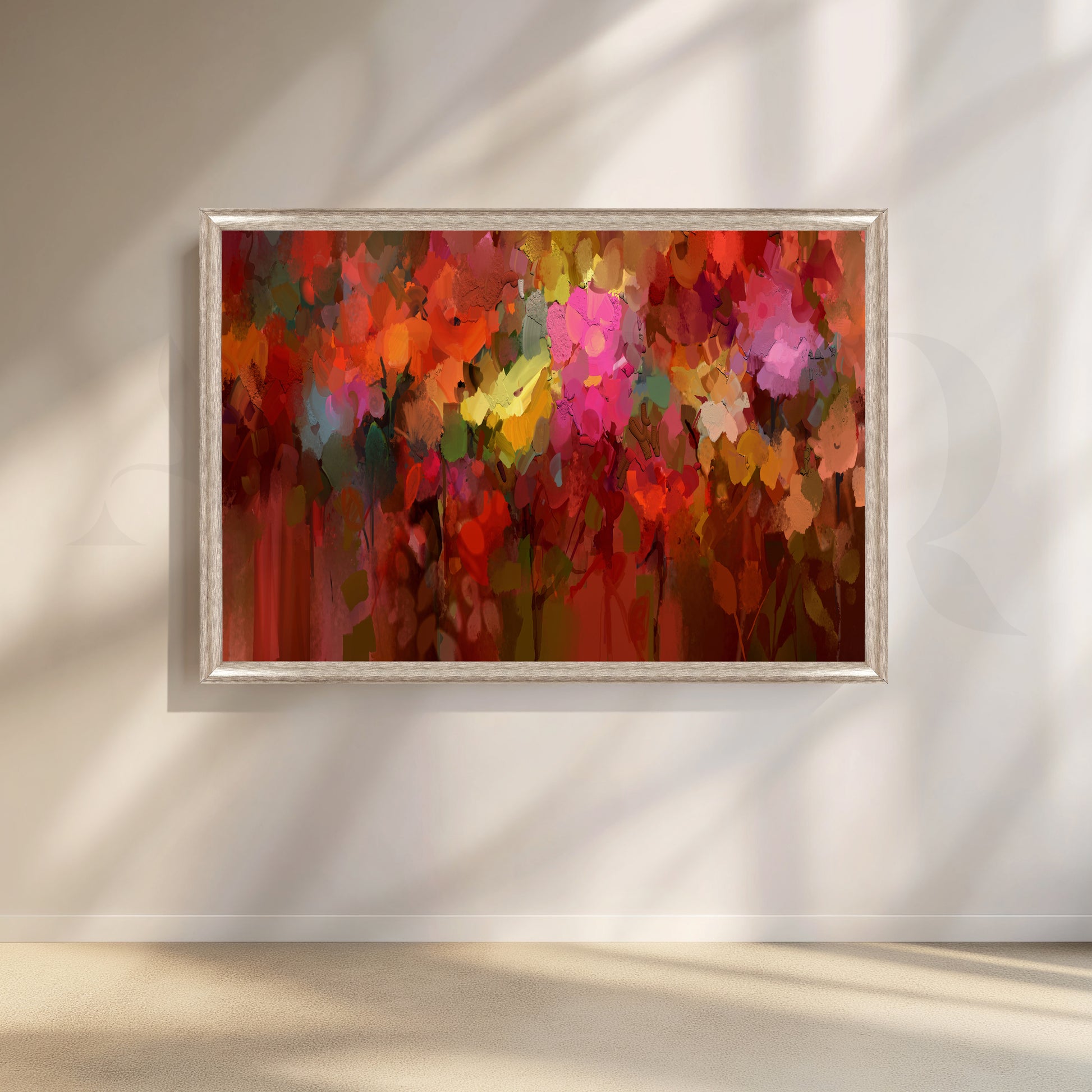 Turn your home into an Eden with this vibrant contemporary abstract blooming floral painting. Rich in strong hues, this piece has a pleasing blend of pink, red, orange and yellow thereby making it captivating to look at. The painting perfectly fits into any modern house even as it adds some artistic charm and warmth to your interior design. It enhances the atmosphere in such places like living rooms, bedrooms or workstations by introducing liveliness and color.