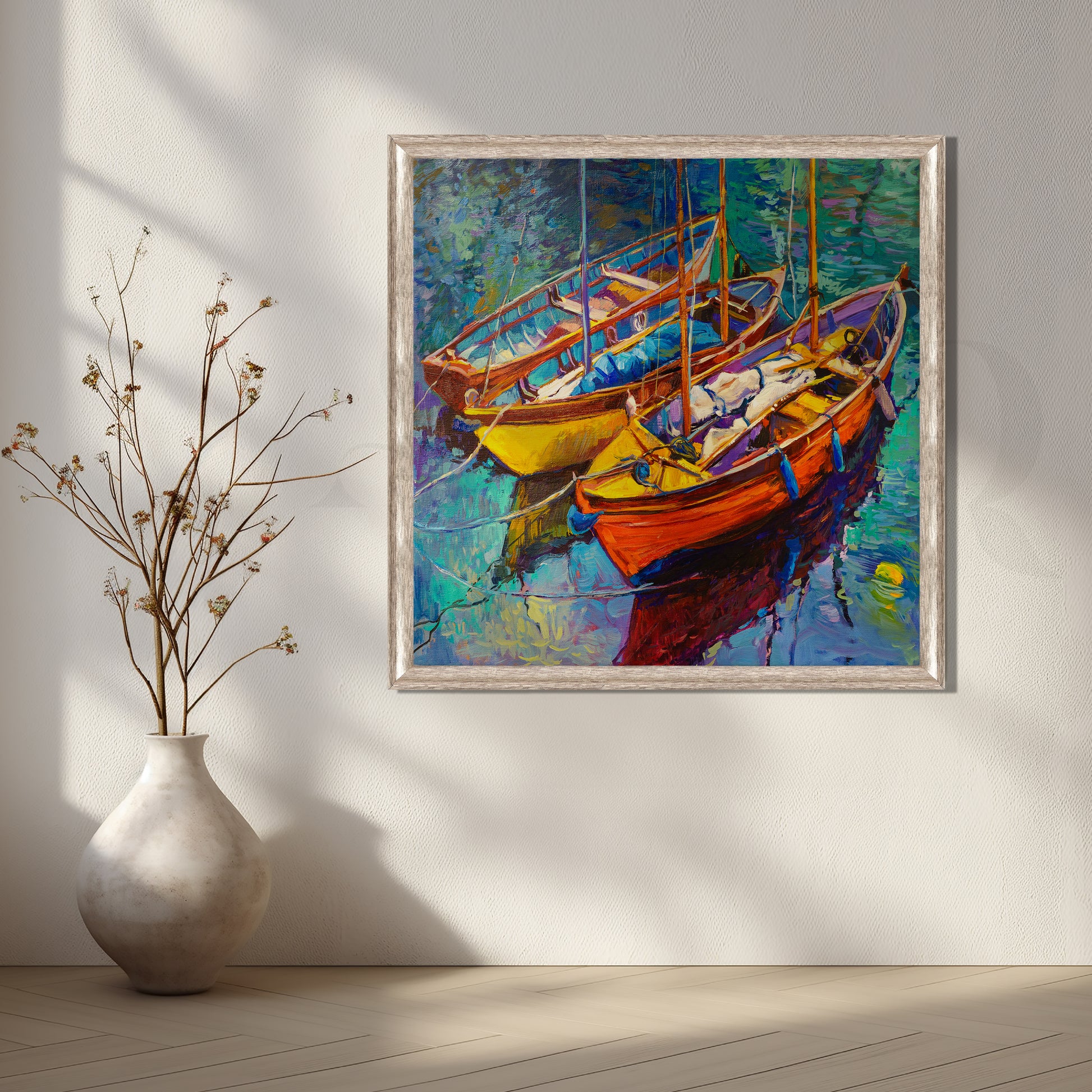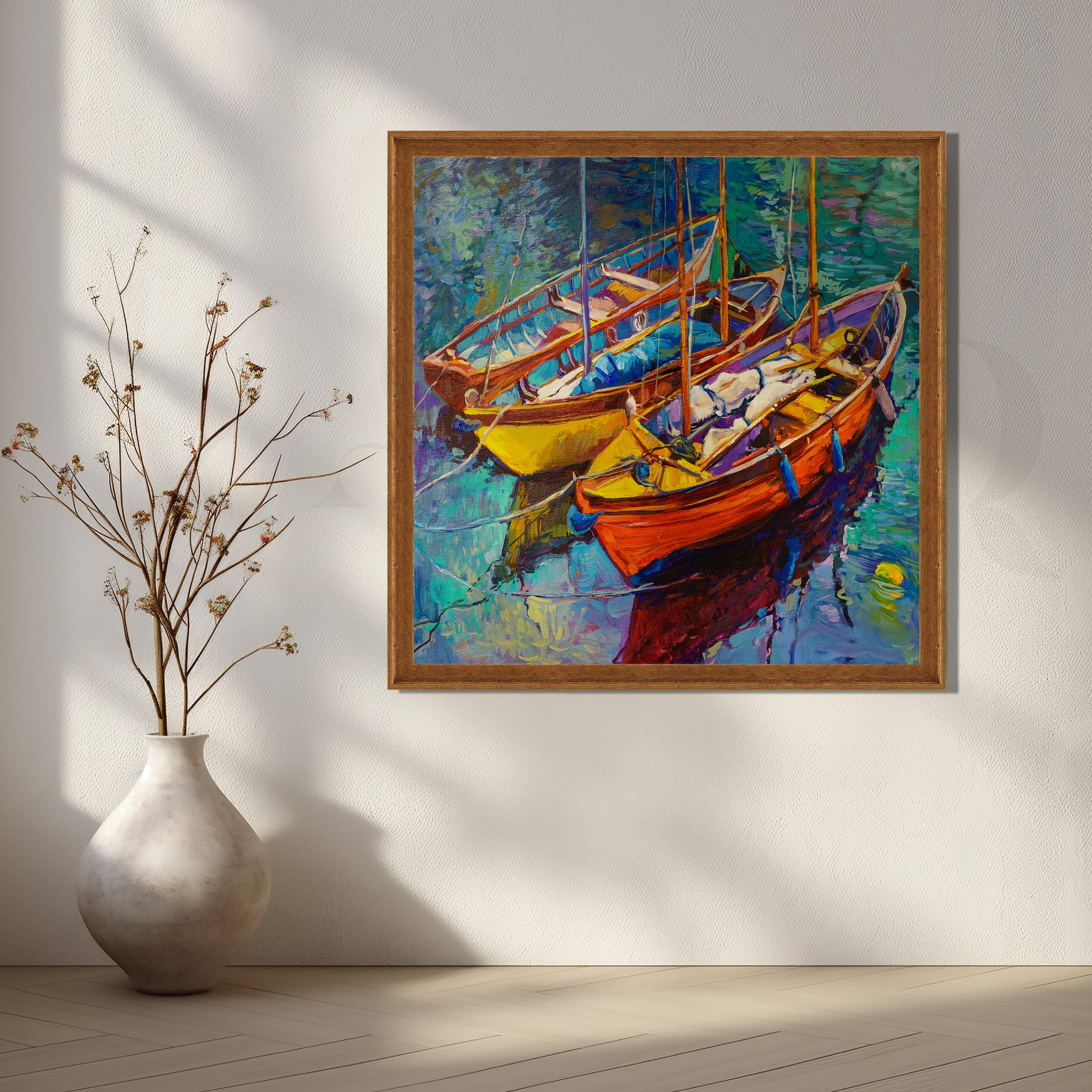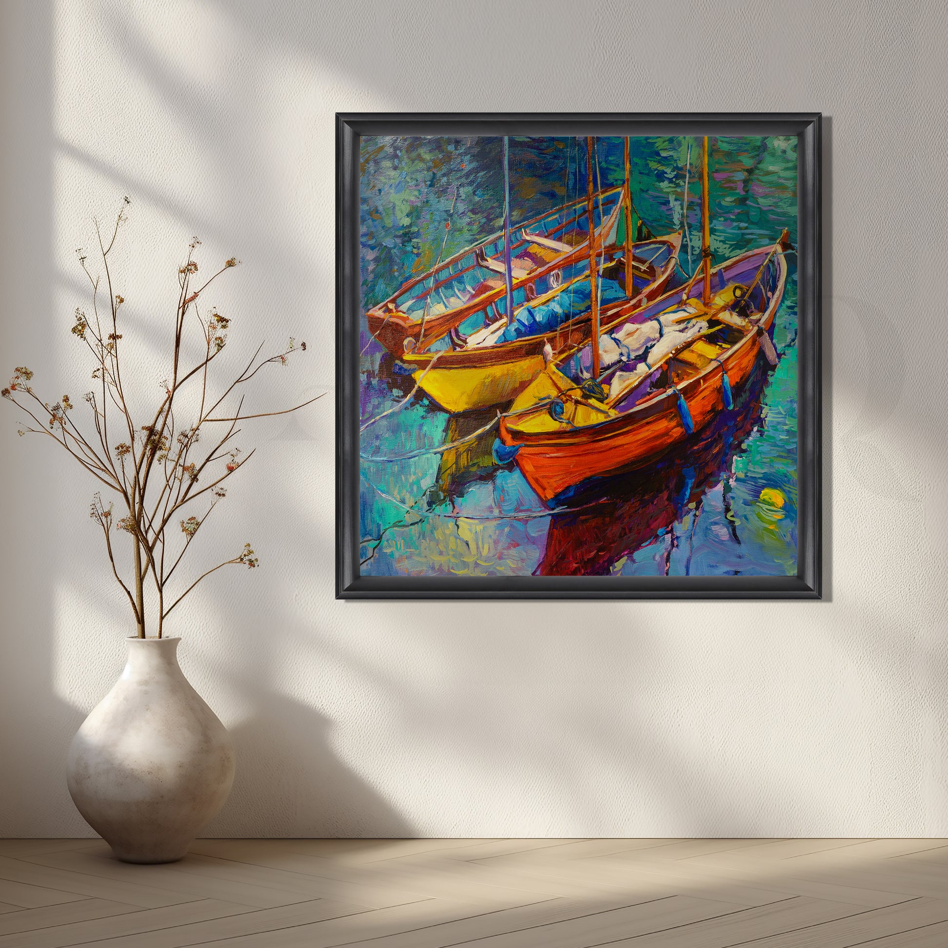 Vibrant Boats Resting on Tranquil Waters in a Colorful Harbor