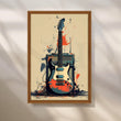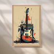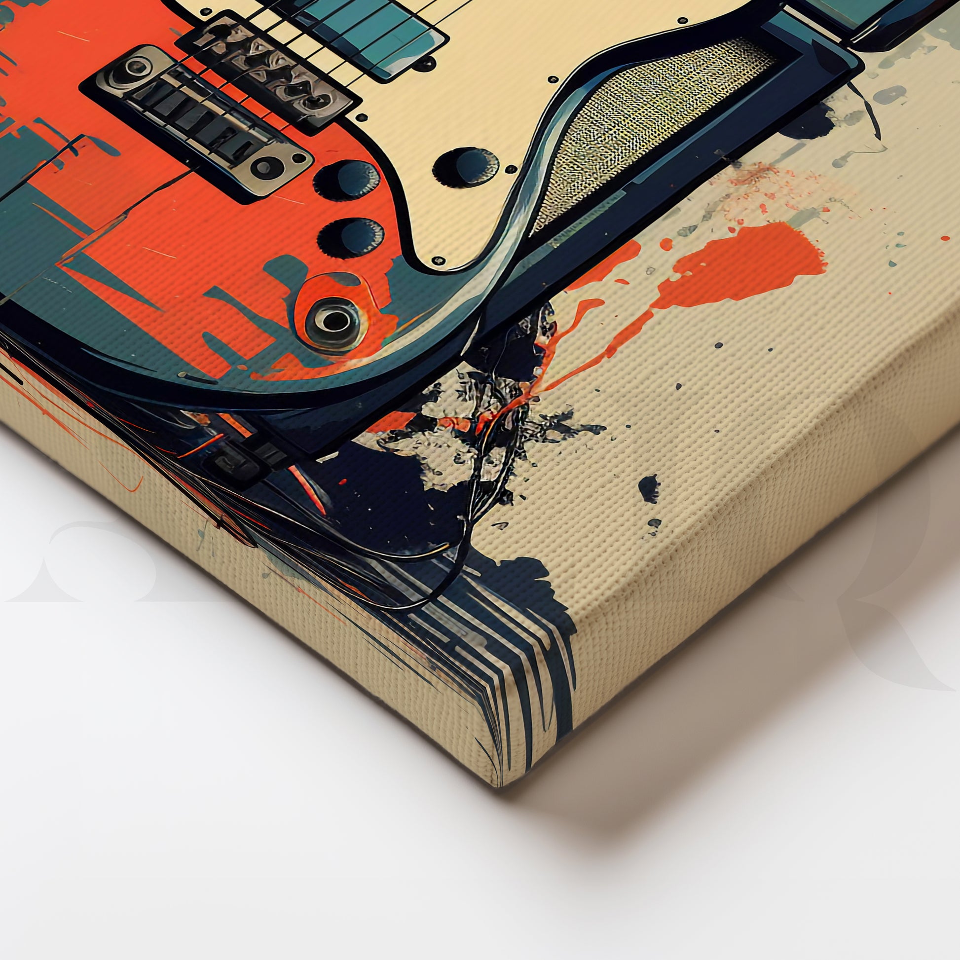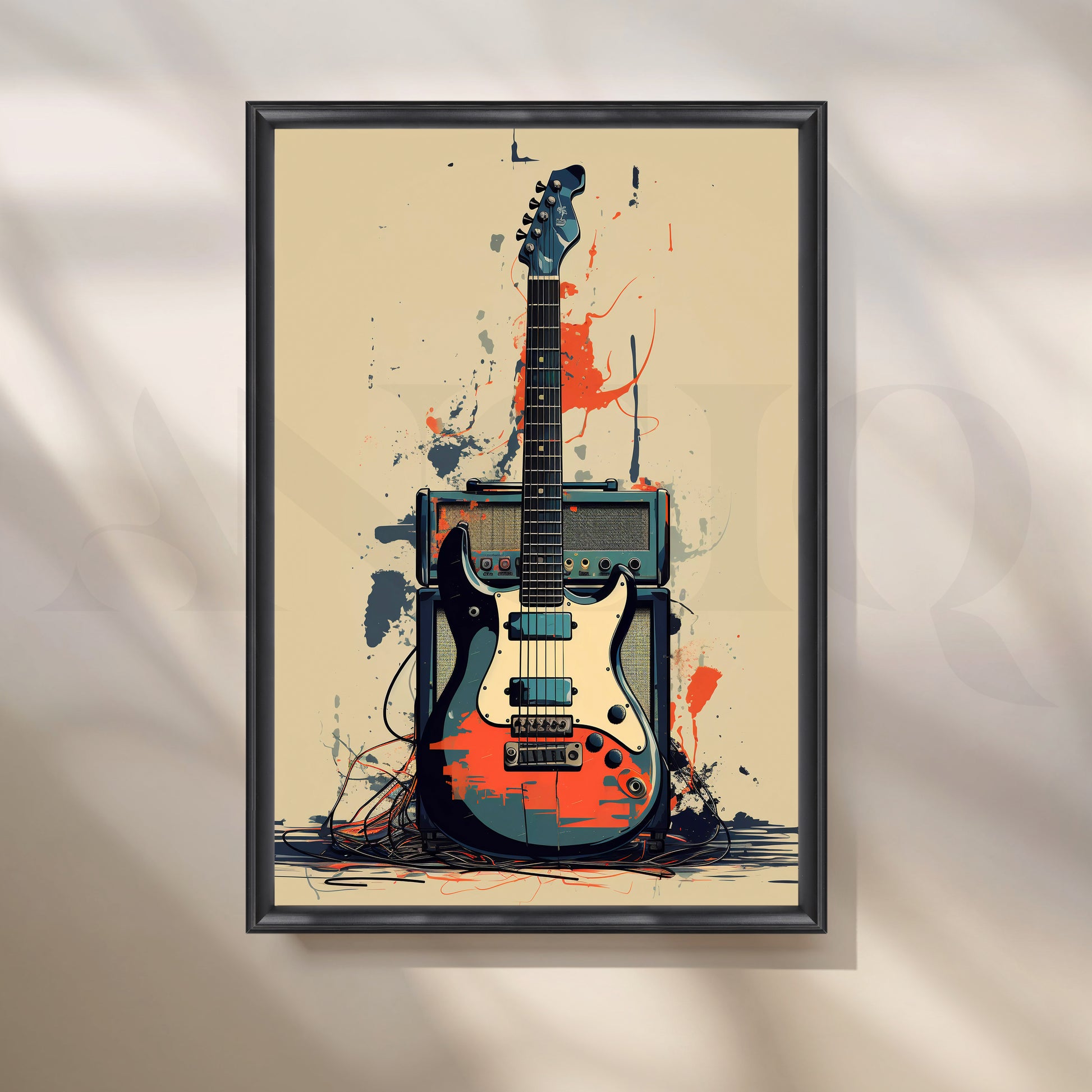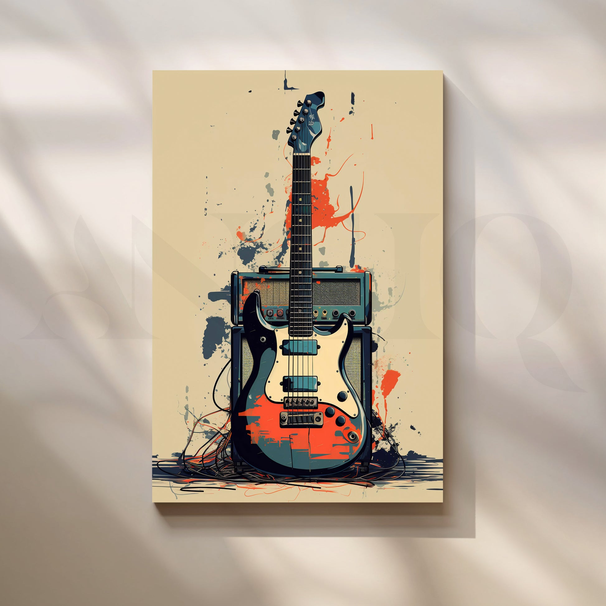 This dynamic modern artwork captures the essence of rock music through the striking depiction of an electric guitar paired with an amplifier. The splashes of bold colors against a neutral background evoke the energy and raw emotion of a live performance. The meticulous detailing of the guitar and the abstract paint splatters combine to create a visually arresting piece, perfect for music enthusiasts and art lovers alike.